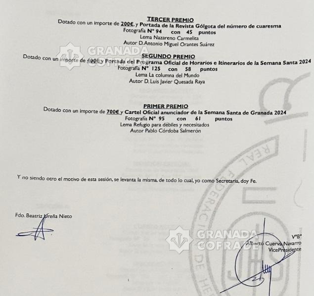 «Me siento muy orgulloso porque la Semana Santa de Granada vale mucho y la espalda de Jesús de la Paciencia me da mucha paz», señaló el galardonado con el primer premio del concurso fotográfico para la elección del cartel oficial, Pablo Córdoba, a nuestra redacción. «Es la primera vez que me me he presentado y he salido ganador, es la suerte de principiante», remarcó. Su instantánea recoge el paso de Jesús de la Paciencia en una visión trasera, situado en calle Jáudenes y teniendo por fondo la Catedral de Granada. «Para la realización de la fotografía utilicé una lente fija de 85 mm y un diafragma con una apertura de 3 – 3,5″ señala en la técnica empleada para la fotografía que » fue mitad preparada y mitad casual puesto que una amiga me pidió esa foto y la hice sin pensar que podría ser cartel oficial».