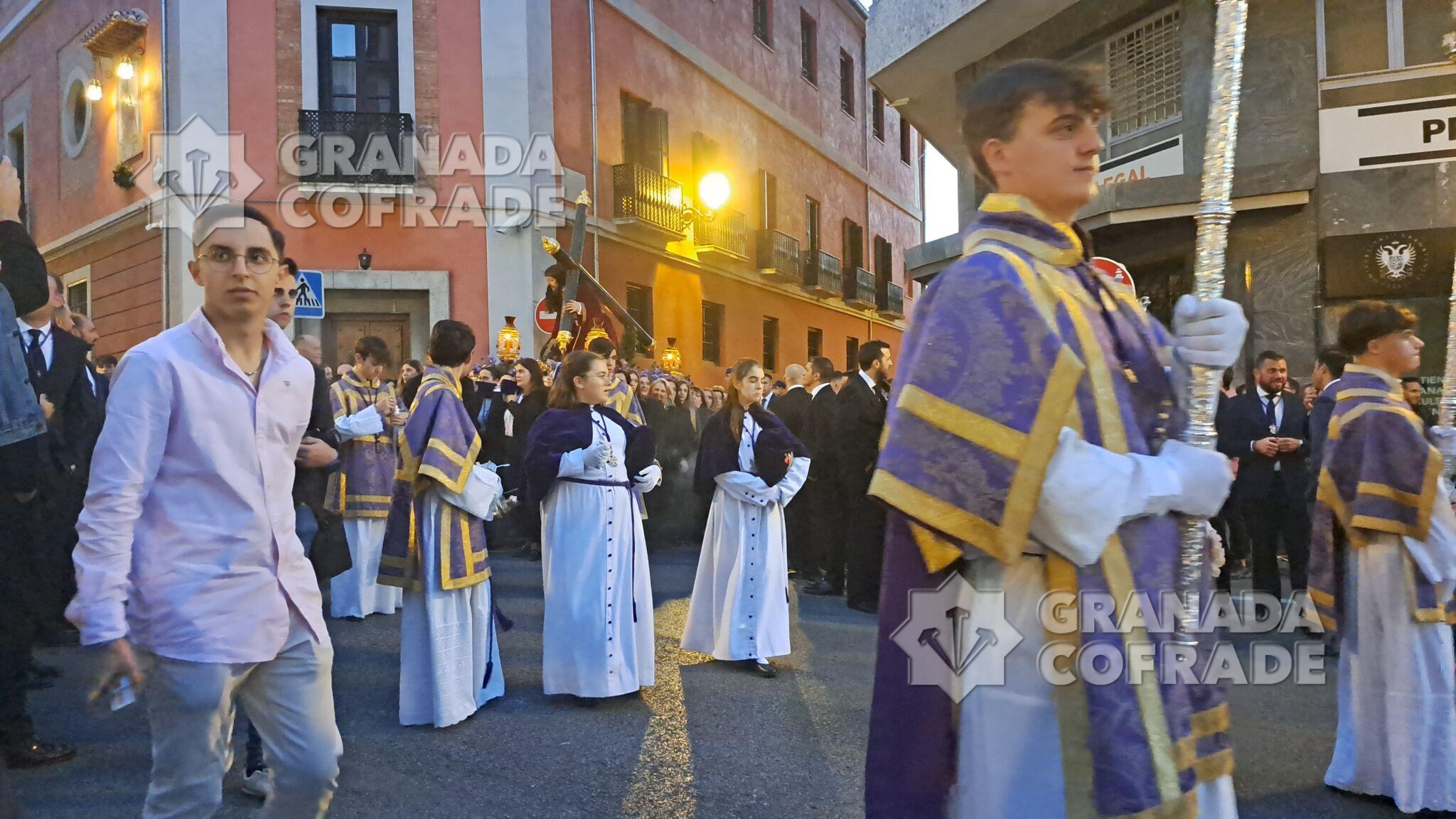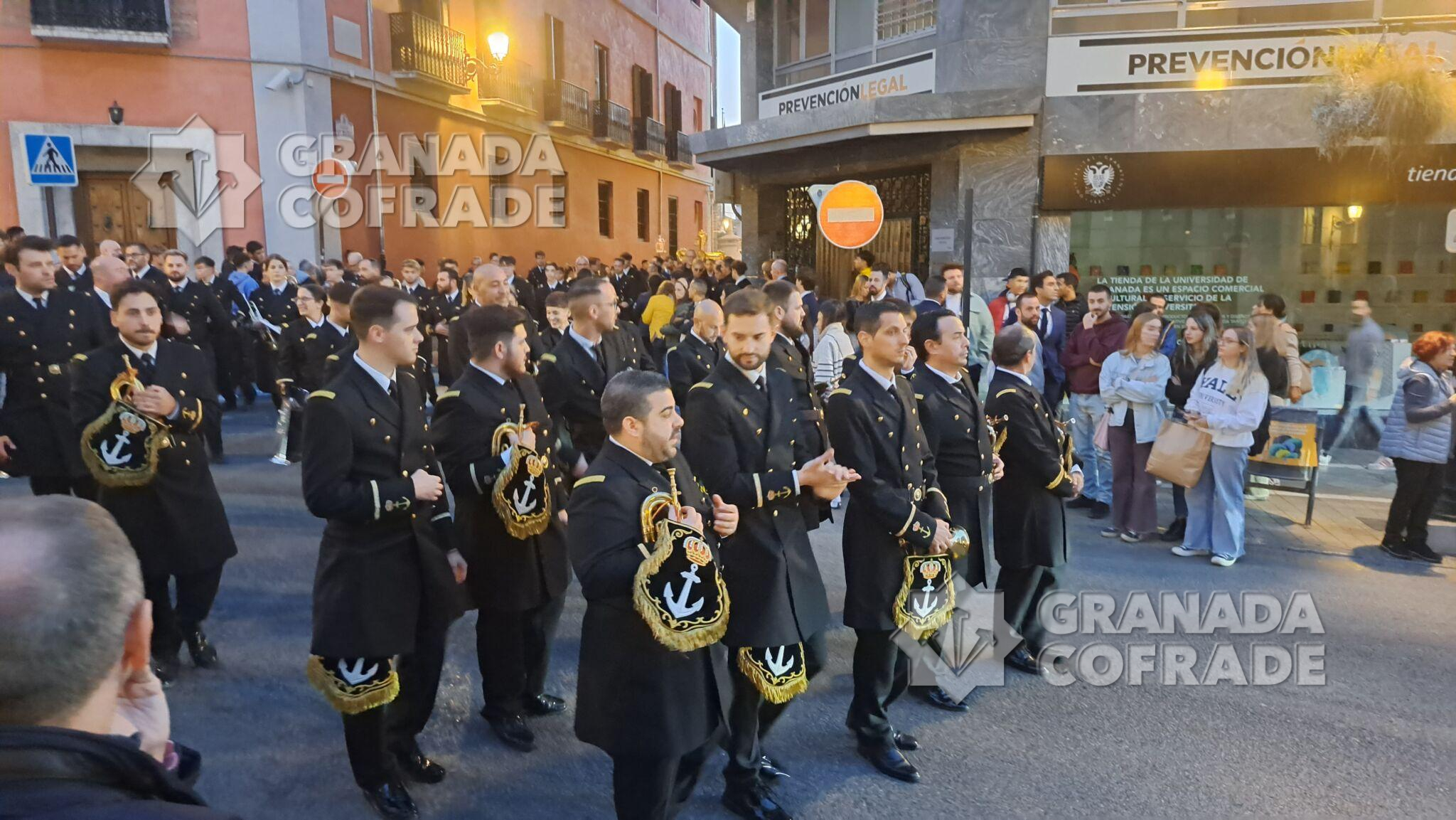 Abría cortejo la banda de tambores y cornetas de Jesús del Gran Poder seguido de la cruz de guía y seis parejas de hermanos. Las andas con Jesús de las Tres Caídas era mandada por Miguel García Almagro y Francisco Estarli. Detrás el segundo tramo con seis parejas de hermanos, presidencia con junta de gobierno presidida por Fernando Coronel, hermano mayor, y las andas de la Virgen del Rosario mandadas por Victor Sabater, cerrando el cortejo la escolta de hermanos mayores anteriores de esta corporación nazarena.