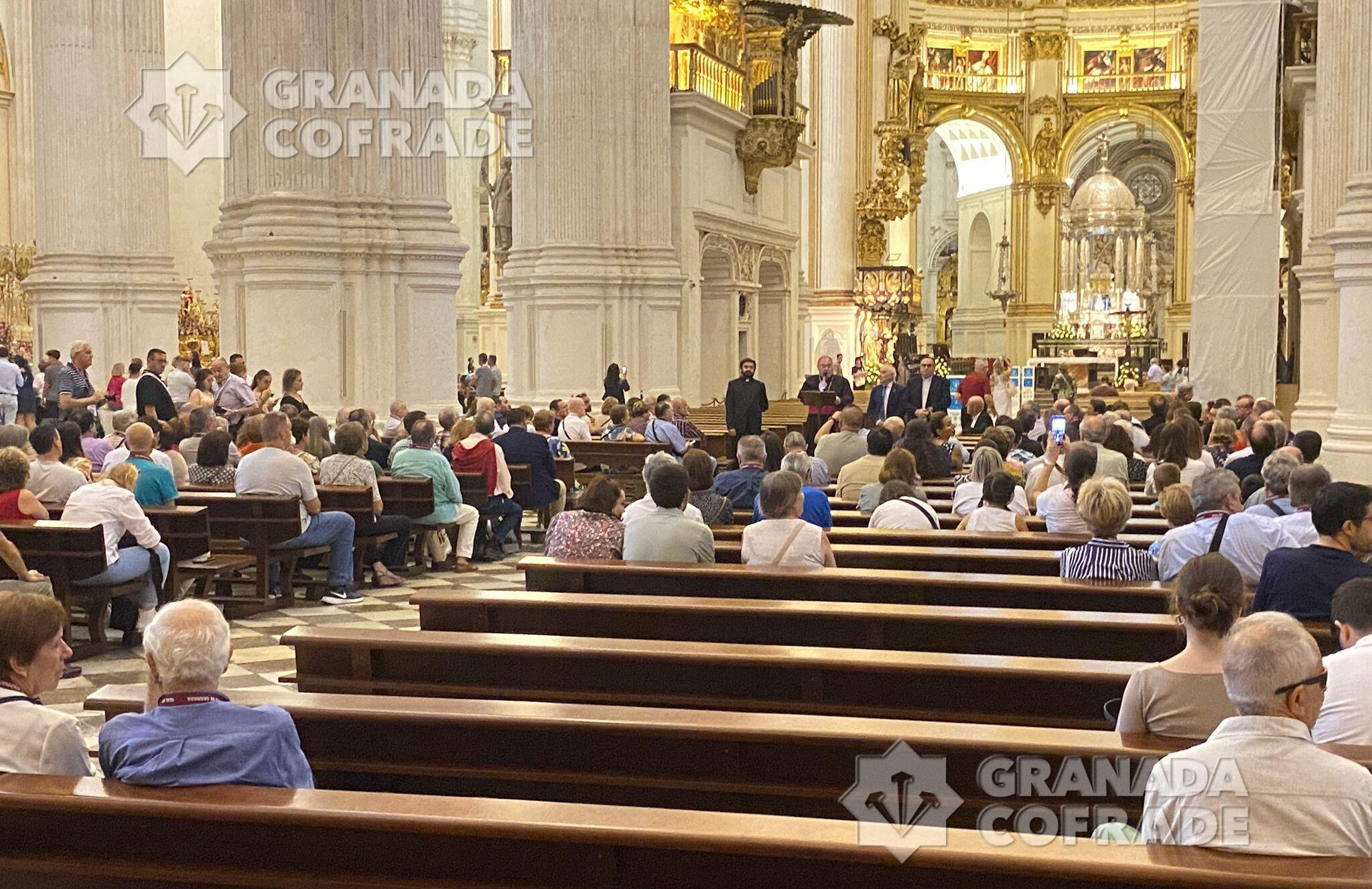 En la tarde de ayer jueves los participantes en el XXXIV Encuentro Nacional de Cofradías que ya se encontraban en nuestra ciudad fueron recibidos por el arzobispo de Granada, monseñor Gil Tamayo en el interior de la Catedral dentro del tiempo de visitas a la exposición de pasos procesionales que se encuentran en la seo granadina.