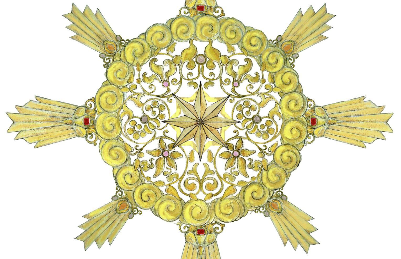 La pieza, de unos treinta centímetros de diámetro, será realizada en plata de ley chapada en oro, con engastería de amatistas naturales, rubíes y berilos incoloros, con toques de esmalte.