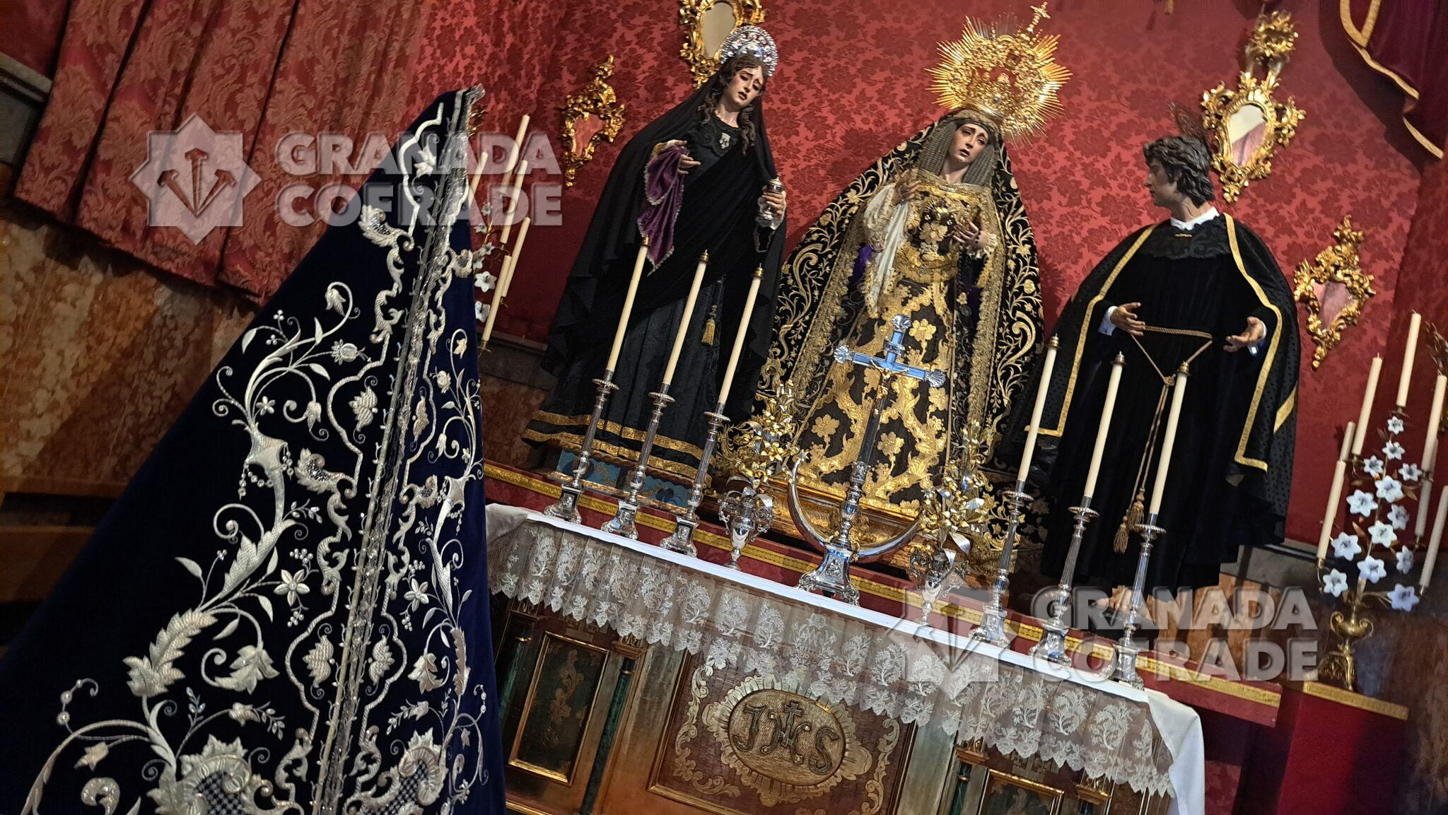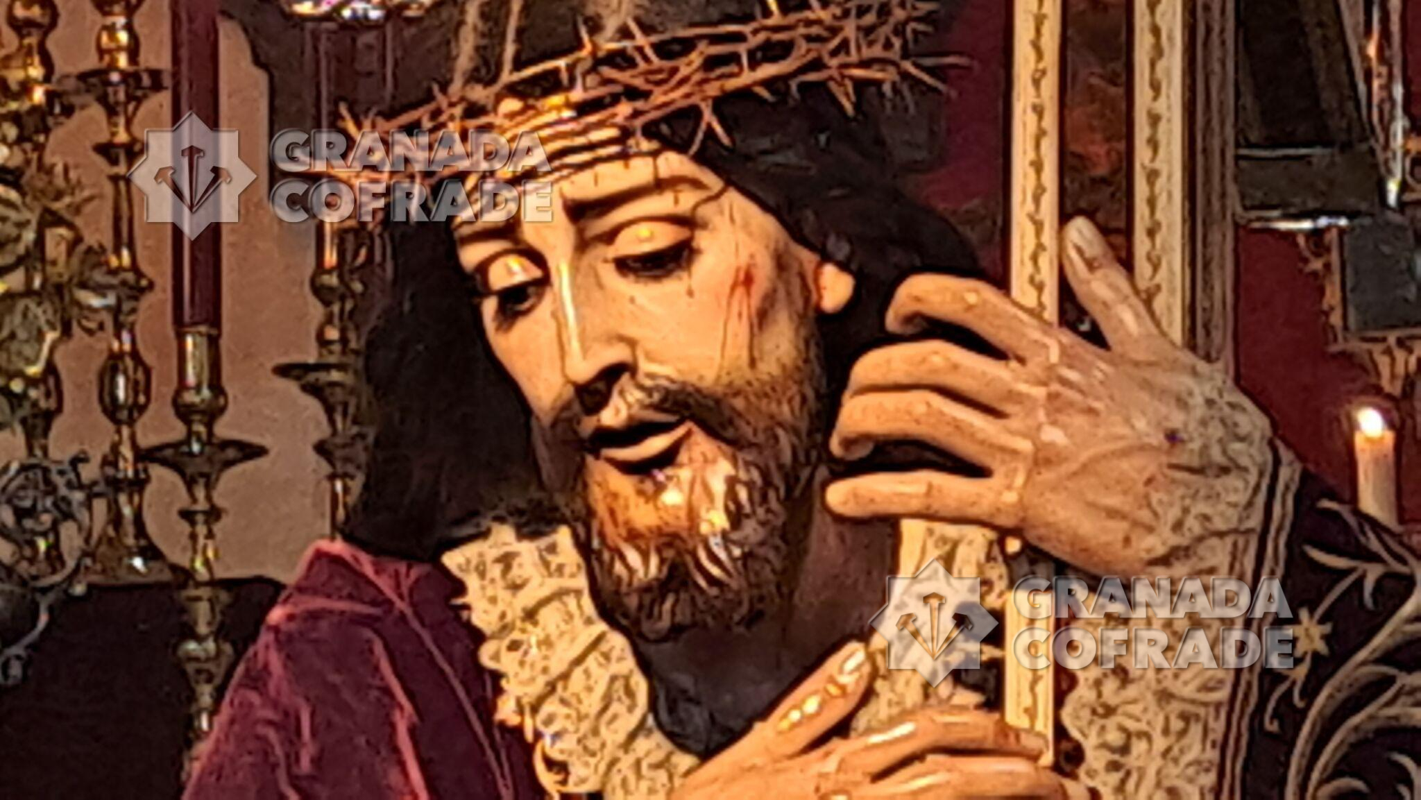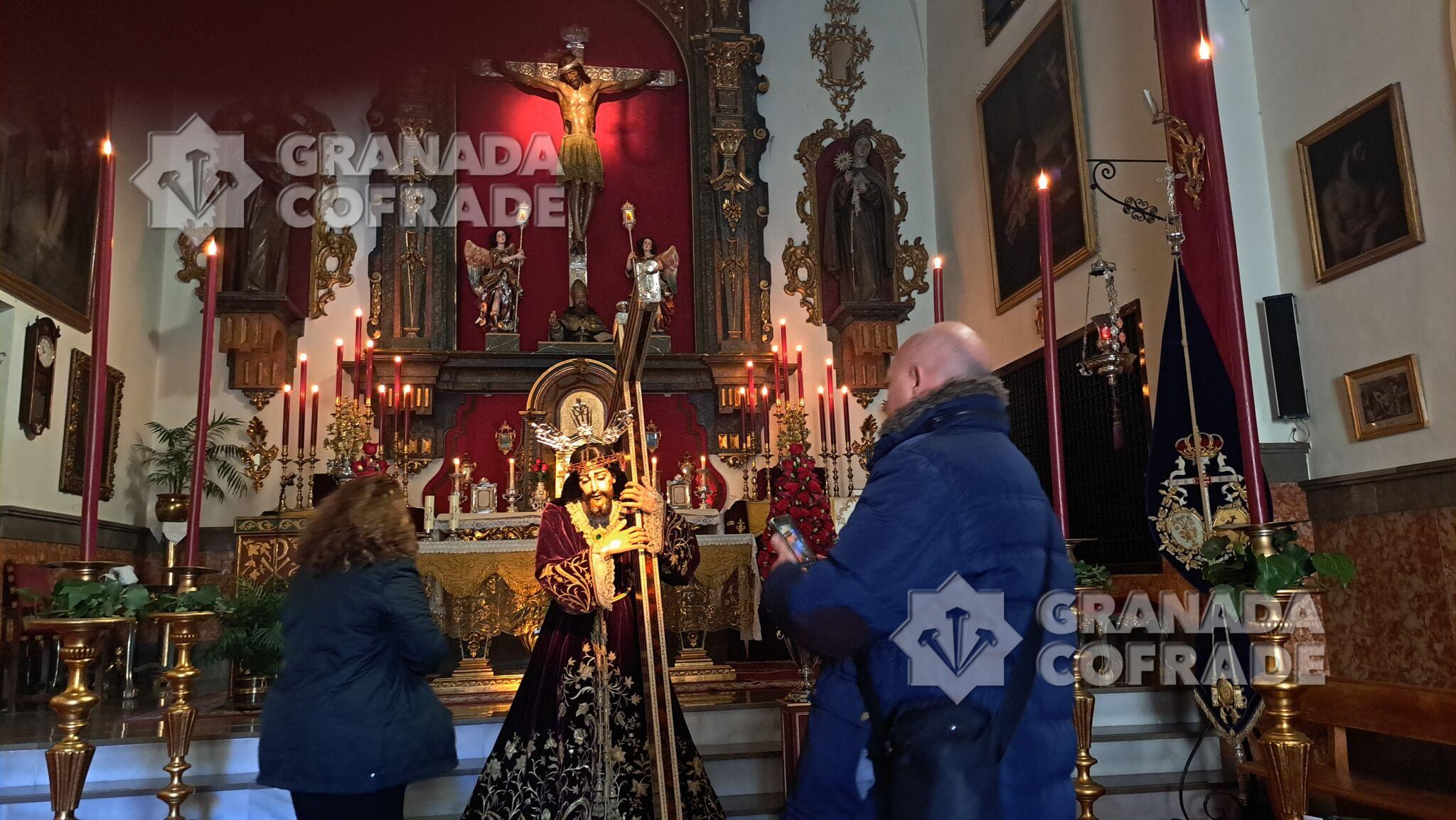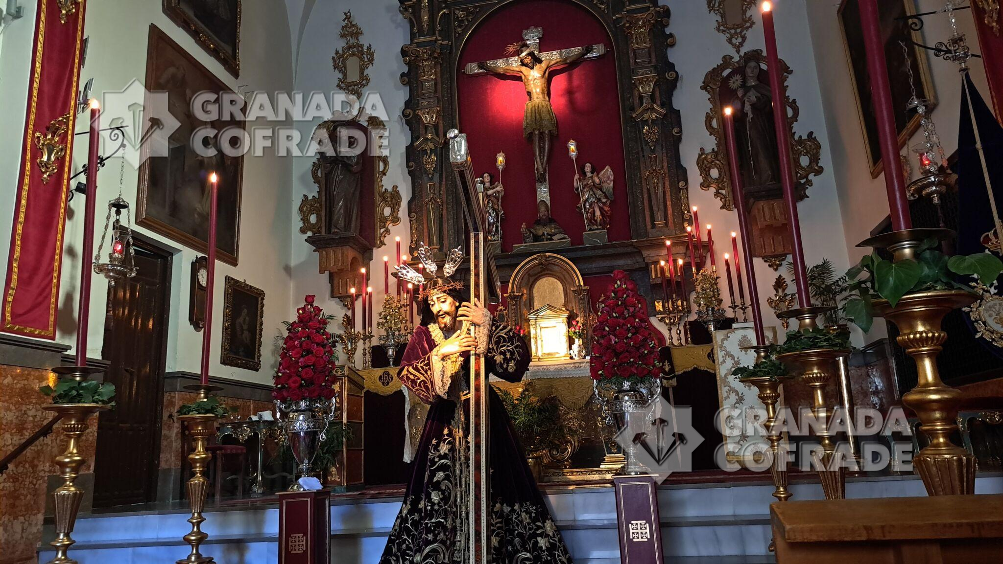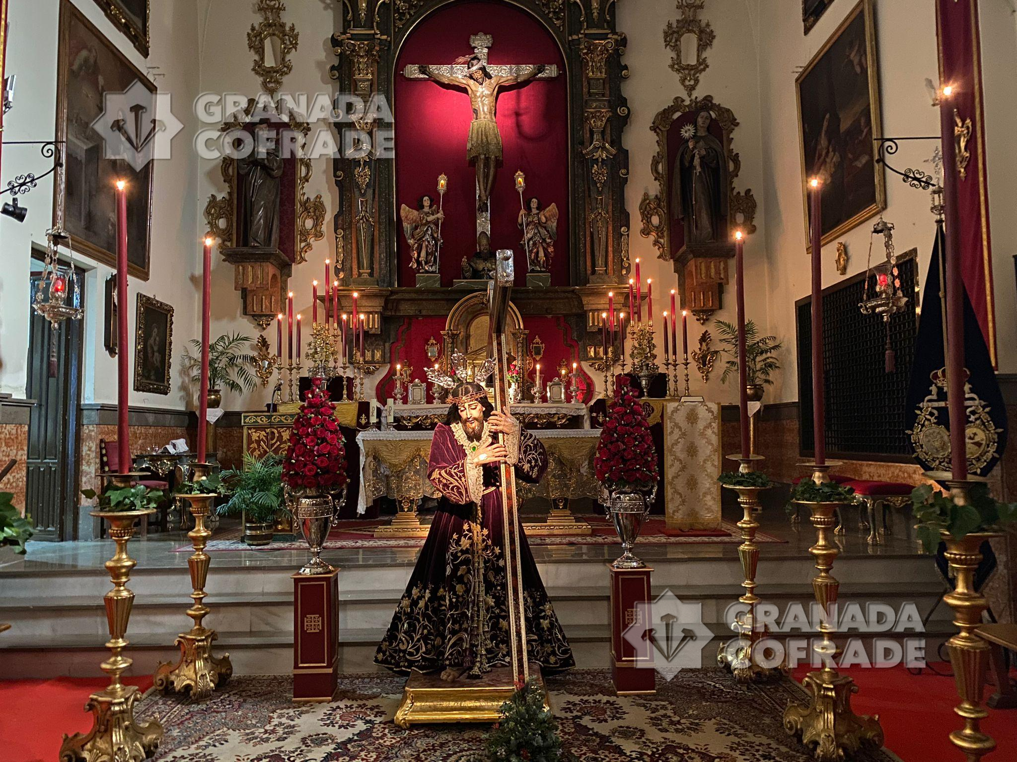 Desde la priostía de la hermandad se había dispuesto un sencillo adorno floral centrado en sendas jarras de rosas rojas a los lados de la imagen del Nazareno de las Penas, que vestía su túnica del XVIII. La imagen es una talla salida de la gubia del granadino Felipe González Santiesteban, último discípulo de Torcuato Ruiz del Peral. Jesús Nazareno estaba custodiado por seis blandones de cera roja. En la capilla de Nuestra Madre y Señora de la Consolación se podía ver también, a los pies de la imagen de la Virgen, San Juan Evangelista y Santa María Magdalena el manto de vistas que, salido del taller del malagueño Sebastián Marchante y donación de un hermano, estrenará el próximo día 8 de diciembre con motivo de la Inmaculada Concepción de María.