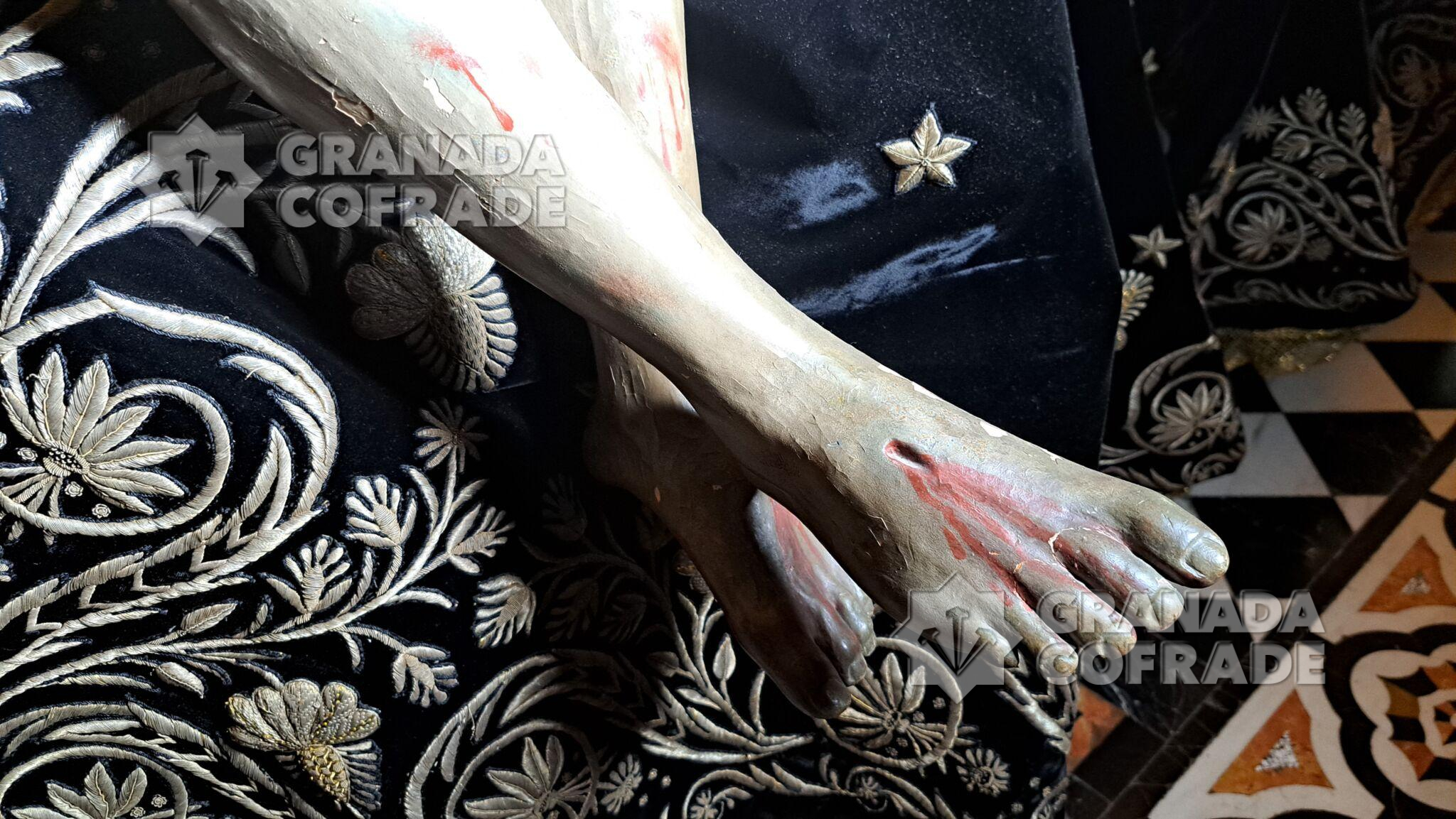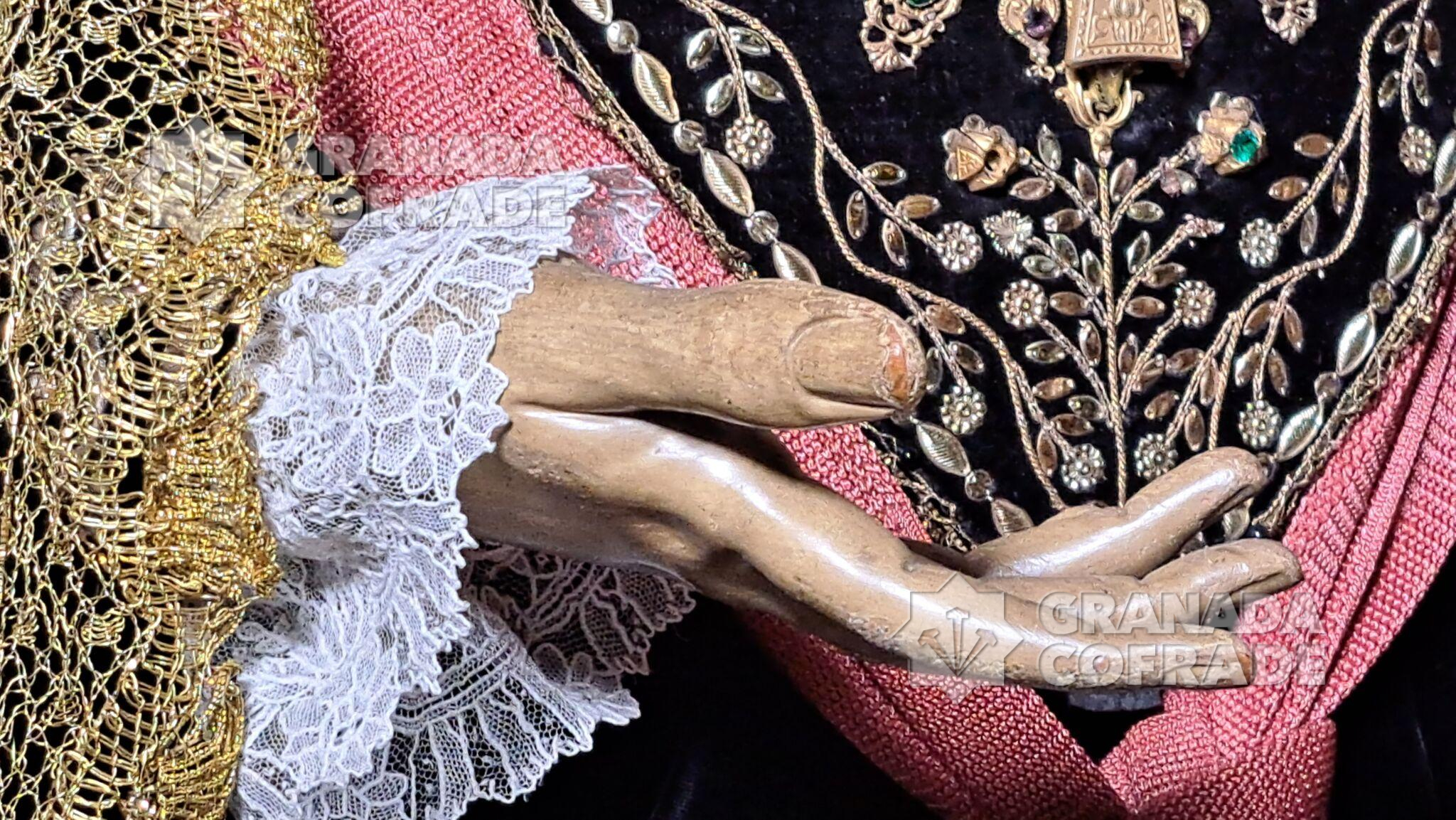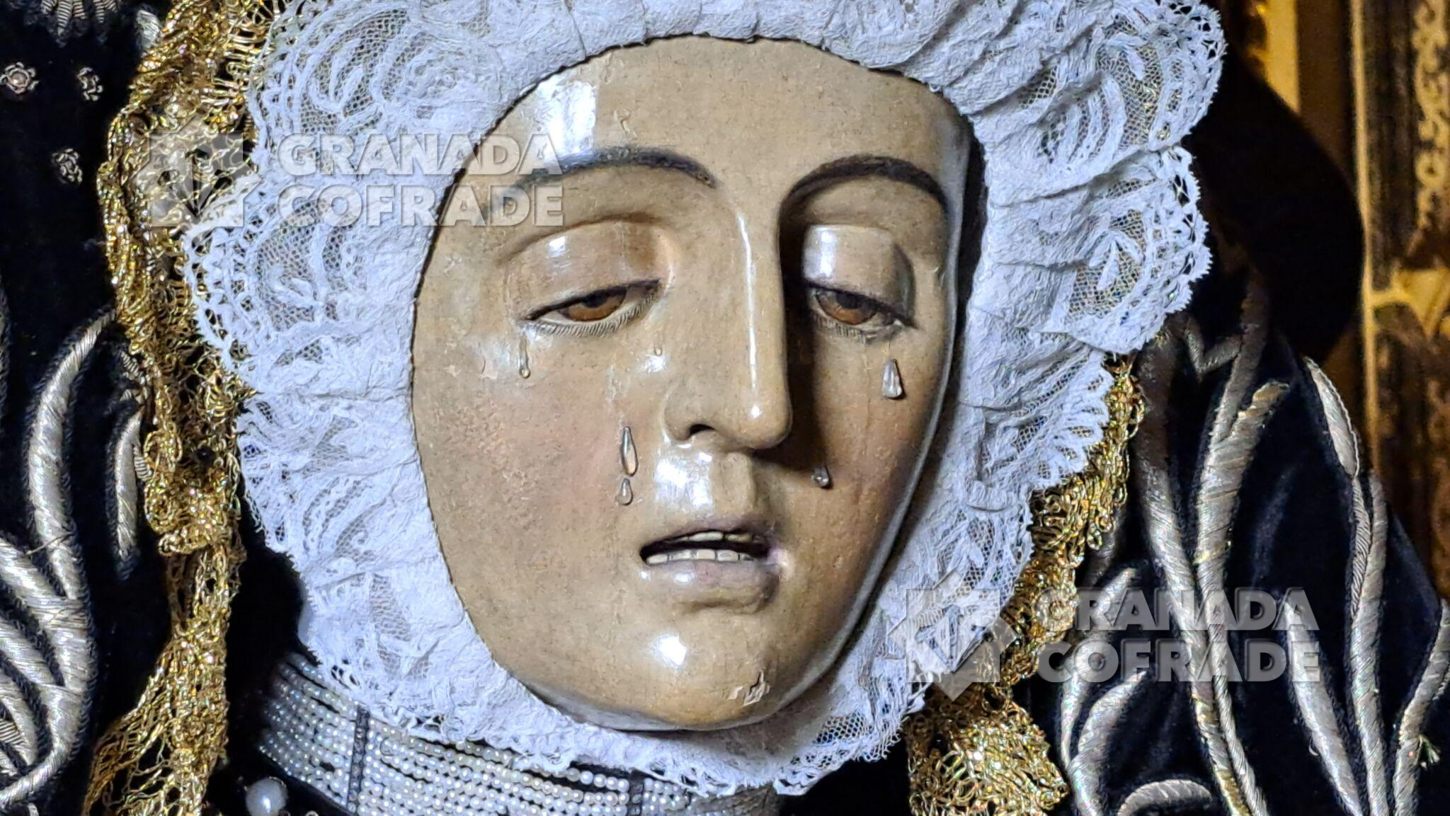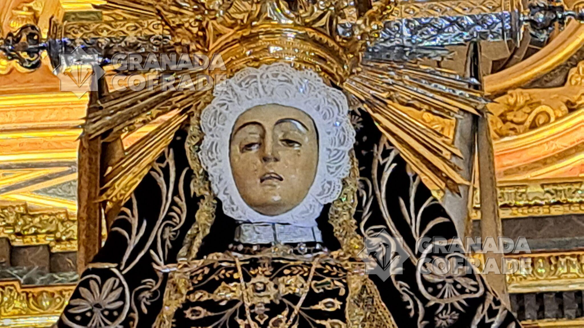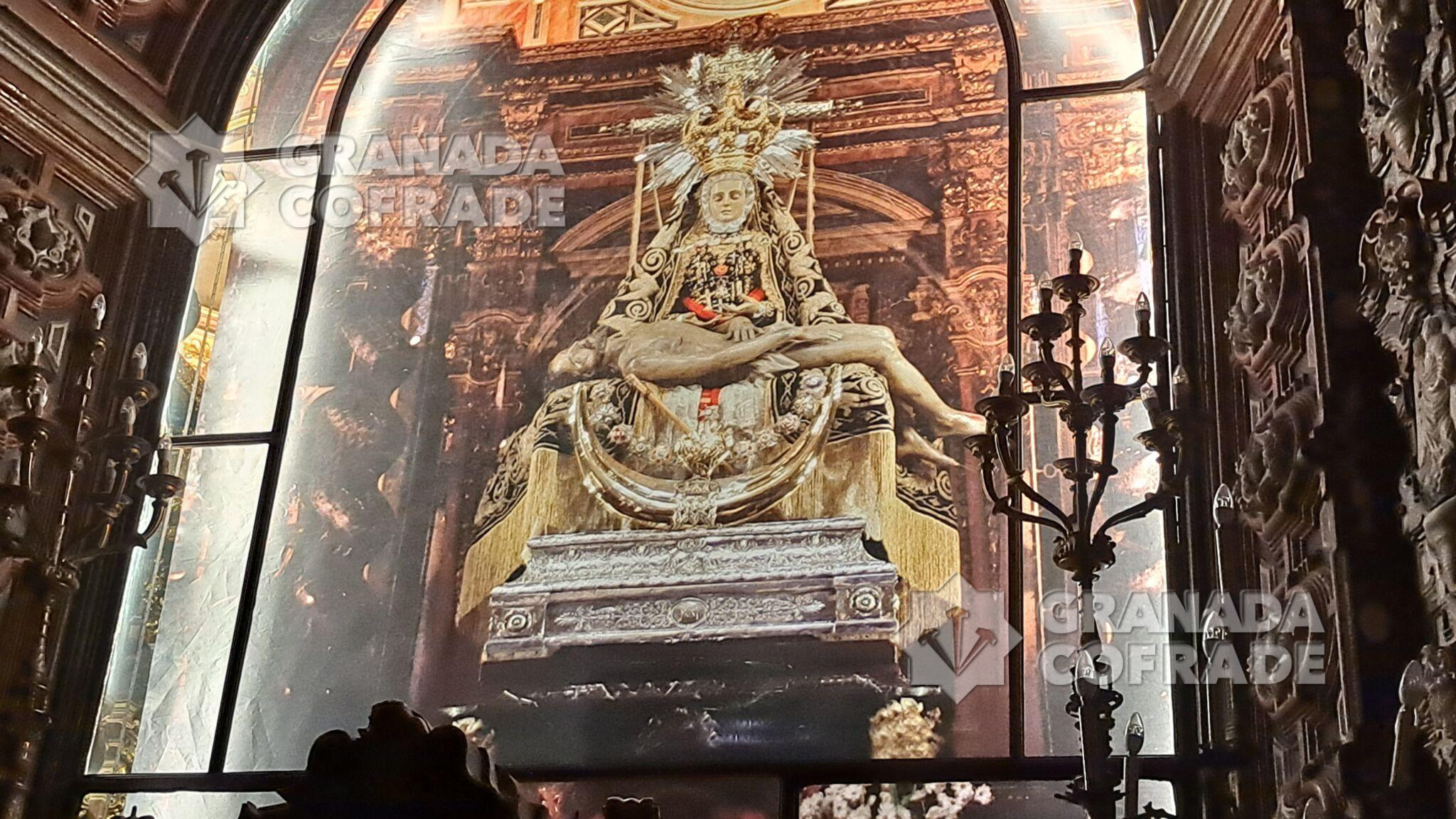 Poco antes de las nueve de la noche de ayer comenzó a subir una lona con la reproducción fotográfica de la Patrona de Granada ocultando tras ella el semblante de la Virgen de las Angustias. Poco a poco fue deslizándose de manera que se cubrió completamente el cristal que separa su estancia privada, su «palacio azul» del resto del templo basilical. Así permanecerá por espacio de unos dos meses y medio, tiempo necesario para que Dionisio Olgoso y su equipo de «Clave Restaura» ejecuten la intervención que «es principalmente necesaria para eliminar algunas lagunas en la imagen, proceder a una limpieza y revisar todas los posibles daños que se hayan producido en la imagen», como indicó hace unas fechas a nuestra redacción el responsable de estos trabajos. La última restauración la acometió el granadino José Barbero Gor en el verano de 1989.