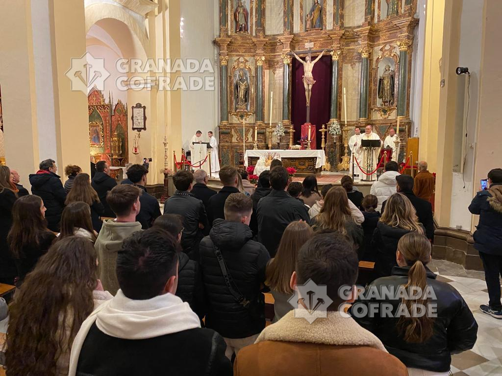 Monseñor José María Gil Tamayo recordó que «vuestro amor a Cristo es fundamental. Si no lo hay no se puede ser cristiano y por supuesto, cofrade», recordándoles a los jóvenes que participar de la vida de una hermandad «no es apuntarse a un club por dos temporadas, tener el carnet y ponerse la camiseta». El arzobispo de Granada estuvo acompañado en la celebración Eucarística por el Delegado Diocesano de Pastoral Juvenil, Luis Miguel López, y el párroco de San José de Calasanz, sede de la cofradía del Santísimo Cristo de la Expiración, Juan Bautista Amat. Monseñor Gil Tamayo realizó una petición especial para que «aumenten las vocaciones sacerdotales, aquí estamos necesitados y no ha desempleo», señaló a los jóvenes asistentes. También les recordó que ser cofrade «lleva la relación personal con Jesucristo y no se sólo esperar a que llegue la Semana Santa».