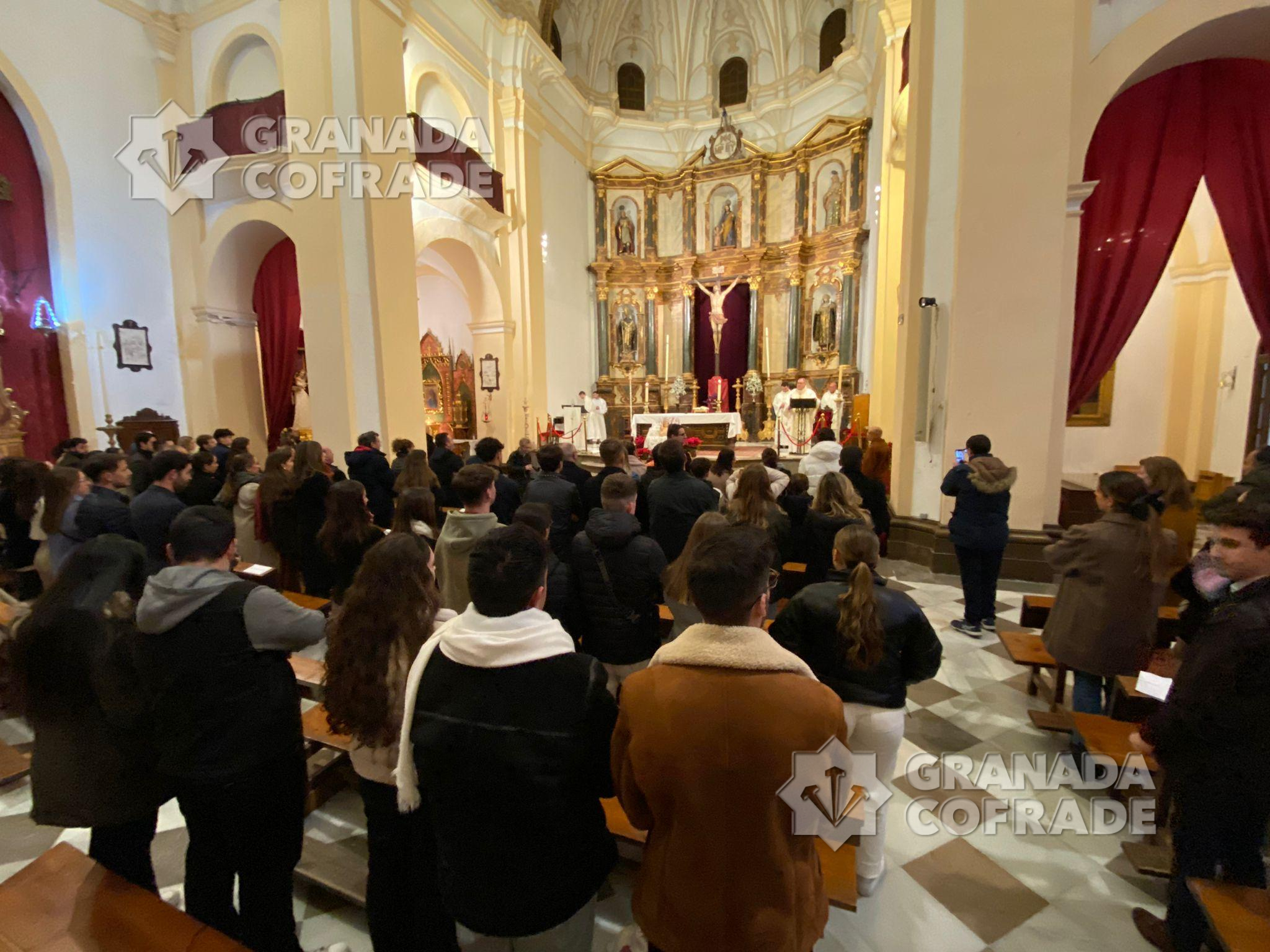 Monseñor Gil Tamayo, Arzobispo de Granada, presidió anoche la celebración de la Eucaristía en el día de San Juan Evangelista, Patrón de la Juventud Cofrade «el más joven de los Apóstoles de Cristo y el que nos dejó uno de los Evangelios que nos relatan la vida de Jesús», como señaló el prelado granadino reflexionando por el sentido de celebrar también los momentos de la Semana Santa en plena Navidad y de seguir al Discípulo Amado, siempre al lado de Cristo. Una celebración muy participativa, convocada desde hace ya más de veinte años por la Federación de Cofradías y que contó con un templo de San José de Calasanz totalmente repleto de jóvenes cofrades que dejaron sorprendido al arzobispo quien agradeció a los jóvenes su participación «pues no siempre se ve un templo lleno así». El arzobispo Gil Tamayo señaló que «nos nos podemos quedar en el Jesusito de mi vida, Tenemos que tener una Fe grande en el Señor, que cuente e importe en nuestra vida», argumentando que si no se da en la vida «también a través de la intermediación de una imagen nos acercamos al misterio de un Dios que se ha hecho Carne, que llora, que dice la verdad con valentía» refiriéndose al Evangelio y a las lecturas de la jornada.