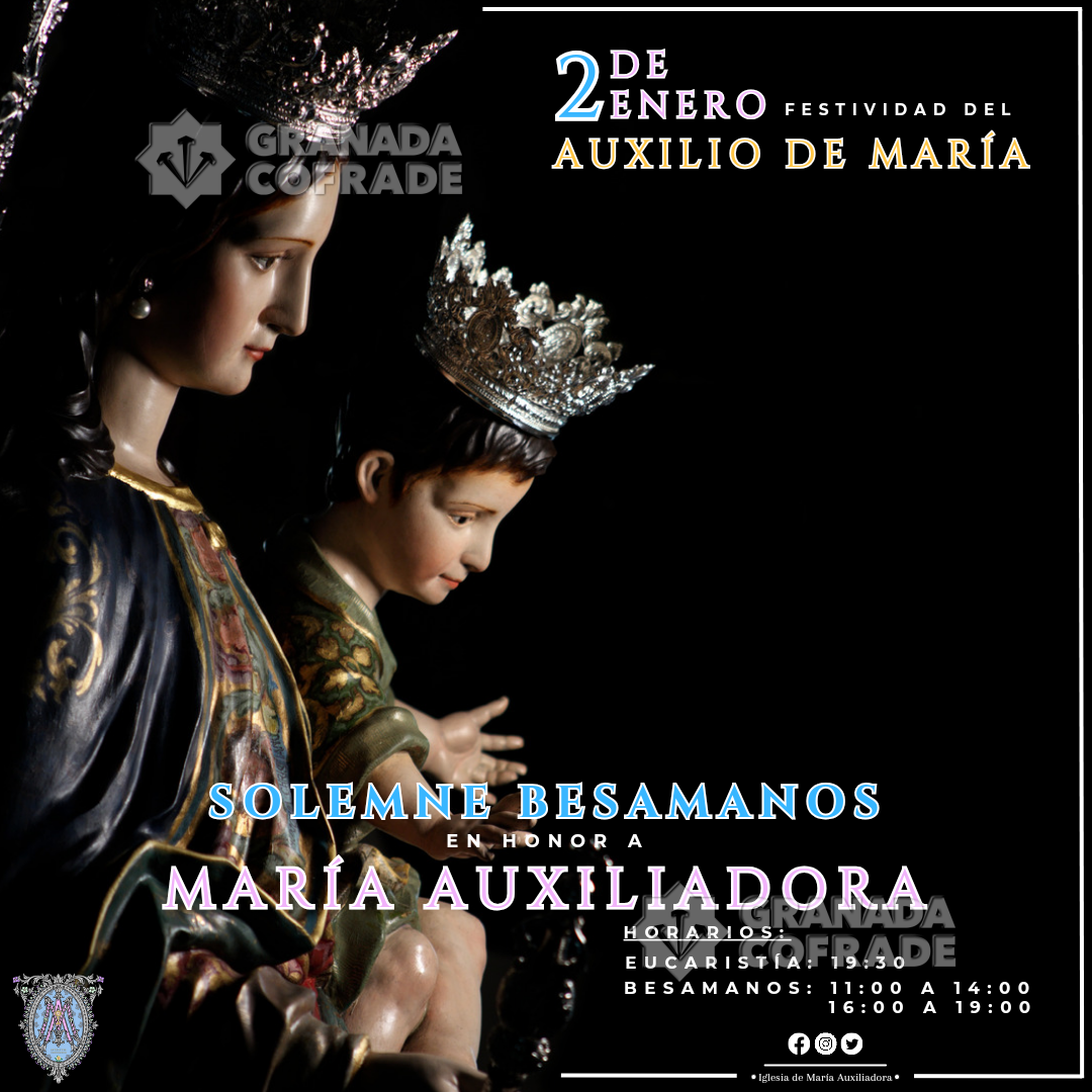 La Adma- Zaidín celebrará el martes día 2 de enero un Solemne Besamanos a María Auxiliadora, con motivo de la festividad del Auxilio de María en Granada. Esta celebración de memoria obligada en la Diócesis de Granada se convoca con ocasión de la liberación de Granada por los Reyes Católicos. El viernes 2 de enero de 1492, a las tres de la tarde, hacían su entrada en Granada los Reyes Católicos. En las actas de erección de las catedrales de Granada, Guadix y Almería, del 21 de mayo de 1492, se ordena que todos los miércoles del año un canónigo celebre misa «De la exaltación de la santa fe, en la rendición de la ciudad de Granada». El Papa S. Pío X concedió que se celebrara esta misma fiesta bajo la advocación de Ntra. Sra. Auxilio de los Cristianos.