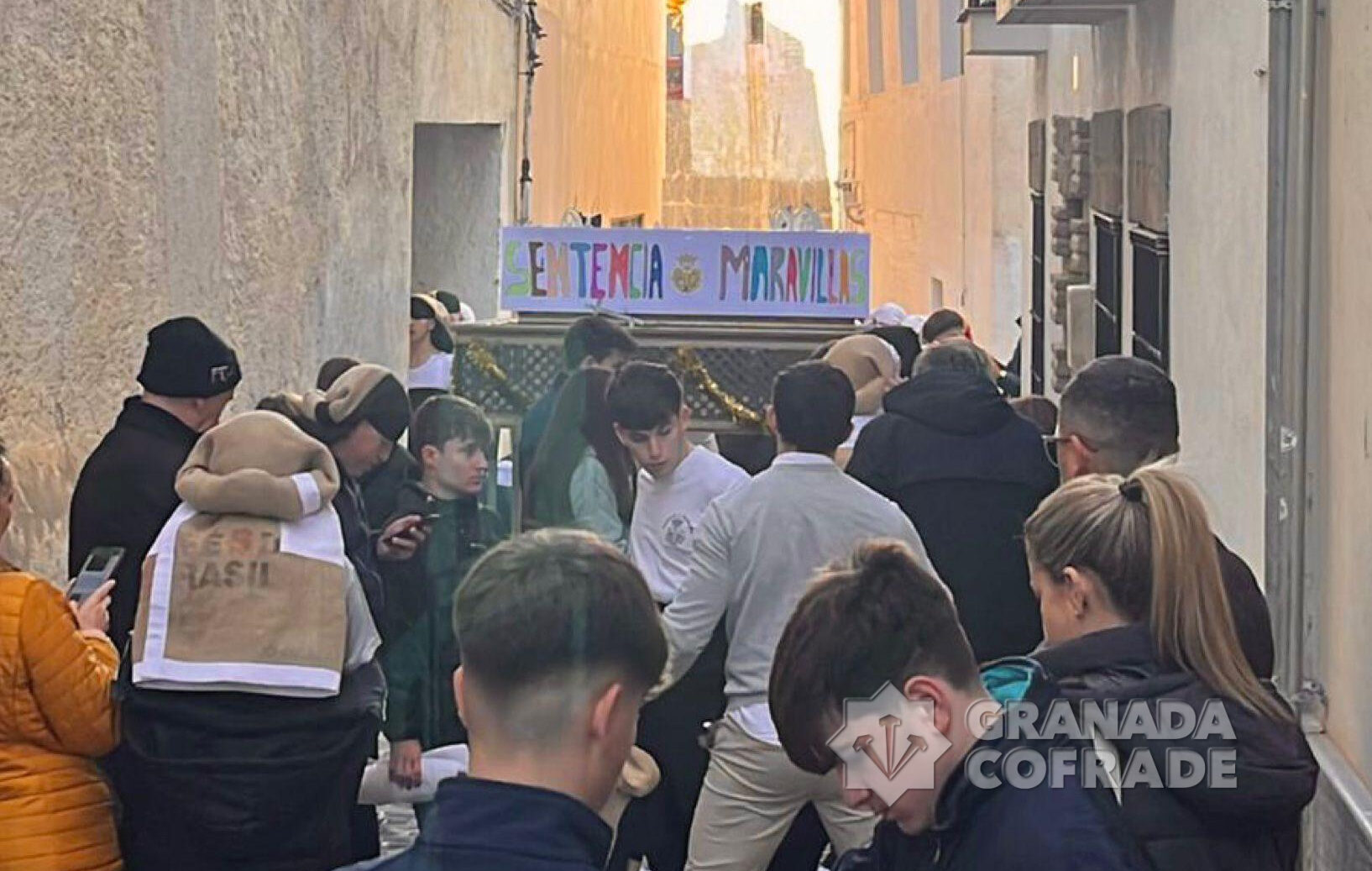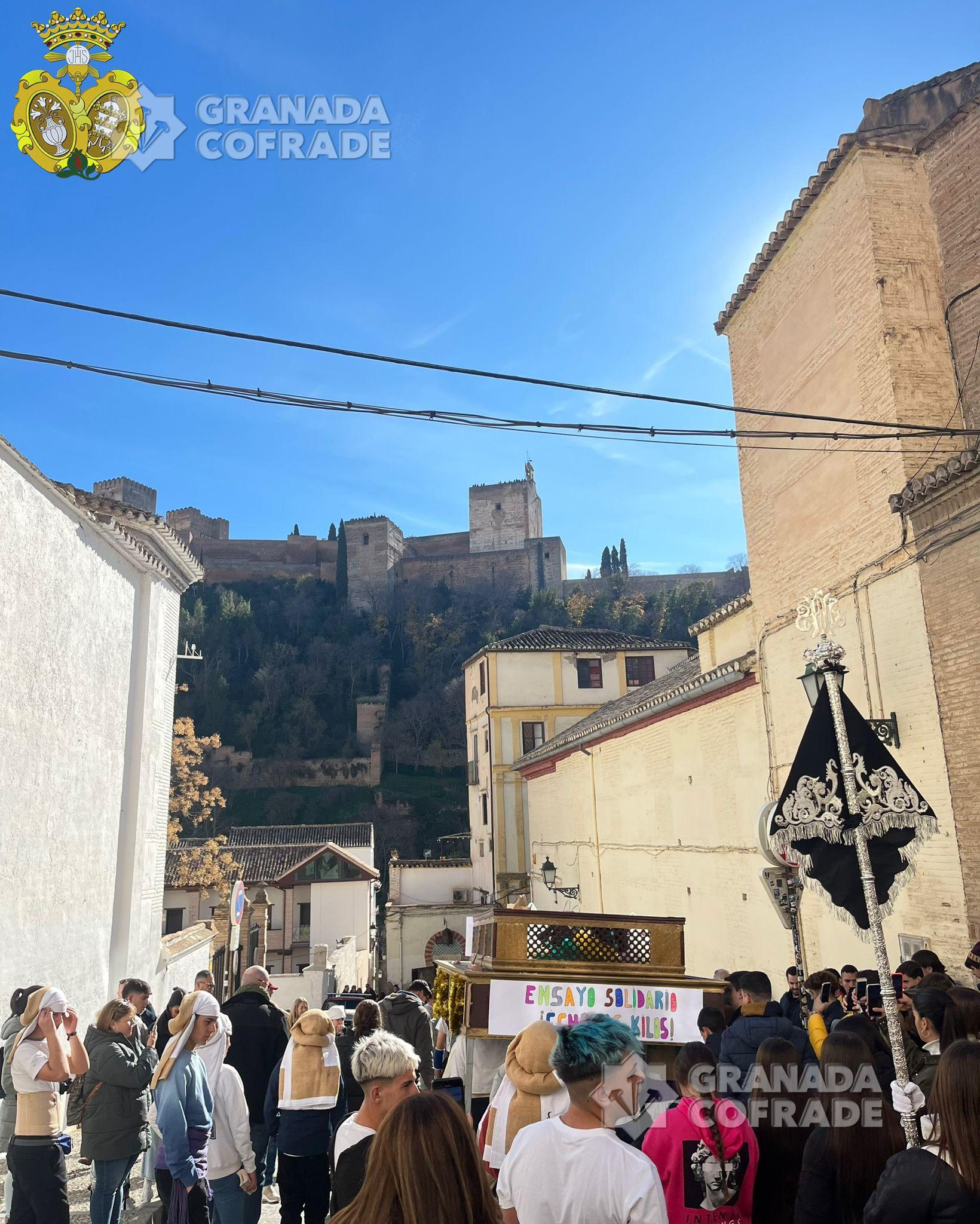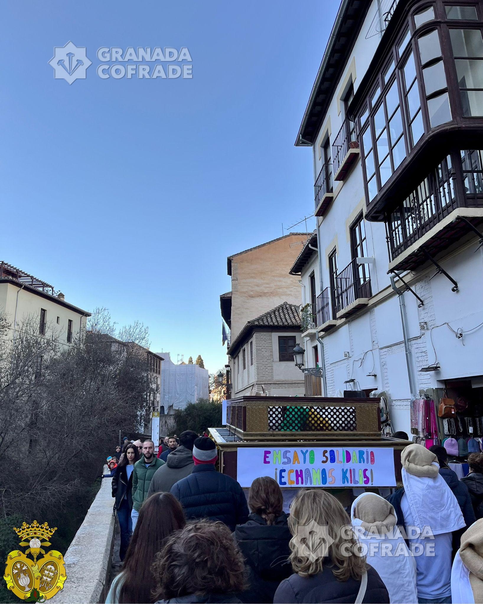 Intensa mañana la vivida por las calles del barrio de San Pedro el pasdo domingo 17 de diciembre durante el primer ensayo solidario del Grupo Joven de las cofradía de las Maravillas. Más de 40 jóvenes de entre 14 y 17 años acudieron a esta cita a temprana hora para la confección de la igualá de este ensayo tan especial que daba comienzo a las 11:00 h desde las inmediaciones del Convento de Zafra con el acompañamiento de la Agrupación Musical «La Fe» de Granada, siguiendo por una Carrera del Darro y Plaza Nueva que empezaban a llenarse de turistas que preguntaban el motivo del mismo, sumándose muchos con su donativo a la causa.