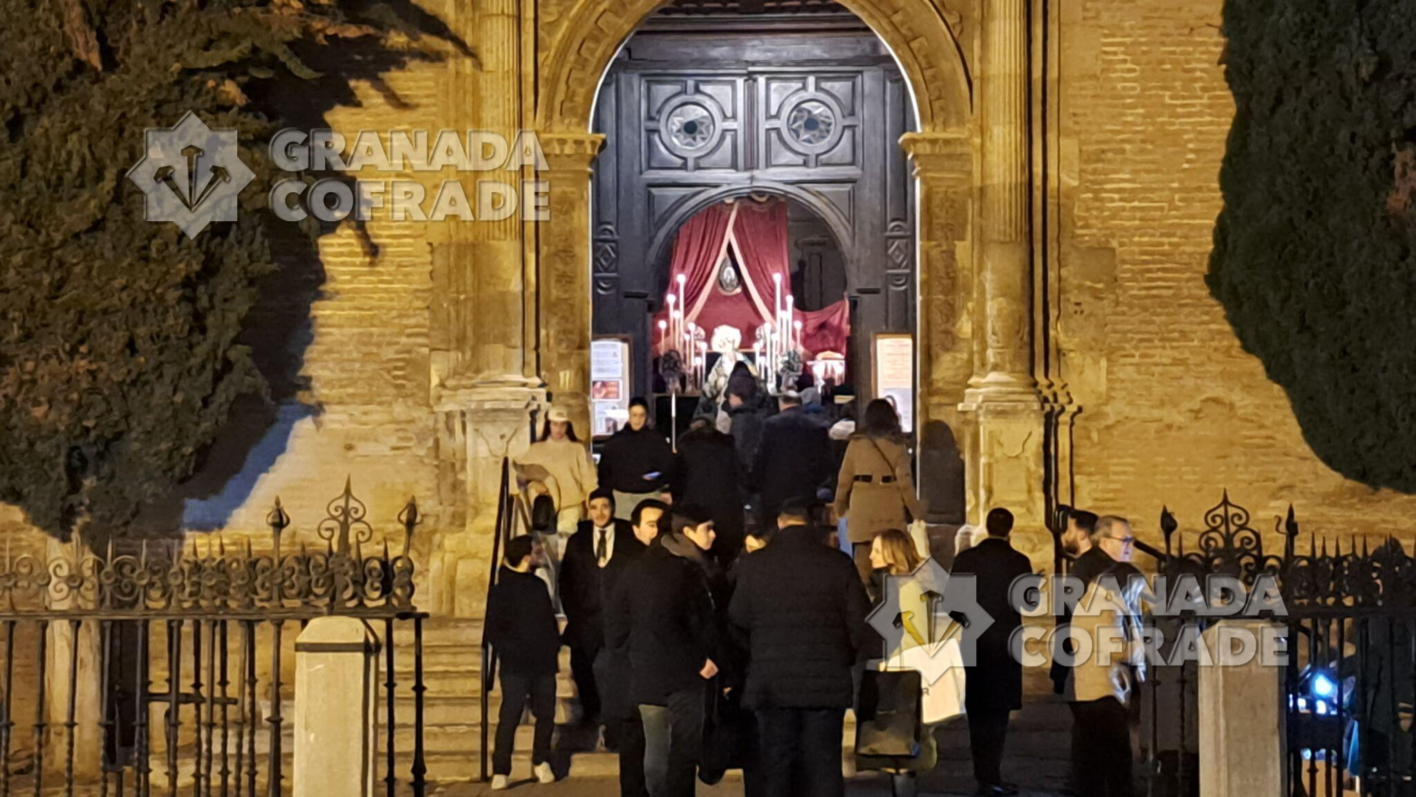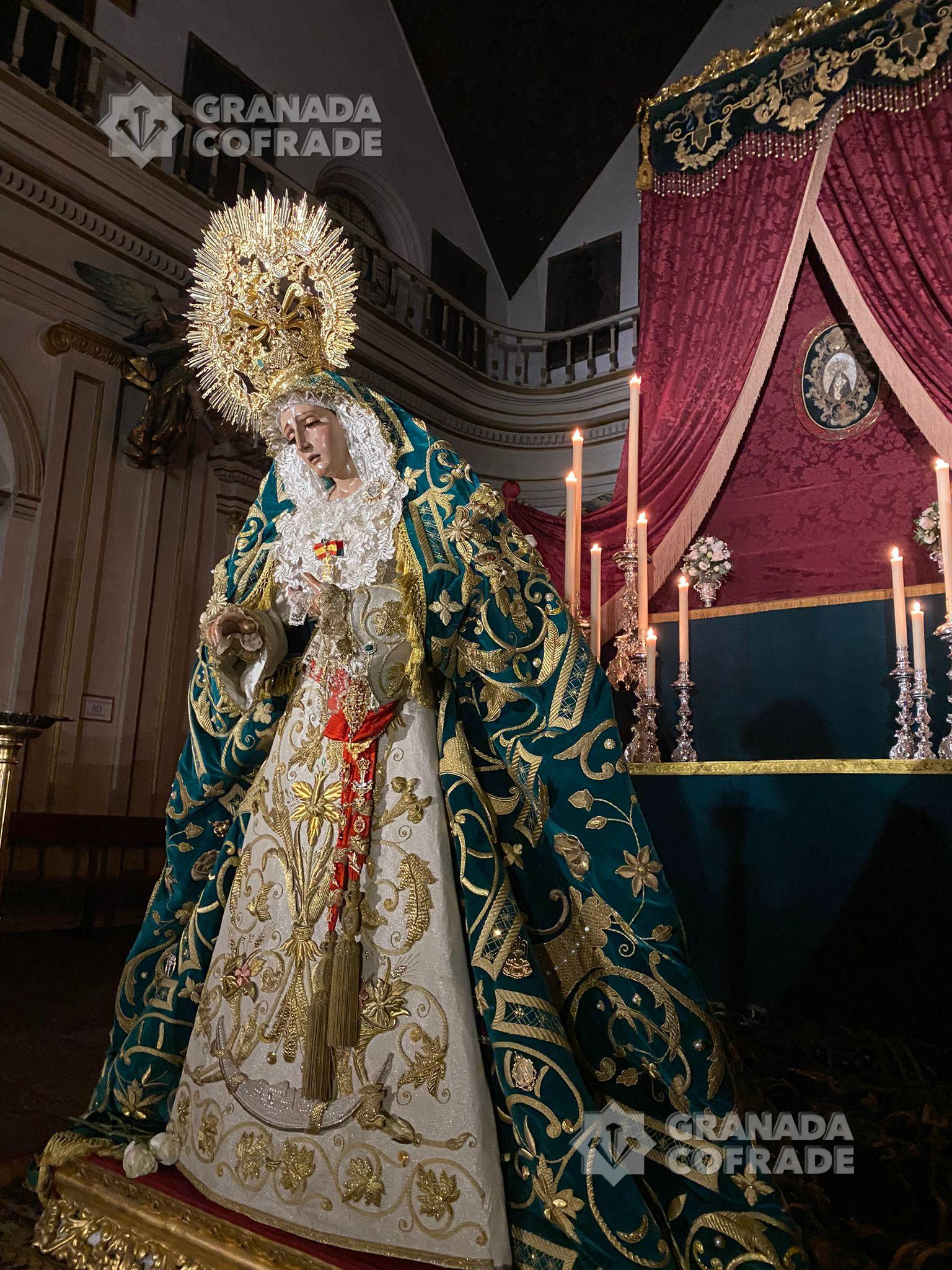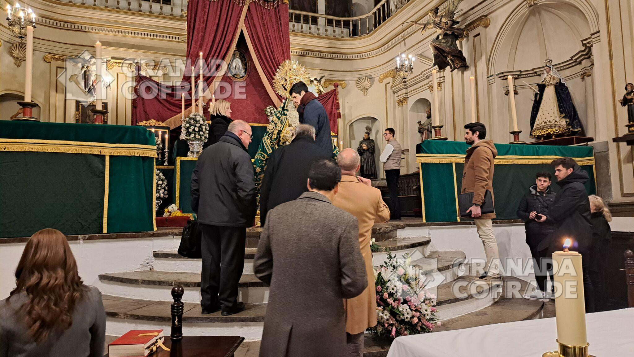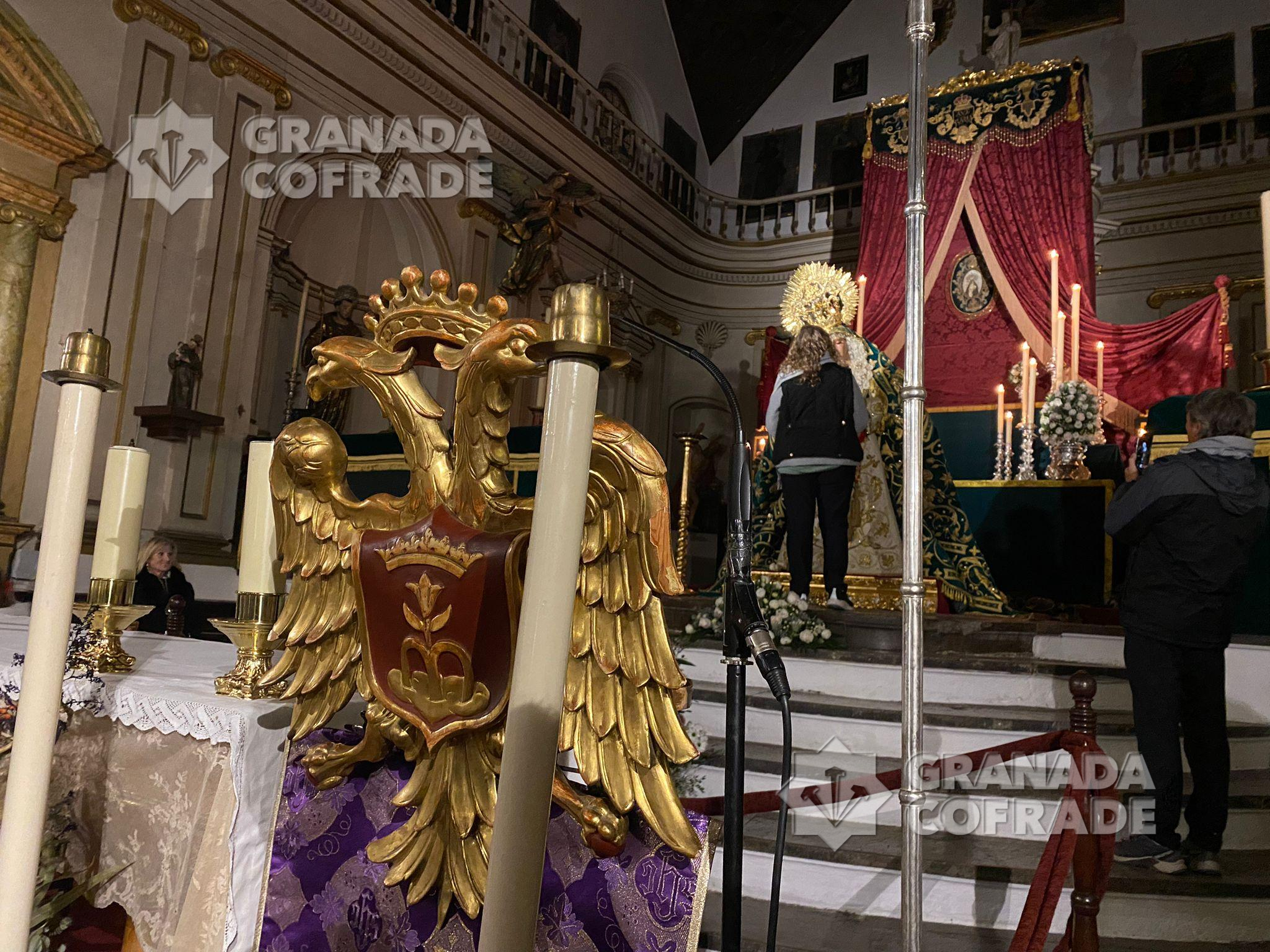 En la parroquia de San Gil y Santa Ana se dieron cita hermanos y cofrades durante la jornada de ayer para venerar y besar la mano de Nuestra Señora de la Esperanza en su festividad litúrgica. Una celebración en la que se presentaba a la Virgen de la Esperanza a los pies del tabernáculo de la parroquia, vistiendo el manto de salida de manera muy elegante. En su cinturilla, el Niño Dios, símbolo de la Esperanza que está por llegar y se nos mostraba también custodiada por paños de cera y bajo dosel de tejido granate adamascado y centrado el primitivo óvalo central del paso de palio de la Virgen de la Esperanza. A última hora de la tarde la cola formada por devotos y cofrades para besar su mano se extendía a lo largo de todo el templo de la plaza de Santa Ana de nuestra ciudad.