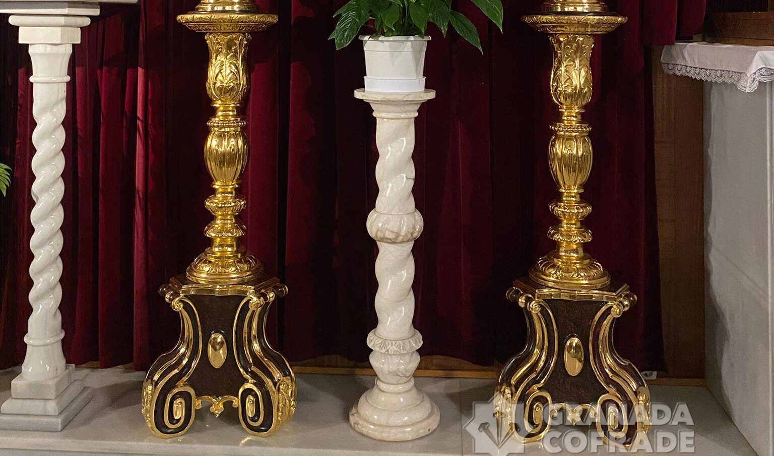 La cofradía de la Sagrada Lanzada estrenó ayer cuatro blandones para el altar mayor del templo y que fueron estrenados en la jornada de ayer, con motivo de la celebración de la solemnidad de la Inmaculada Concepción. Estos blandones han sido creados a partir de los antiguos hachones que formaban parte del paso de misterio de Ntro. Señor Jesucristo en su Sagrada Lanzada y que flanqueaban sus esquinas.