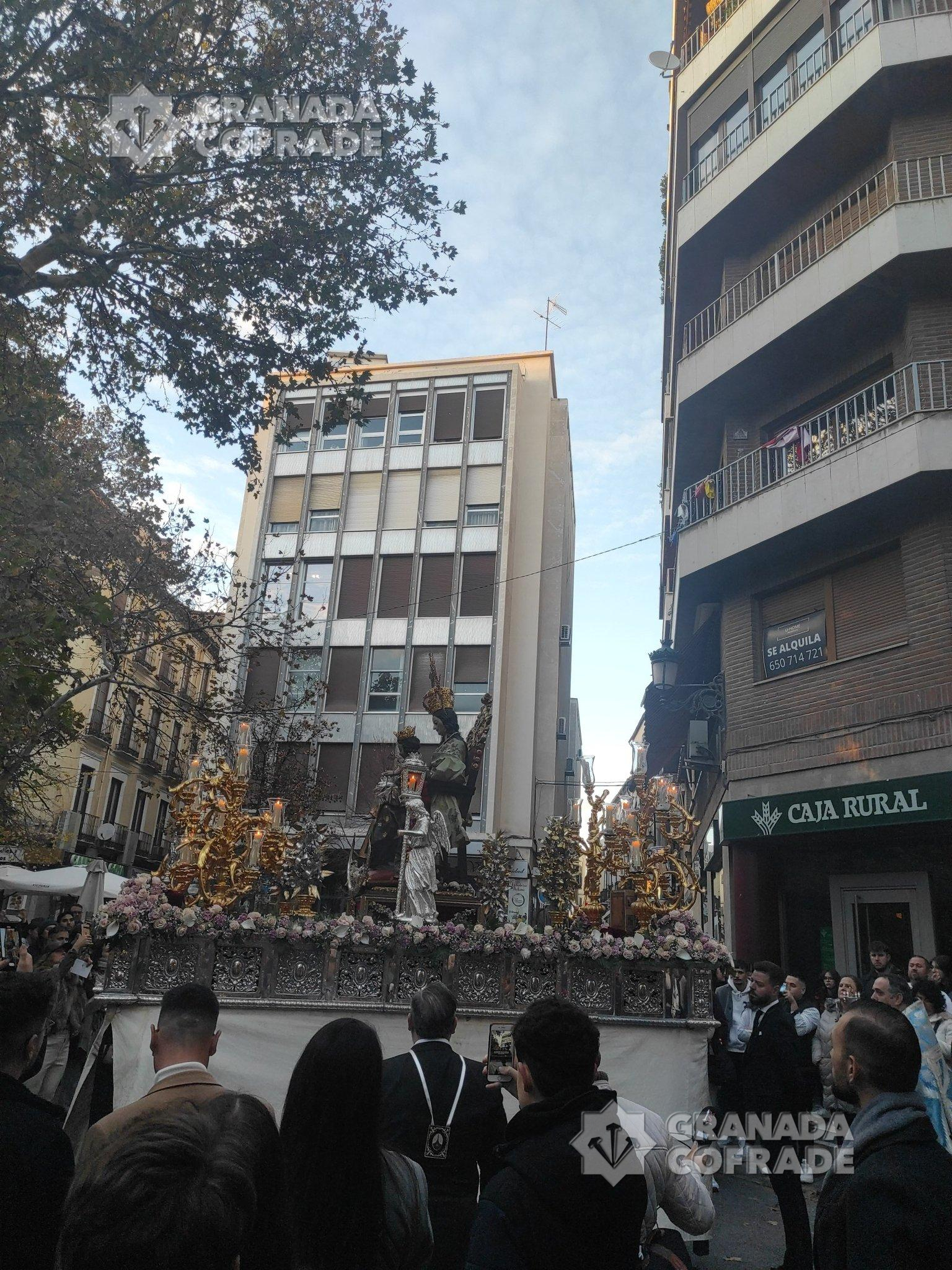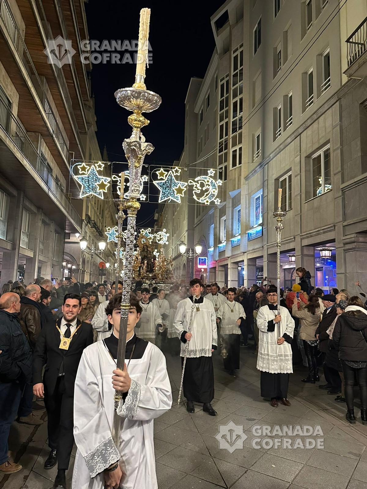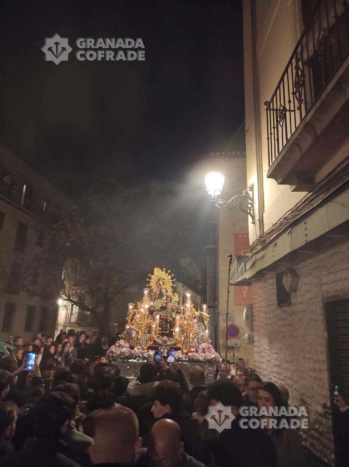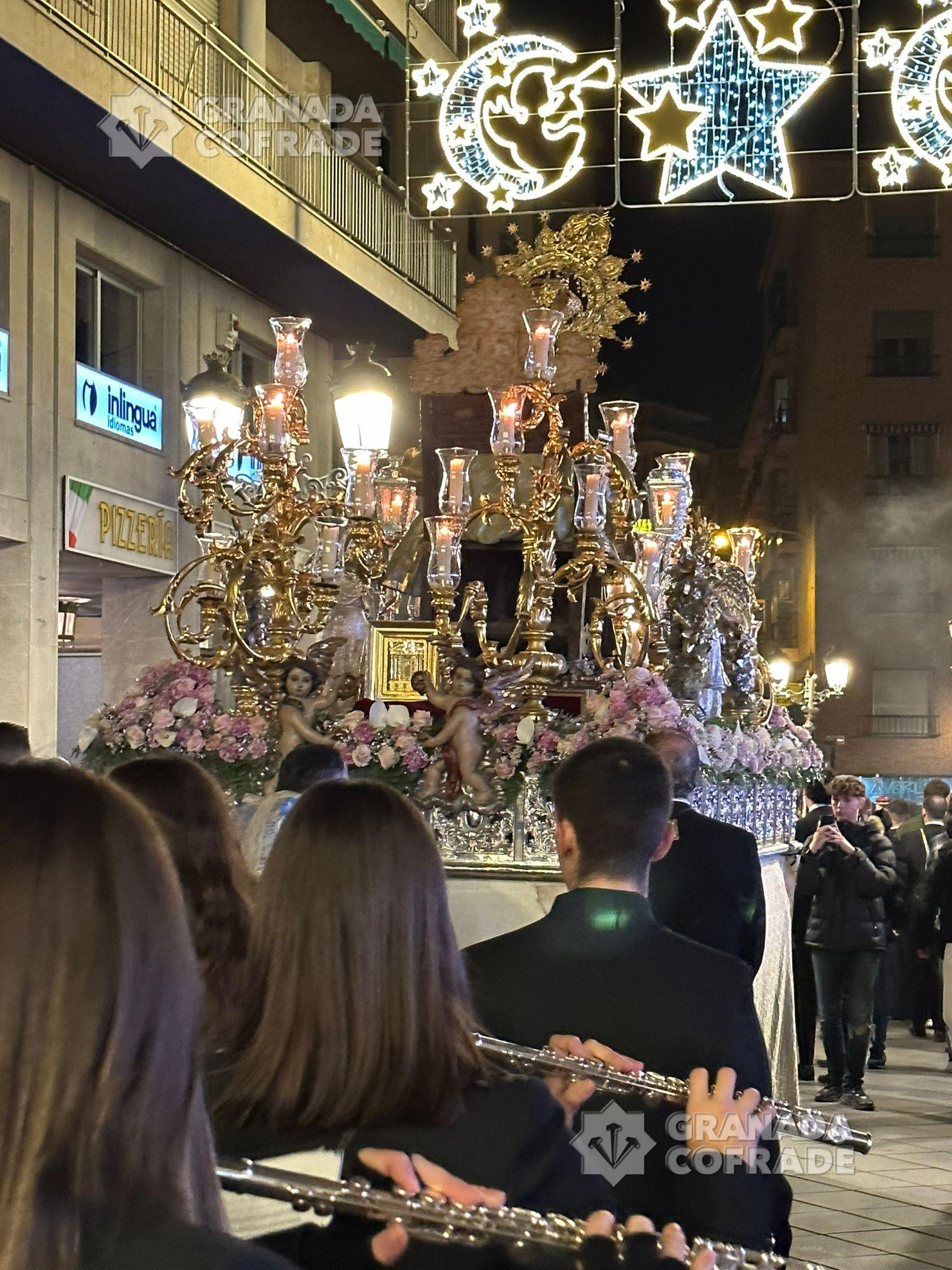 Con el acompañamiento de la banda Ciudad de Atarfe la imagen de la Gran Madre, Nuestra Señora del Carmen, regreso a su sede, después de haber presidido la Vigilia de la Inmaculada y la Eucaristía de la solemnidad de la Inmaculada Concepción en la Catedral de Granada. Un cortejo que se vio acompañado por la cofradía del Santo Vía Crucis, la decana de Granada, junto con la de la Oración en el Huerto, María Auxiliadora de la Alhambra y la de Nuestra Señora de la Cabeza.