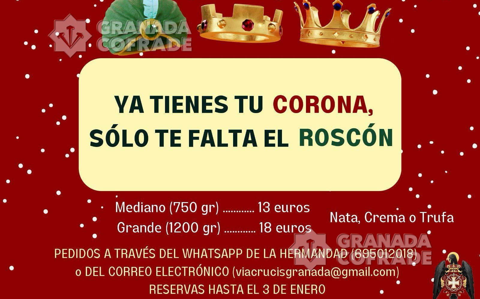 La Hermandad del Santo Vía Crucis ha lanzado la campaña de venta de roscones de reyes, así ha abierto el plazo de reservas, hasta el próximo 3 de enero. Los hermanos y público en general que estén interesados en colaborar pueden enviar su mensaje, través del WhatsApp de la Hermandad (695 01 20 18) y del correo electrónico (viacrucisdegranada@gmail.com).