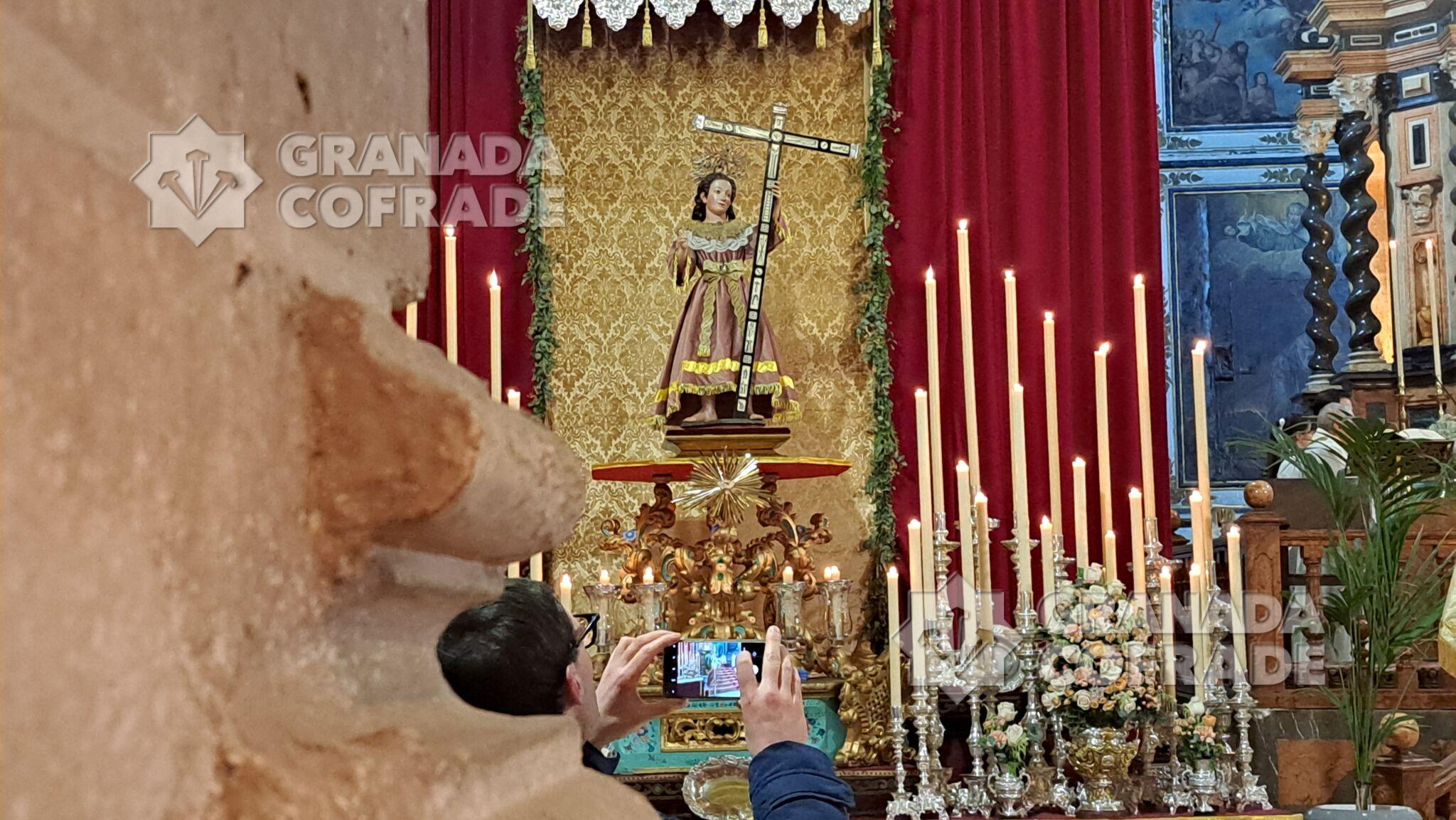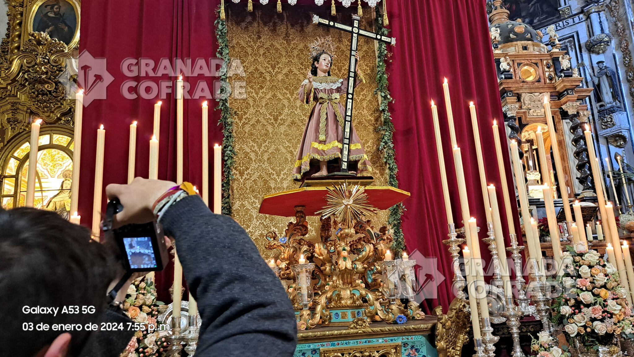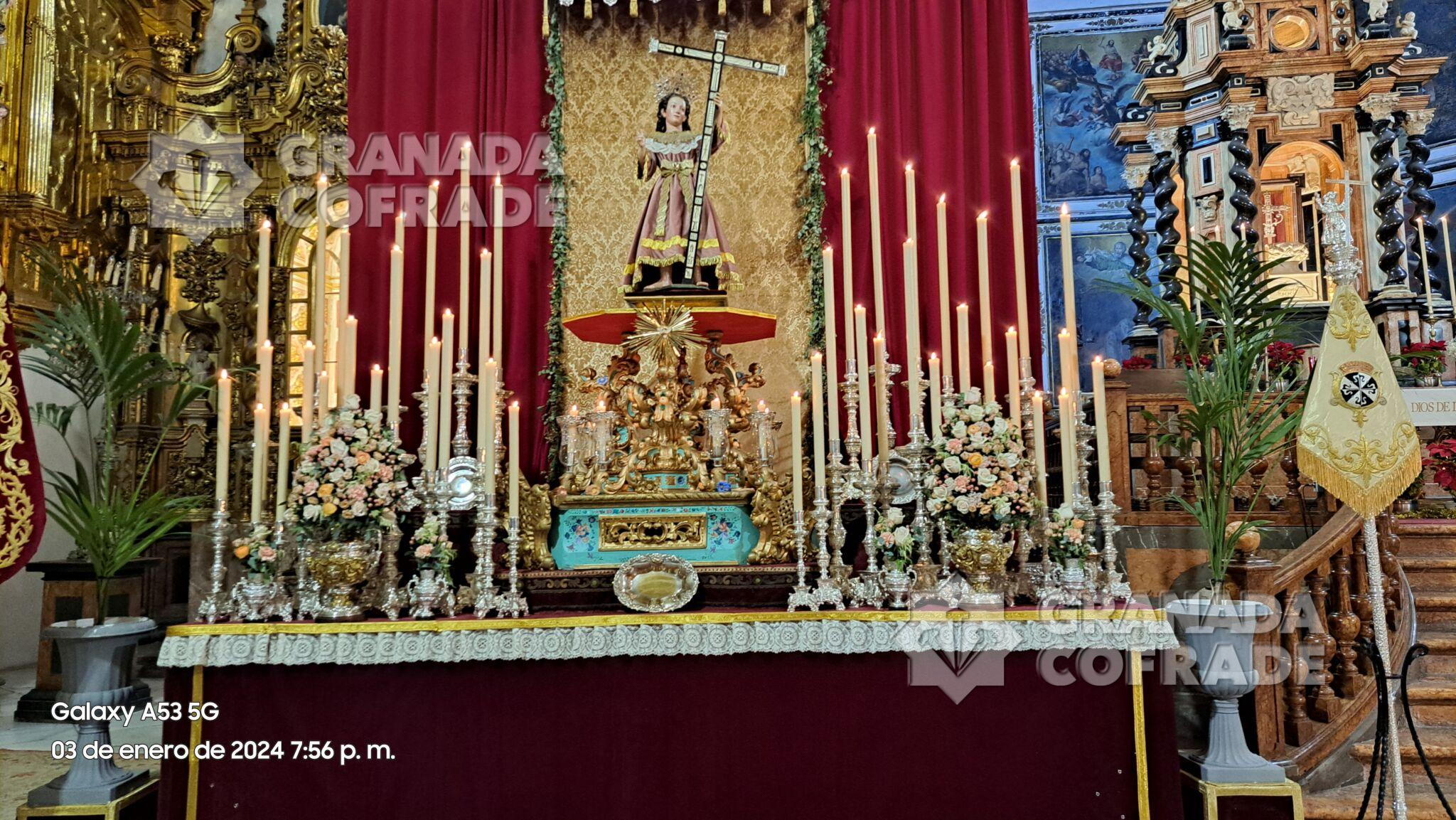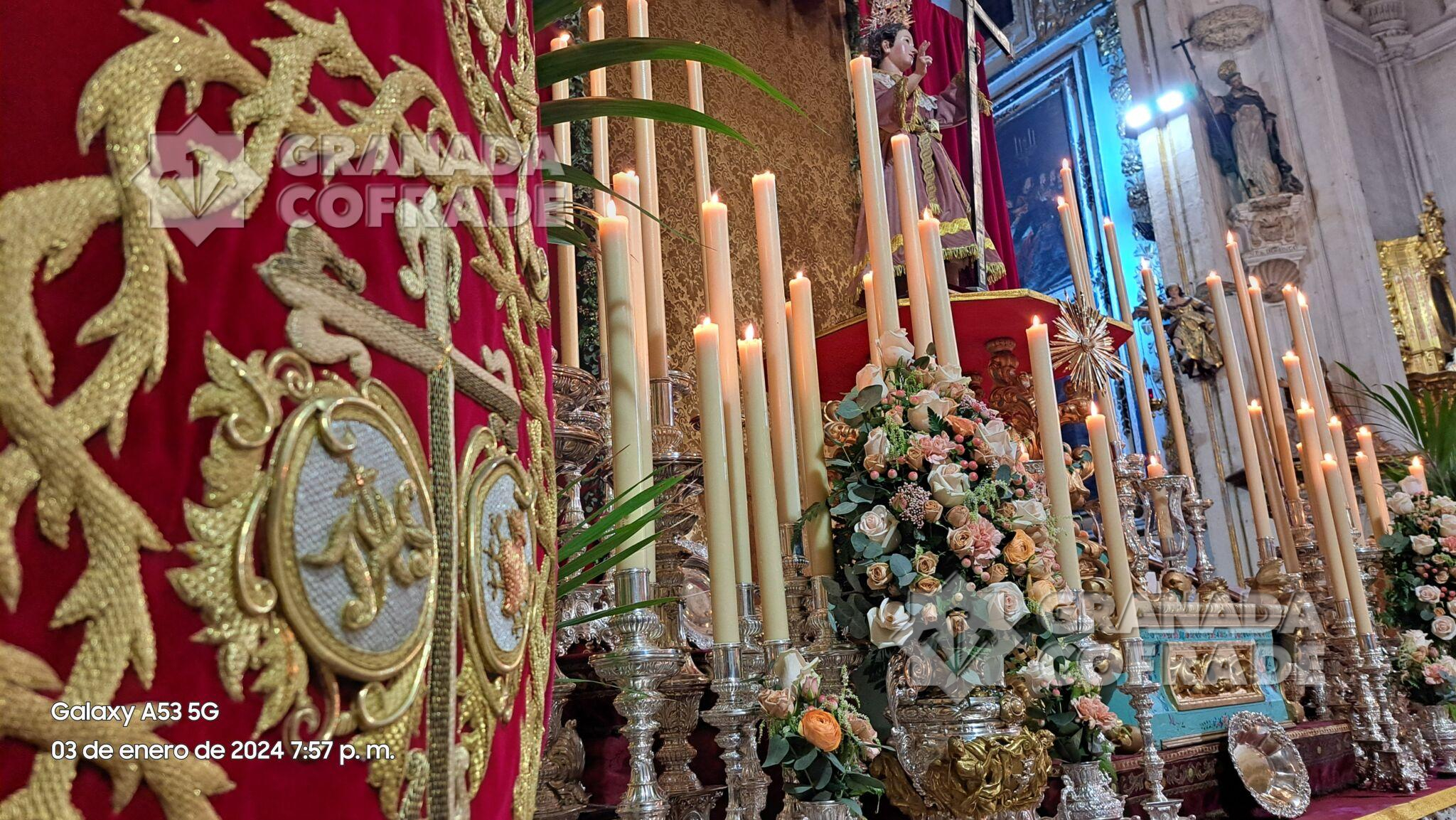 La imagen del Niño Dios  se situaba en un formidable altar de cultos situado en el crucero del templo dominico, sobre peana dorada y policromada cedida por la  hermandad del Señor de la Resurrección, y custodiada por dos paños de cera con candelería. La imagen se había situado delante de un dosel de damasco dorado rematada con orfebrería y talla dorada.
