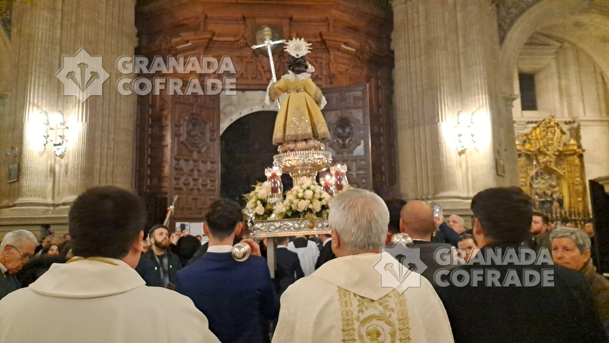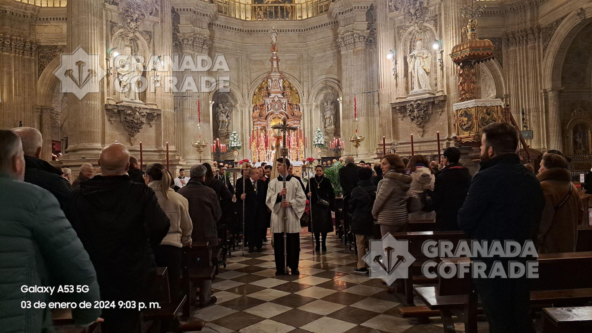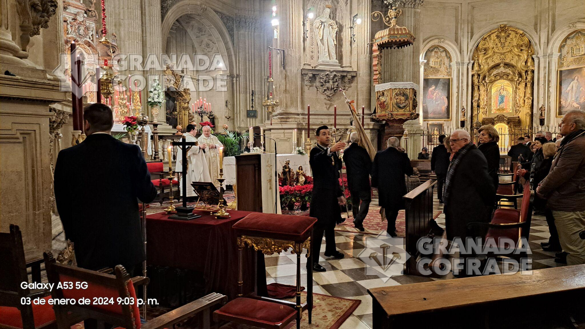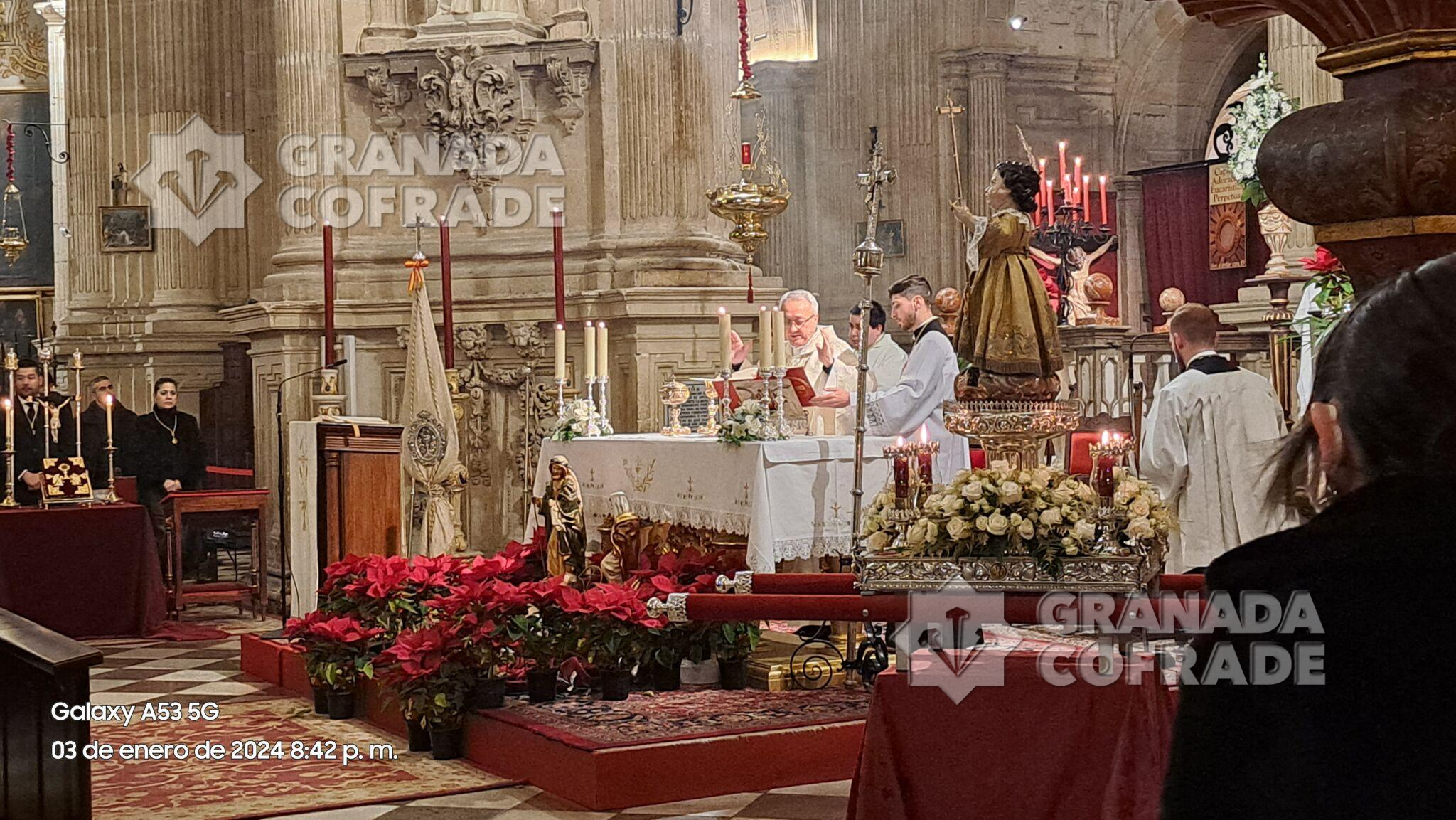 El vicario general de la diócesis de Granada, Enrique Rico Pavés, presidió ayer la solemne Eucaristía de la hermandad Sacramental del Sagrario-Catedral dedicada a su Titular, el Dulcísimo Nombre de Jesús. Situado sobre sus andas procesionales en orfebrería se presenta la Divina Imagen del Infante dispuesta para su procesión claustral al término de la Eucaristía. Estuvo concelebrada por el sacerdote diocesano Rubén Ávila. Estuvo solemnizada de manera magistral por la granadina María Angustias Linares y al órgano, su padre, Antonio Linares, mientras que la procesión claustral, que se aproximó a la puerta del templo del Sagrario para recibir la oración hecha villancico de Coros y Danzas de Granada, estuvo acompañada también por este grupo que confirió un ambiente de recogimiento y oración en torno a las andas procesionales. Eran mandadas por Ricardo Mora. En el cortejo participaban los nuevos Mayordomos Sacramentales de la Hermandad, Jaime Sánchez – Llorente y Esther Vaquero.