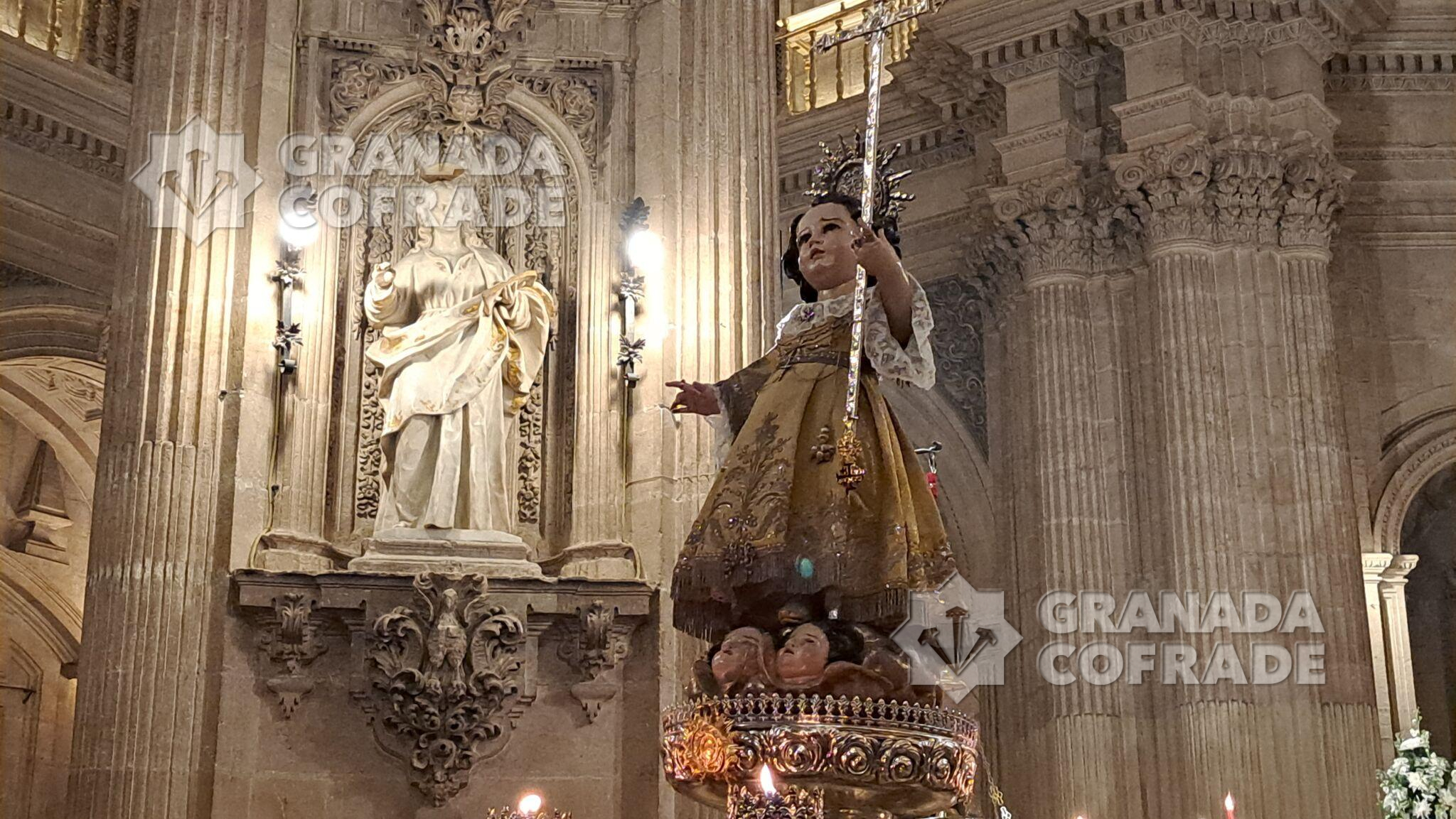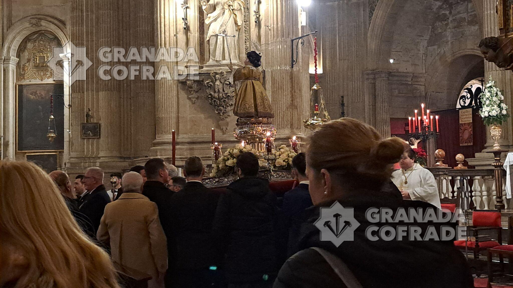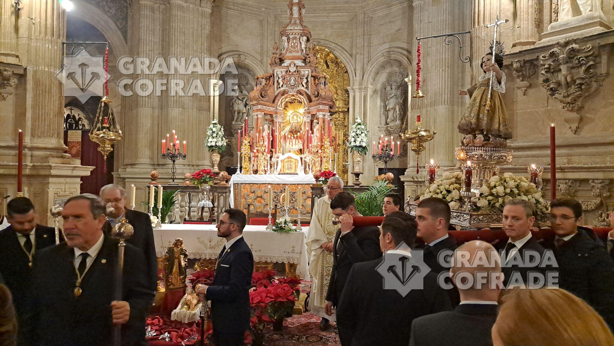 El vicario general de la diócesis de Granada, Enrique Rico Pavés, presidió ayer la solemne Eucaristía de la hermandad Sacramental del Sagrario-Catedral dedicada a su Titular, el Dulcísimo Nombre de Jesús. Situado sobre sus andas procesionales en orfebrería se presenta la Divina Imagen del Infante dispuesta para su procesión claustral al término de la Eucaristía. Estuvo concelebrada por el sacerdote diocesano Rubén Ávila. Estuvo solemnizada de manera magistral por la granadina María Angustias Linares y al órgano, su padre, Antonio Linares, mientras que la procesión claustral, que se aproximó a la puerta del templo del Sagrario para recibir la oración hecha villancico de Coros y Danzas de Granada, estuvo acompañada también por este grupo que confirió un ambiente de recogimiento y oración en torno a las andas procesionales. Eran mandadas por Ricardo Mora. En el cortejo participaban los nuevos Mayordomos Sacramentales de la Hermandad, Jaime Sánchez – Llorente y Esther Vaquero.