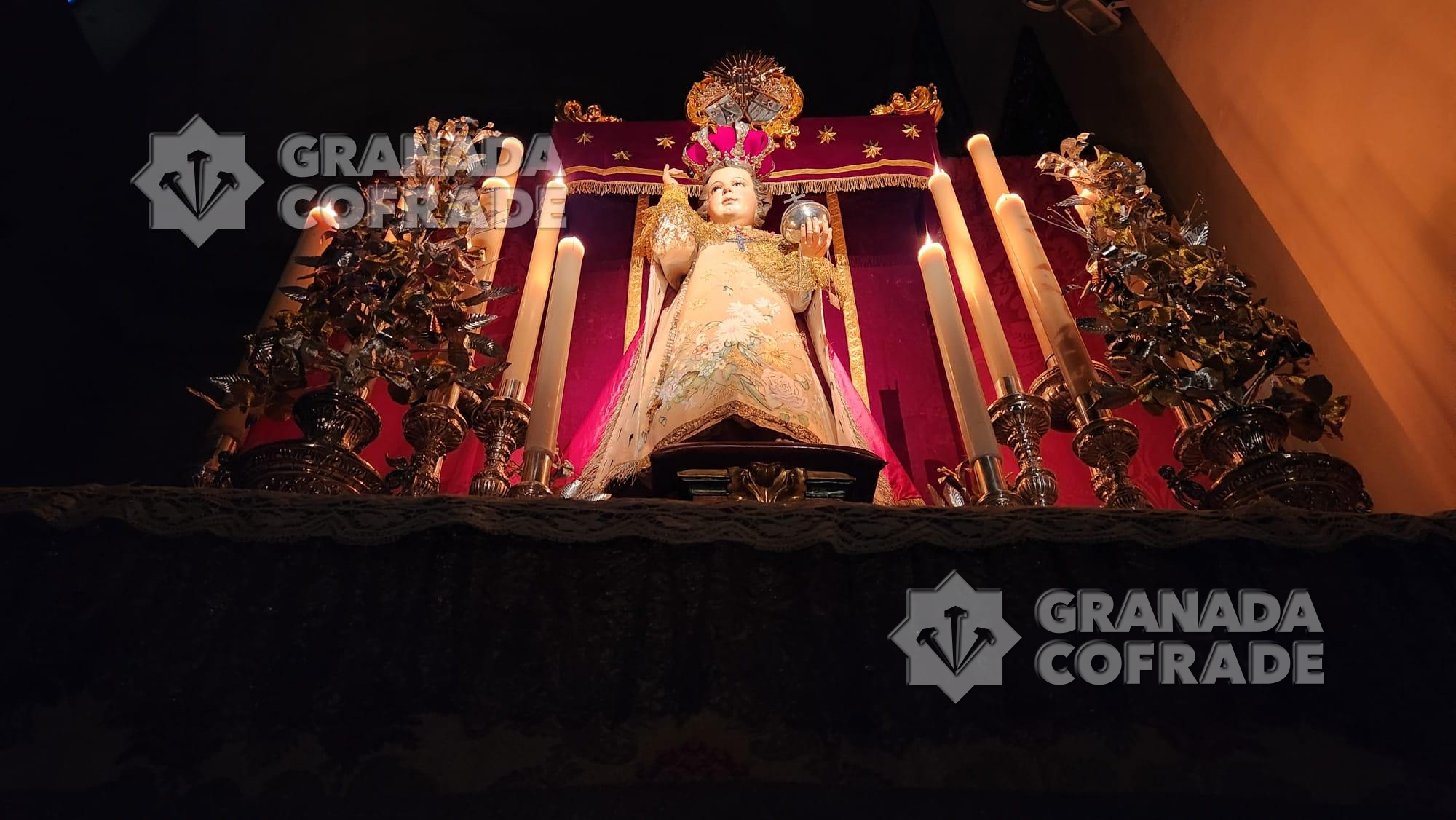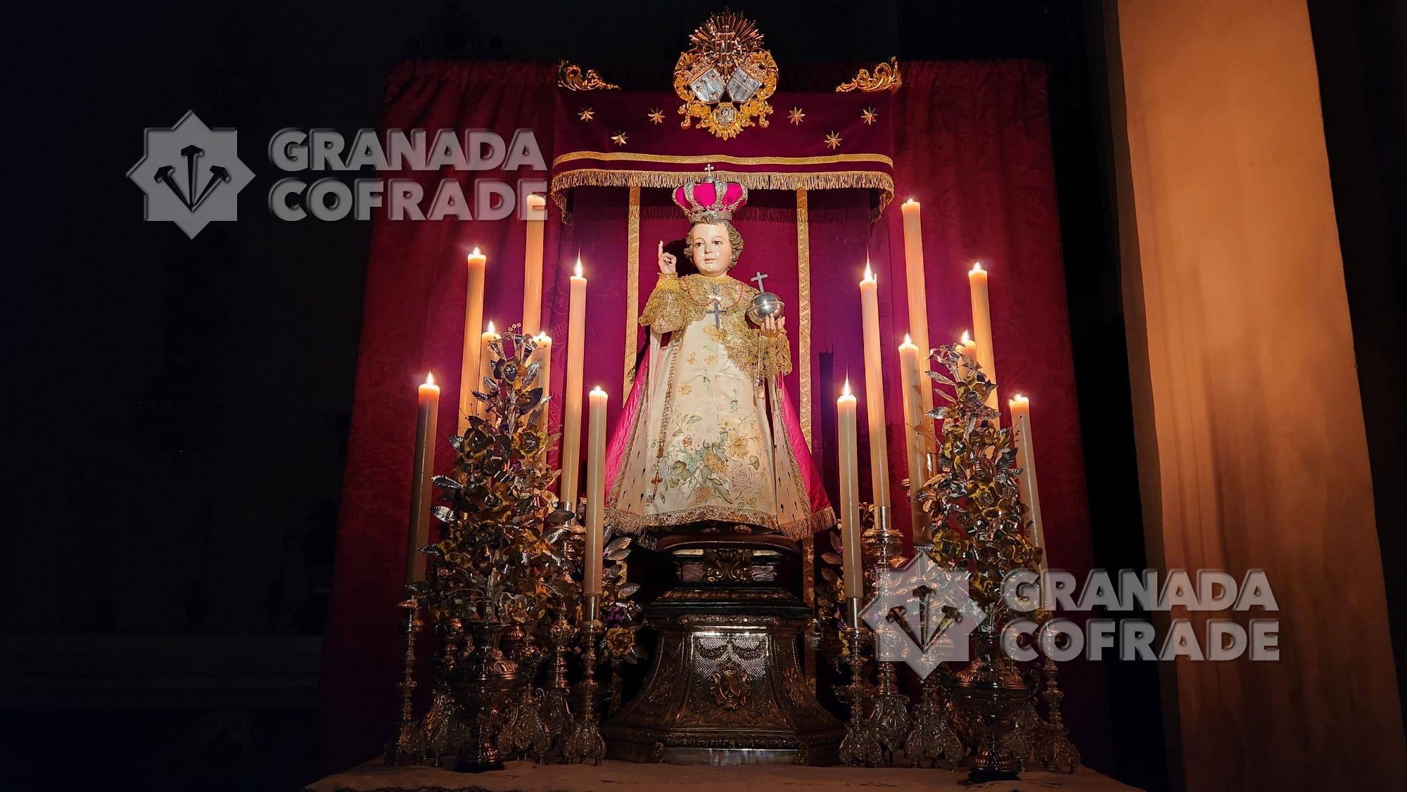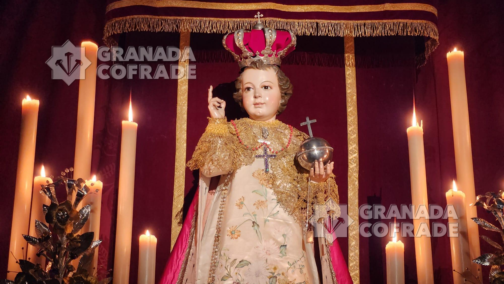 Catorce cirios distribuidos en dos paños ofrecían luz a la imagen del Niño Jesús de Praga que se venera en una de las capillas laterales del templo conventual de San José, de Carmelitas Descalzas. A sendos lados dos jarras de flor de talco destacaba la sencillez y elegancia del altar que fue visitado por cofrades y hermanos. Todo ello bajo dosel granate que se remataba con el escudo de la cofradía de Nuestro Padre Jesús Nazarero.
