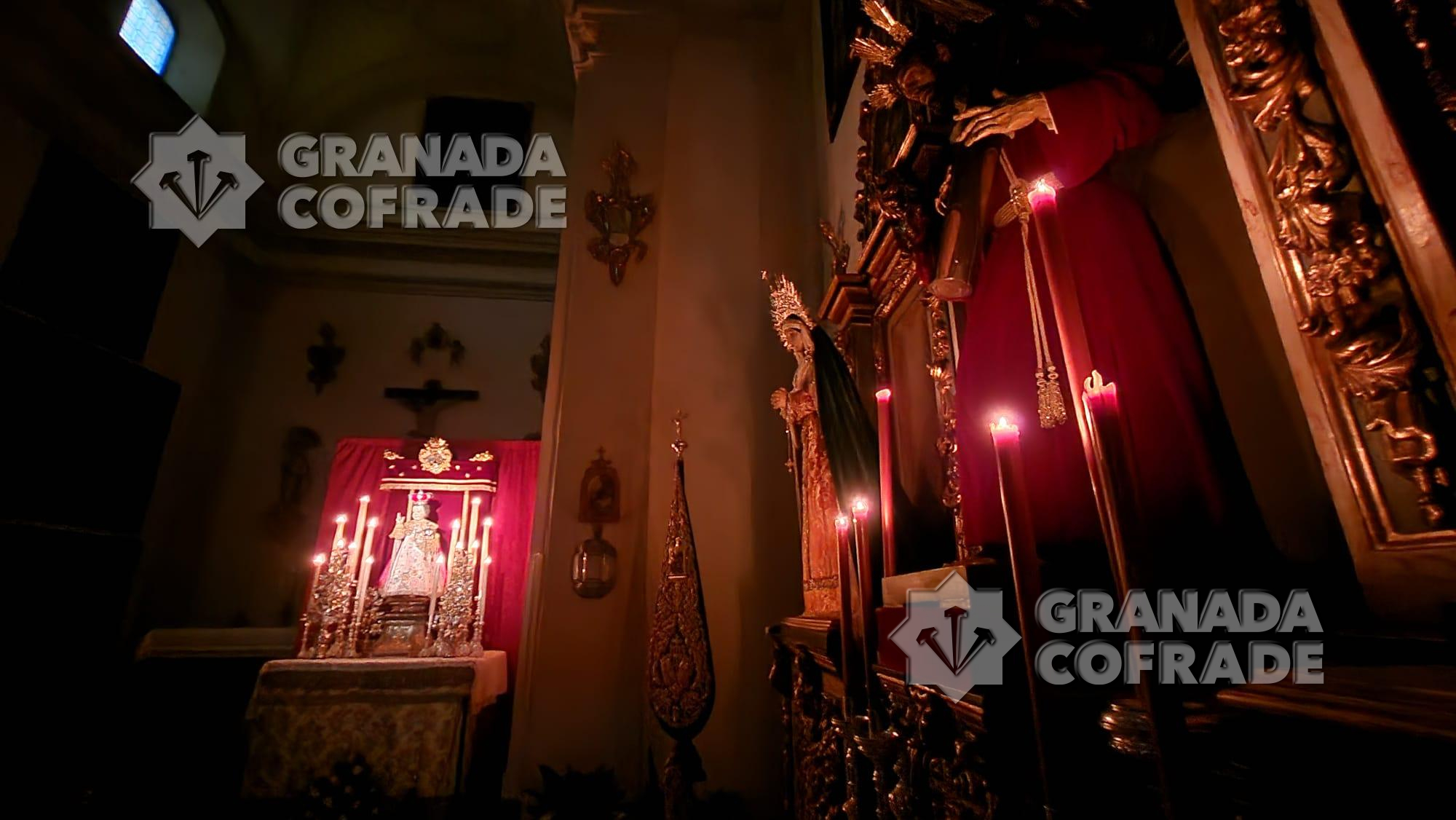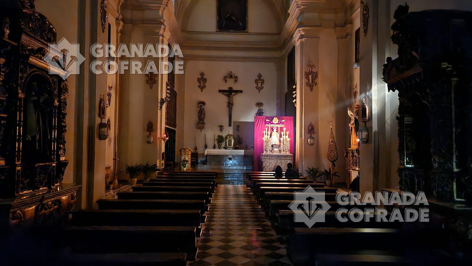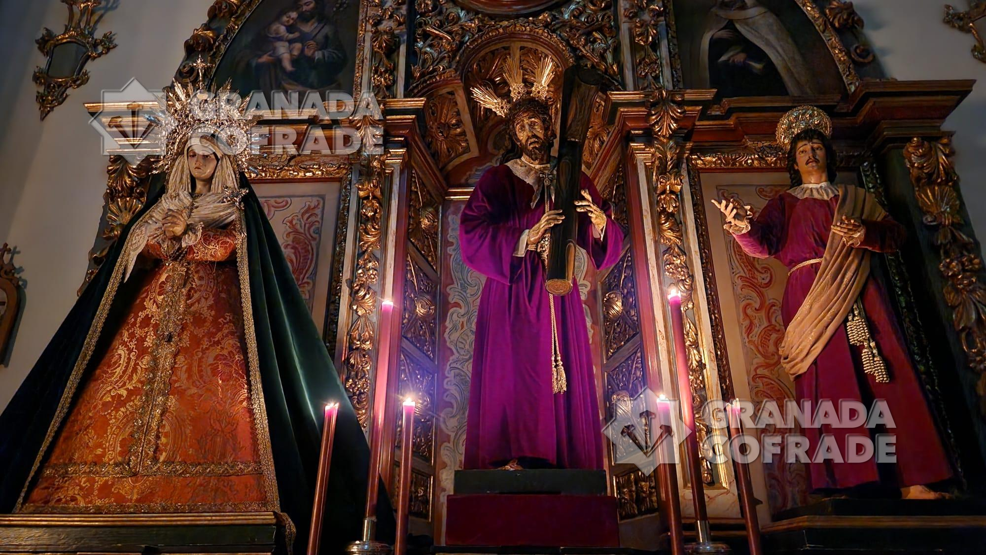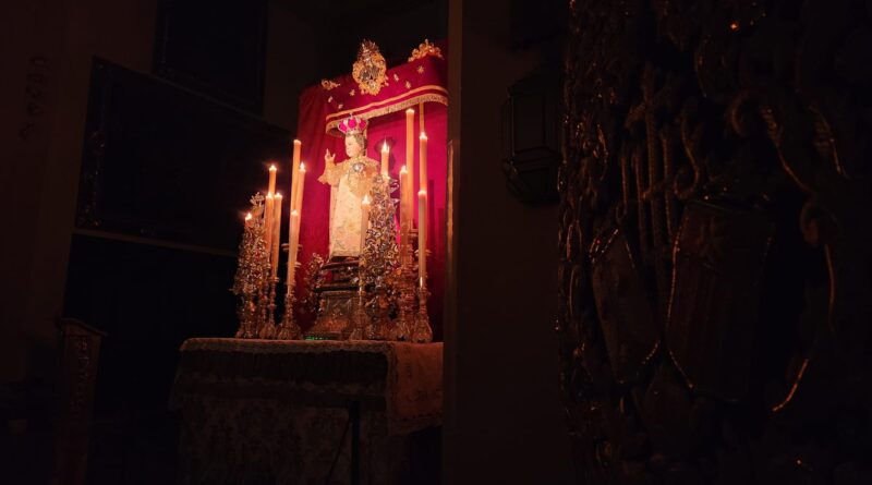 Catorce cirios distribuidos en dos paños ofrecían luz a la imagen del Niño Jesús de Praga que se venera en una de las capillas laterales del templo conventual de San José, de Carmelitas Descalzas. A sendos lados dos jarras de flor de talco destacaba la sencillez y elegancia del altar que fue visitado por cofrades y hermanos. Todo ello bajo dosel granate que se remataba con el escudo de la cofradía de Nuestro Padre Jesús Nazarero.