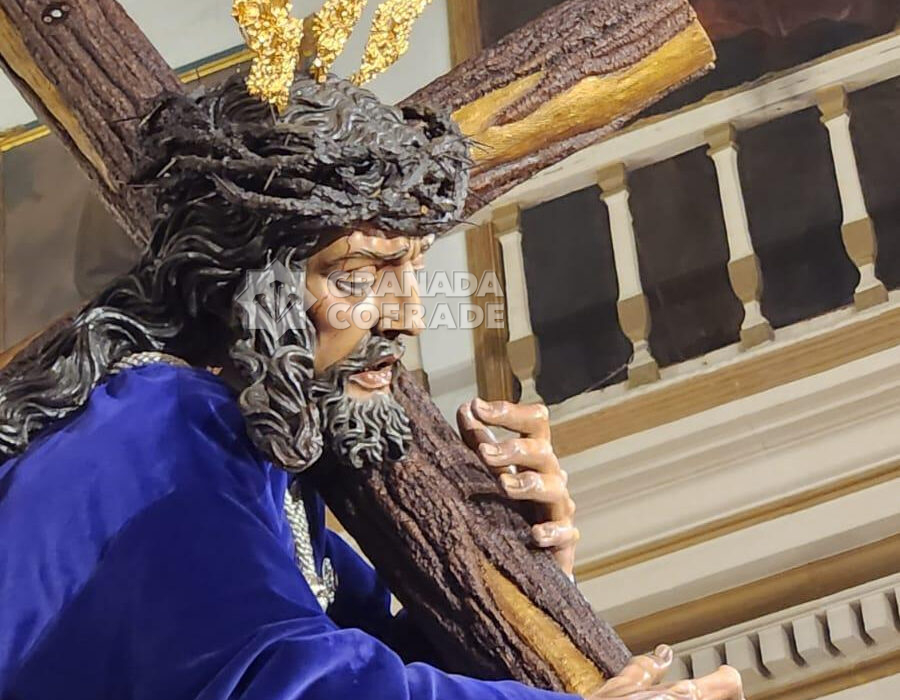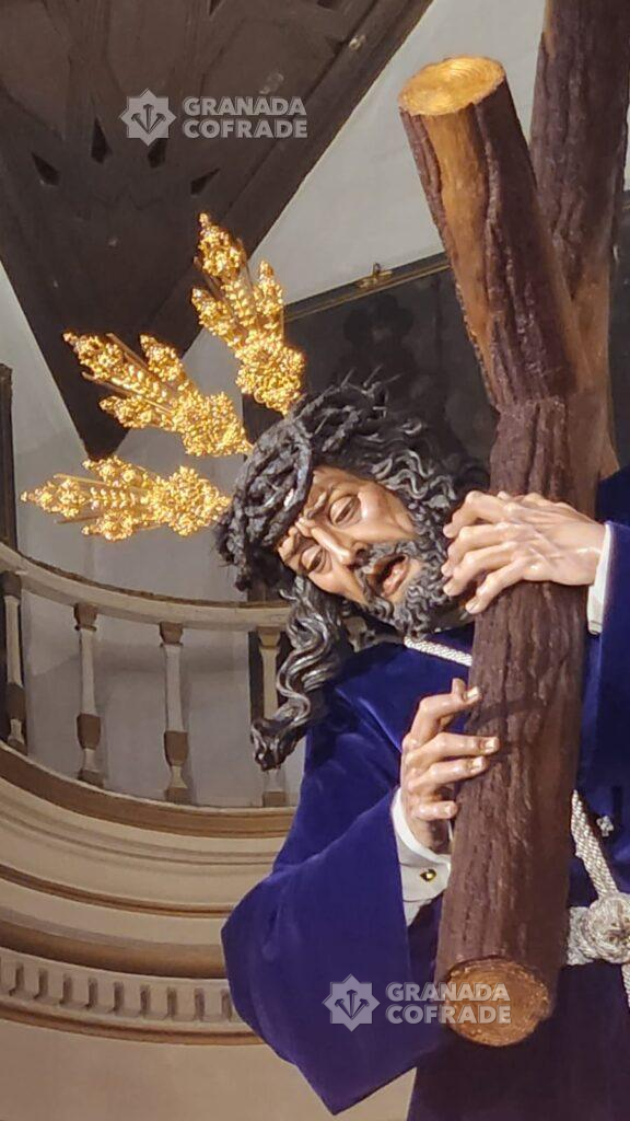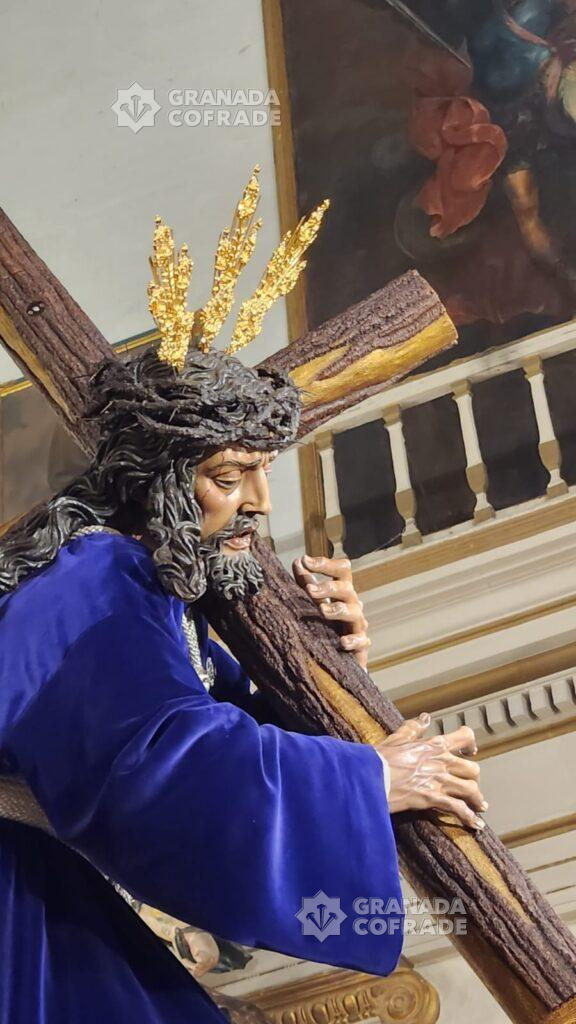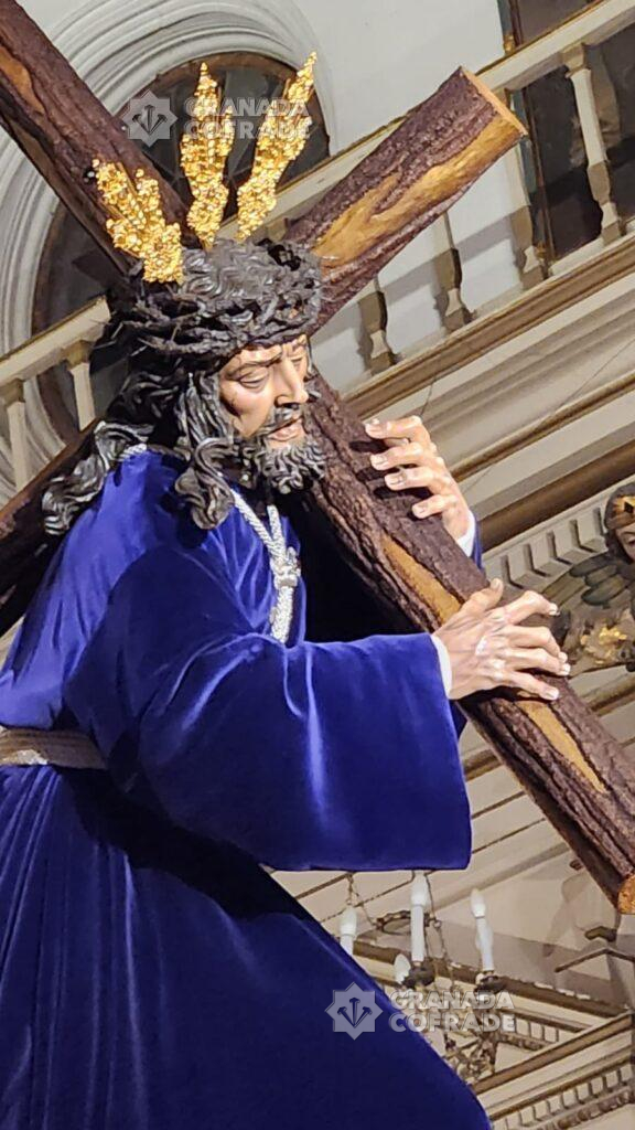 Vestía el Señor del Gran Poder túnica lisa morada, de cola, situada sobre plinto en damasco granate y a sus pies un sencillo centro de iros, rosas y claveles morados.