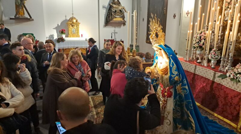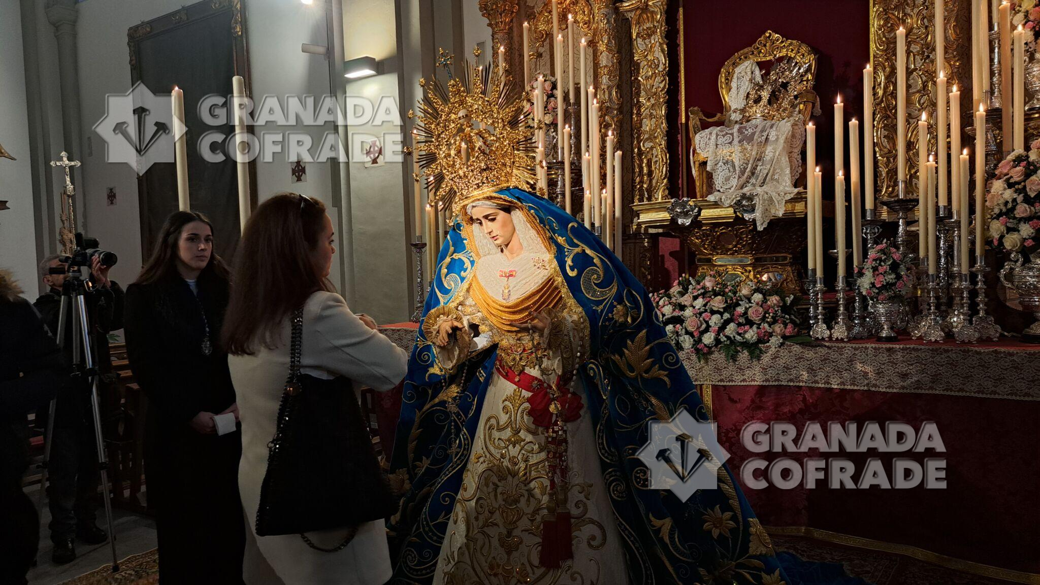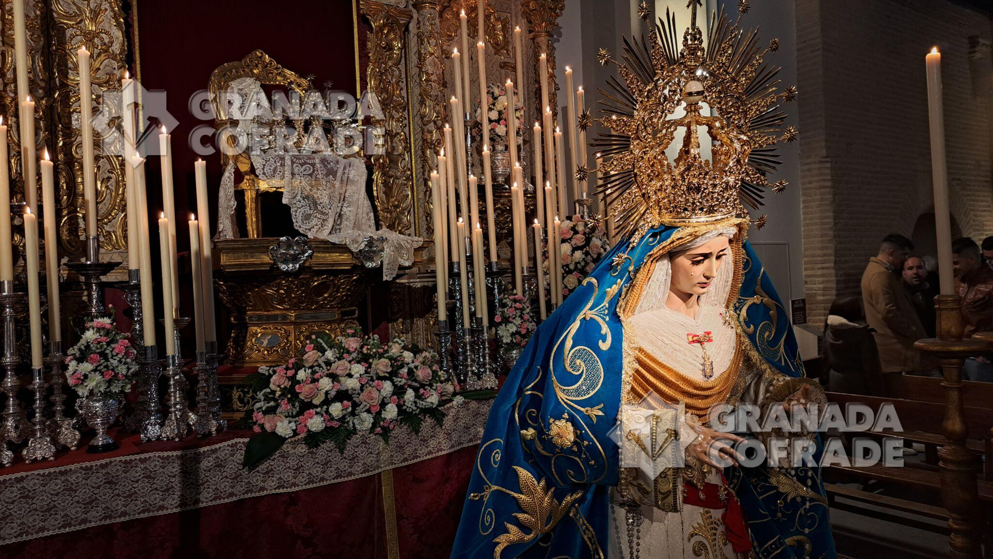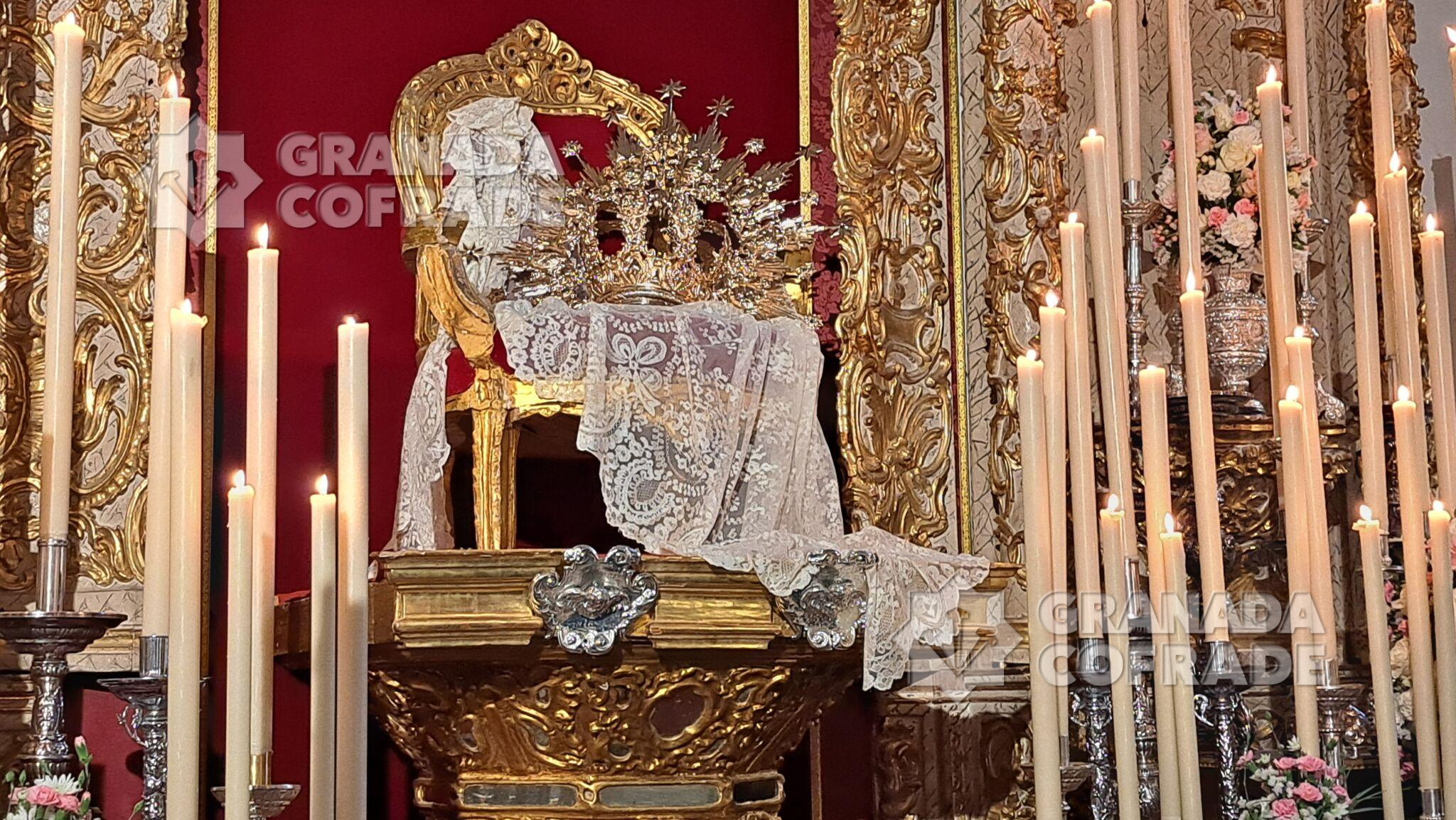 La imagen de Dubé de Luque, que en este 2024 cumple cincuenta años desde su bendición e incorporación como Titular Mariana de esta corporación nazarena, se presentaba en un extraordinario altar de cultos similar al que la priostía de la cofradía montó en la pasada festividad de Cristo Rey del Universo para Jesús de la Entrada en Jerusalén, valiéndose de un antiguo retablo del templo de San Andrés, con sendos paños de cera a los lados y, en el centro, el sillón de Reina con una mantilla blanca y la primitiva corona de la Virgen del año 1974.