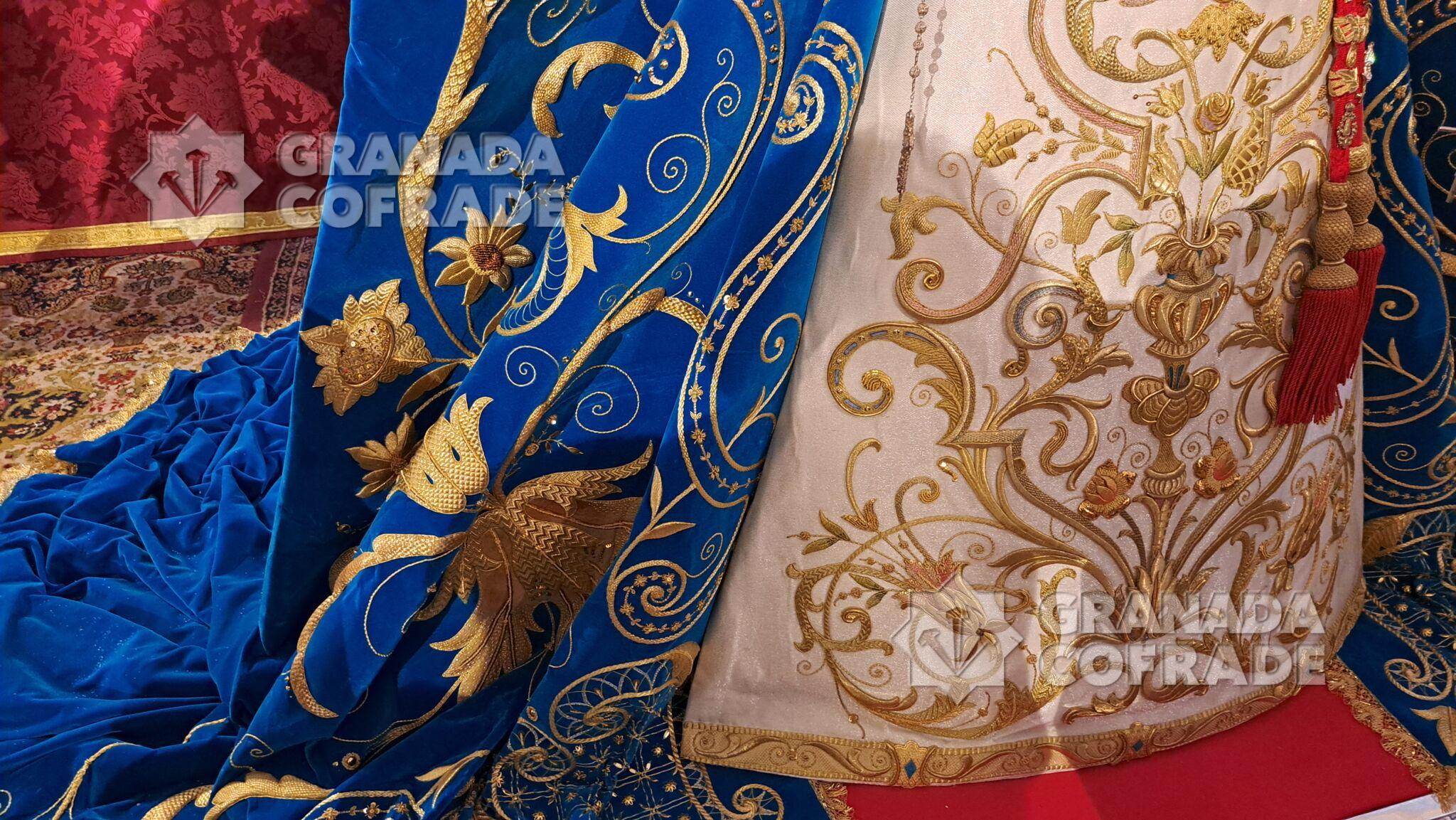 El manto, en un color turquesa vivo, del primitivo terciopelo del antiguo y primer manto de salida de Nuestra Señora de la Paz, está bordado con las técnicas habituales de este arte, en hilo de oro, dándose la particularidad de que se trata del primer manto de vistas recogido de una Dolorosa granadina, ya que este tipo de ajuar habitualmente cae recto en su parte delantera, sin recoger, al contrario del que ayer se pudo observar en la Virgen de la Paz.