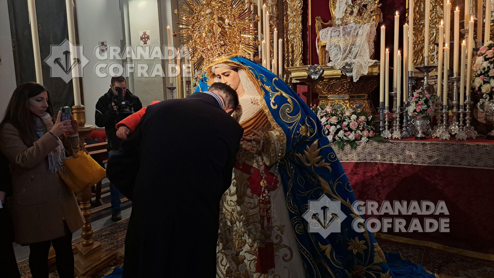 Al término de la Eucaristía se comenzó con el besamanos de la imagen, que se llevó a cabo hasta las 14.30 horas, y ya en horario vespertino, de 16.30 hasta las casi 20.00 horas. Numerosos hermanos y cofrades pasaron durante toda la jornada por el templo de San Andrés, causando el estreno del referido manto de vistos muy buena crítica y aceptación por todos cuanto lo contemplaron. Precisamente, a primera hora de la tarde se acercó hasta allí el pregonero de la Semana Santa del presente año, Pepe Espinel, quien oró ante la imagen y compartió con los miembros de la junta de gobierno que preside José Antonio Gámiz, pareceres y vivencias.