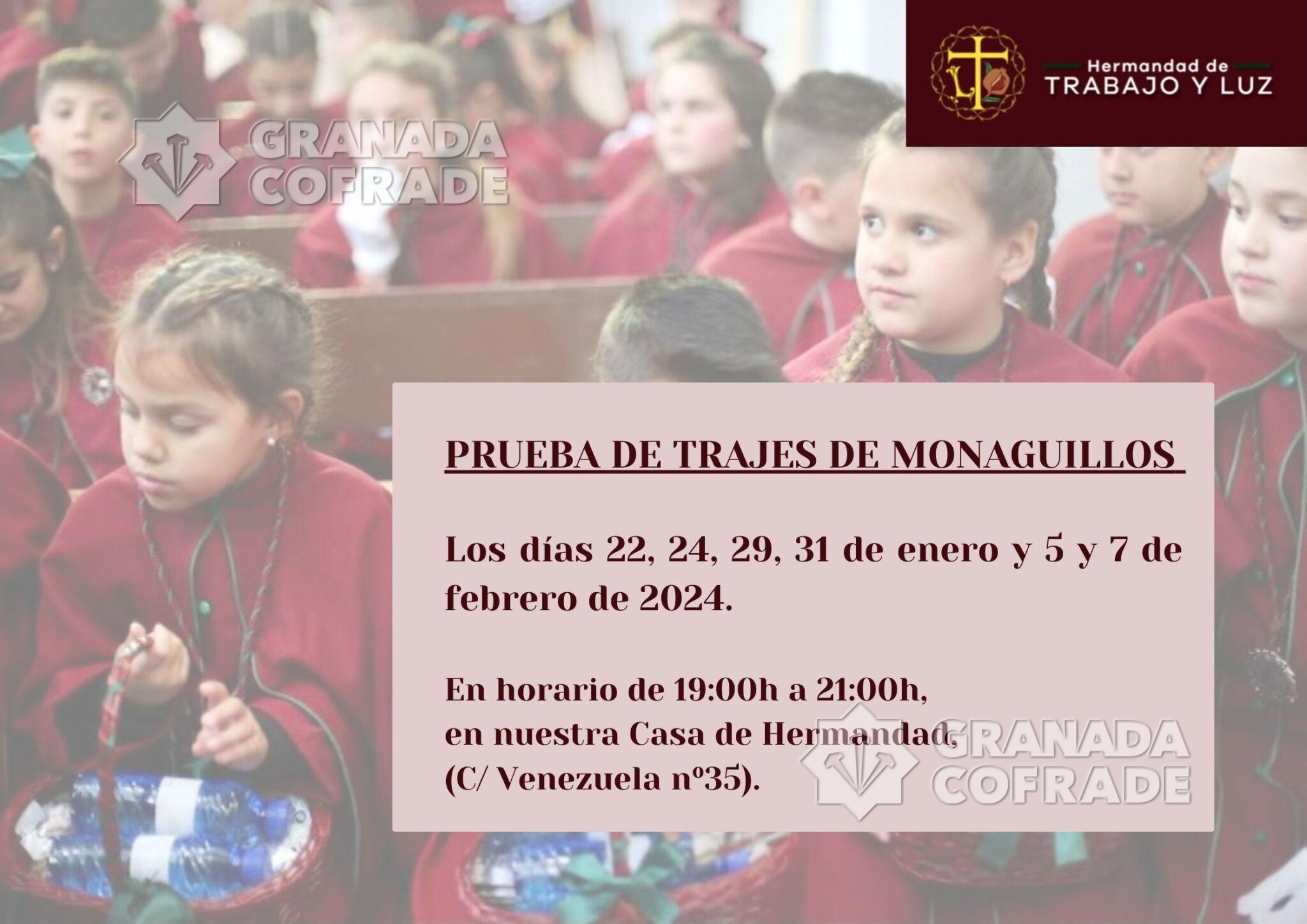 La cofradía del Cristo del Trabajo va a realizar la prueba de trajes de monaguillos para la estación de penitencia del próximo Lunes Santo, los días 22, 24, 29 y 31 de enero y el 5 y 7 de febrero.