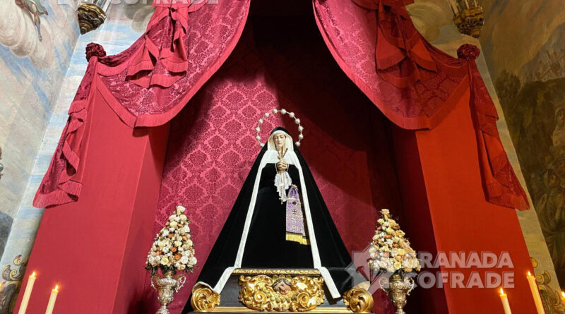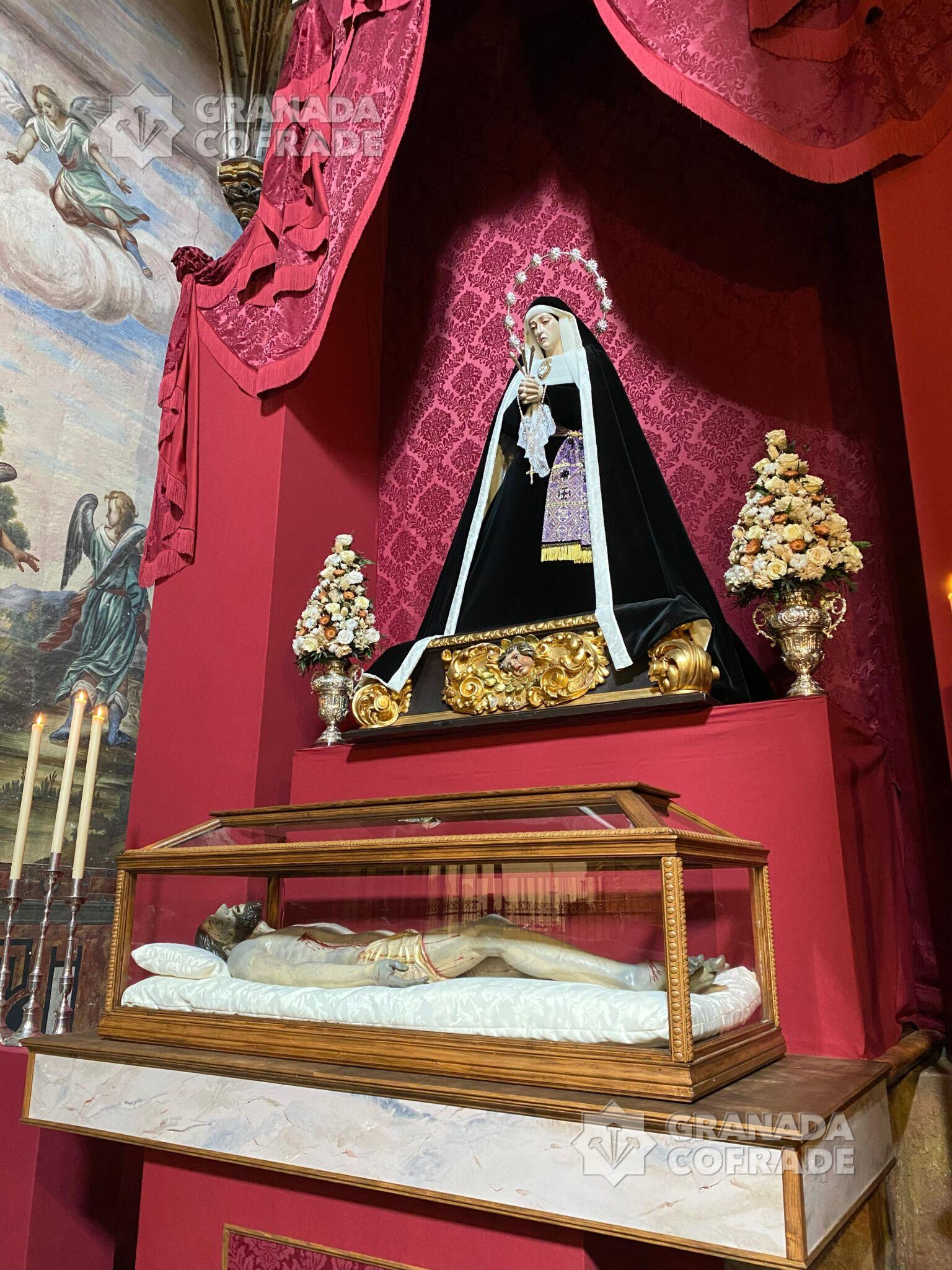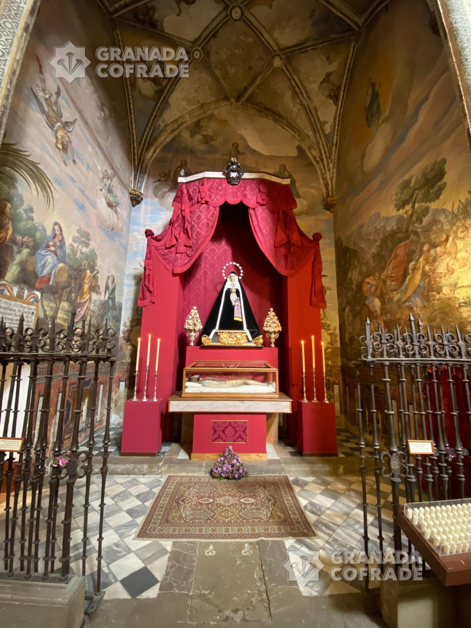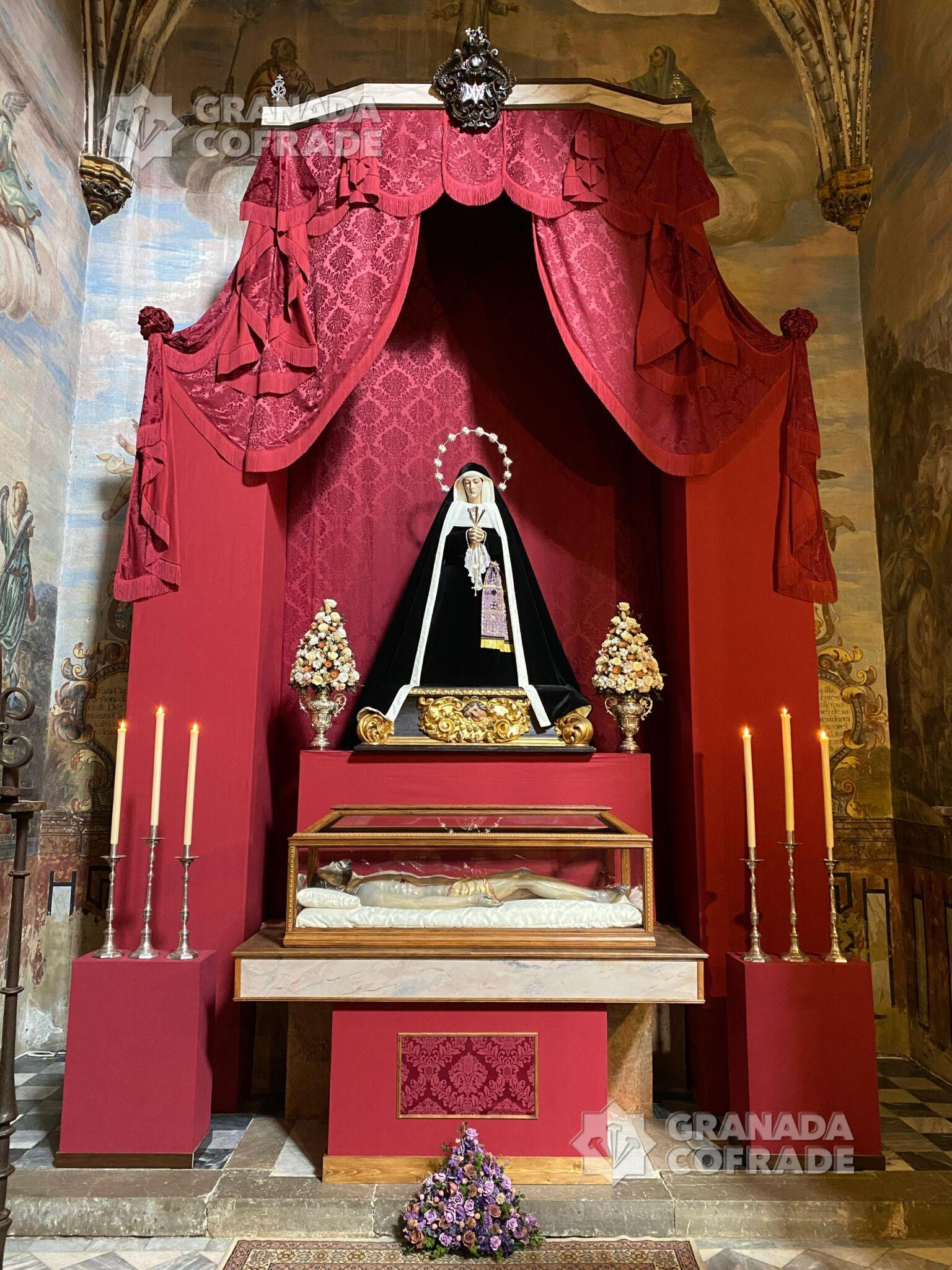 La Virgen de la Soledad se presenta ya bajo dosel de telas rojas y adamascadas para su veneración, en la capilla en la que habitualmente ha recibido culto desde su traslado de Santa Paula. El equipo de priostía de la cofradía al completo y la ayuda de más hermanos ha dado finalmente con el resultado que se contempla en las fotografías que adjuntamos. A modo de baldaquino, rematado con el símbolo de Ave María en cartela de madera barnizada, se ha dispuesto este pabellón con cortinajes recogidos a ambos lados, un tanto a imitación del que se reflejaba en los frescos de la capilla en la que se veneró el Santo Sepulcro de Jacobo Torni que se expone en la actualidad en el Museo de Bellas Artes de la Alhambra. También se ha levantado la imagen del Señor del Descendimiento sobre un altar para ganar altura.