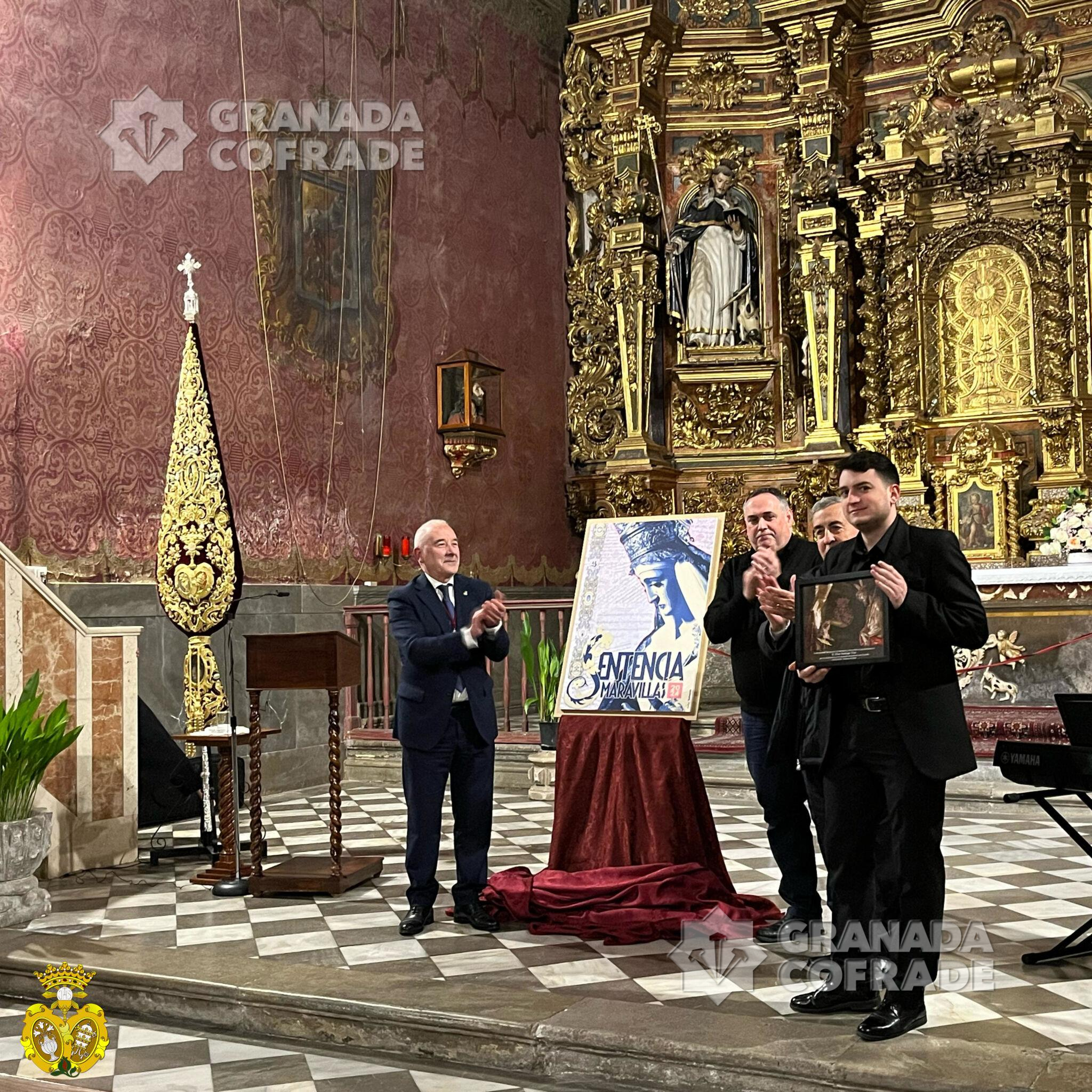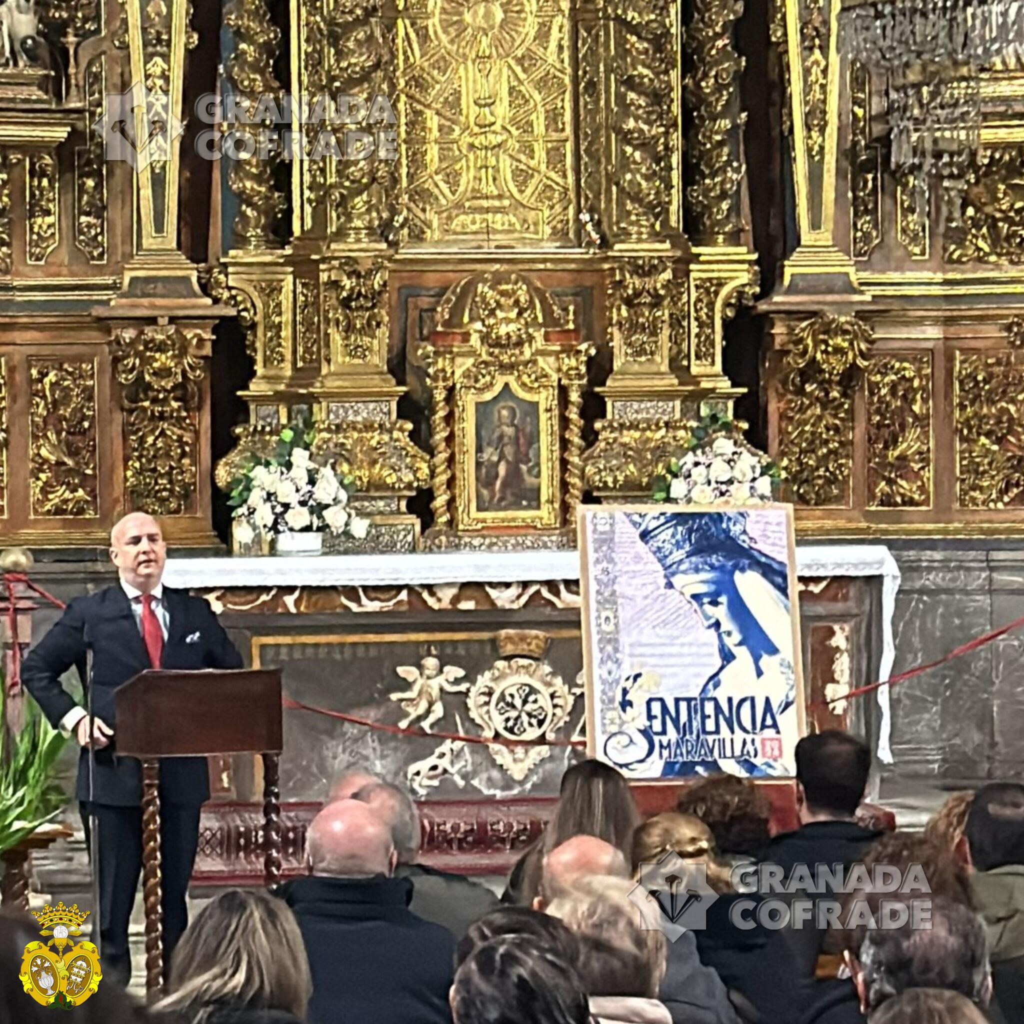 Por espacio de veinte minutos Manuel Amador realizó una presentación medida que fue del gusto de los asistentes, recuperando al comienzo los versos que ya pronunciara hace cuatro años en el pregón oficial de la Semana Santa de 2020 para glosar las maravillas de la «perla del Darro», «la mujer más bella del mundo»; la Virgen María. Seguidamente entraba de lleno en la descripción del cartel elogiando el acierto y buen criterio del autor a la hora de recopilar los valores que hacen única a nuestra titular mariana; deteniéndose especialmente en los símbolos de la realeza y el dolor de María desde un punto de vista teológico indicando que «la primera de las maravillas de Dios en la Virgen es que en su mente existiera desde toda la eternidad», relatándolas una a una, desde su Concepción a su Asunción, en un compendio de teología que se resume en esta advocación.