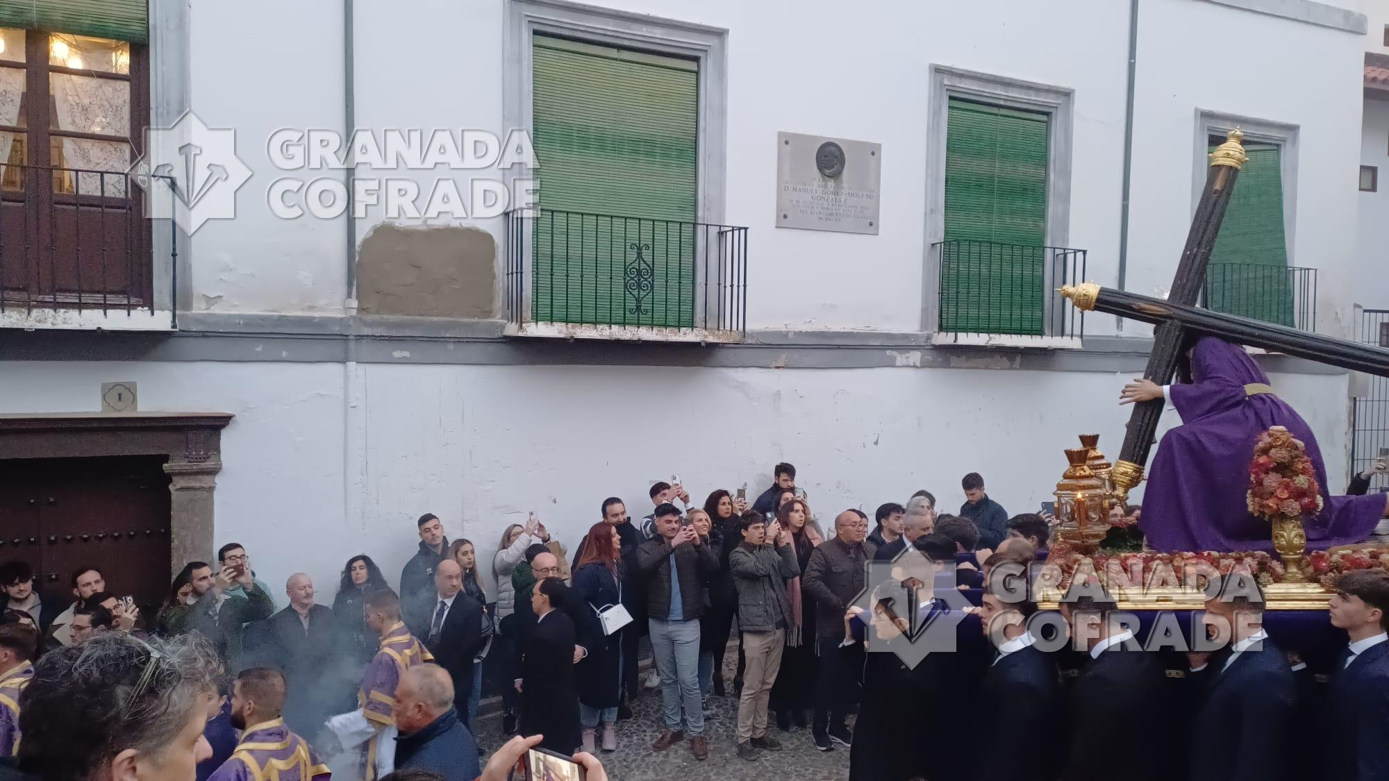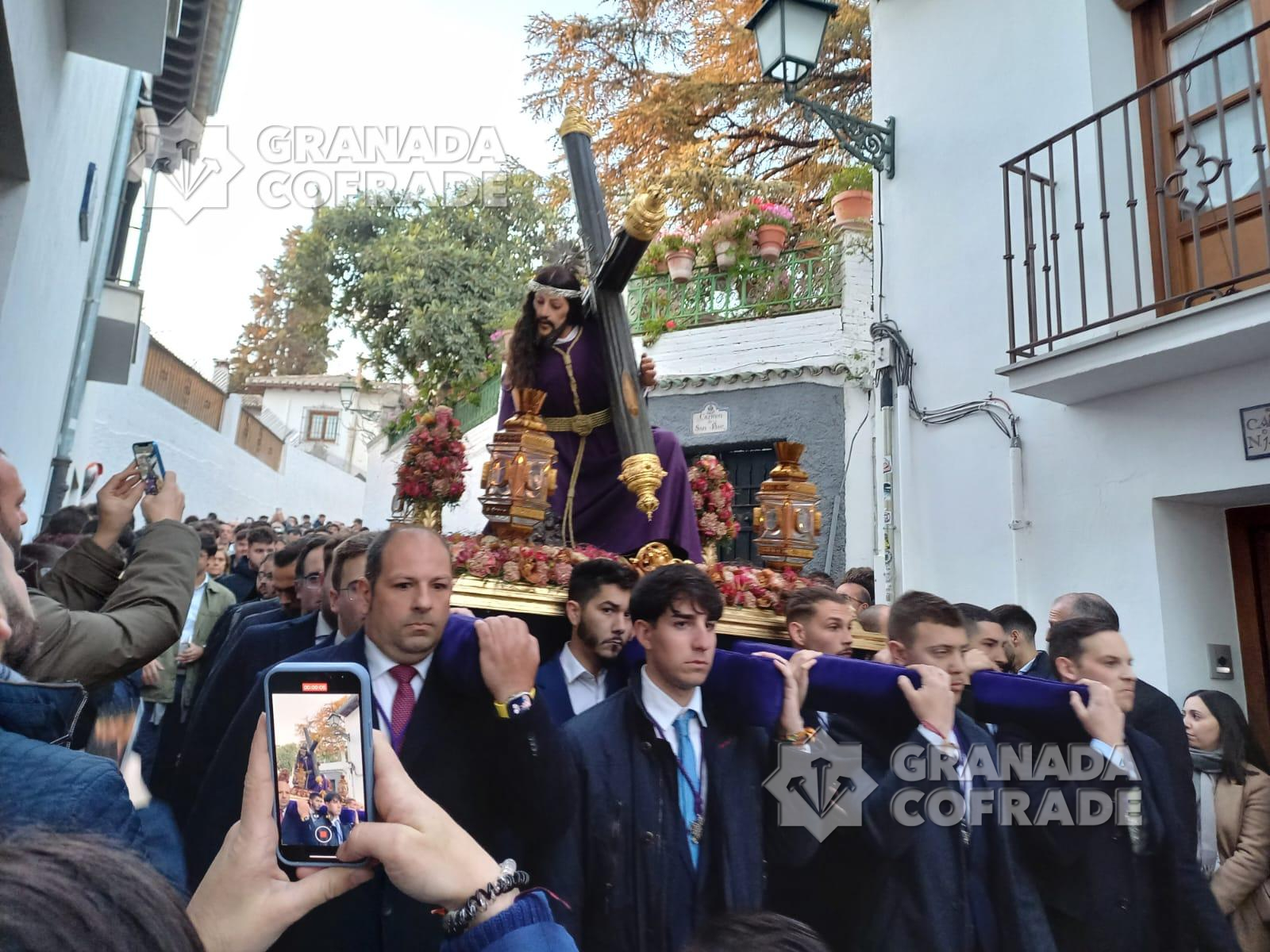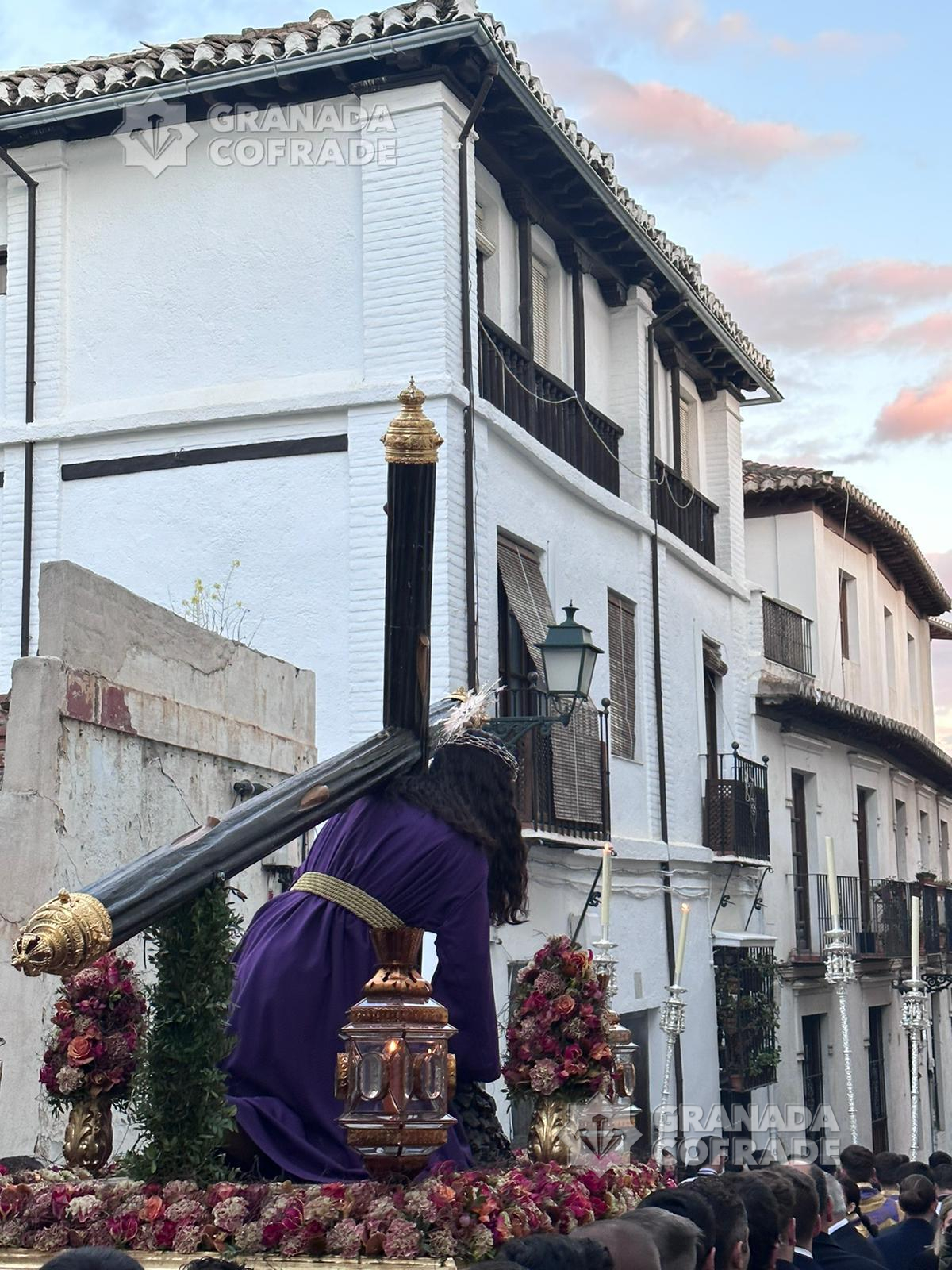 Ayer tarde, por fin, bajó el Señor de las Tres Caídas hasta el barrio del Realejo para presidir los cultos cuaresmales de su hermandad y la estación de penitencia del próximo Miércoles Santo. La lluvia impidió el pasado domingo que así fuera, y de forma extraordinaria este año se ha celebrado el tradicional viacrucis con el que baja hasta el barrio del Realejo el día de Andalucía, miércoles. A las seis de la tarde partía el cortejo desde el interior del convento de Santa Isabel la Real, en el barrio del Albayzin, acompañado por un buen número de parejas de hermanos.
