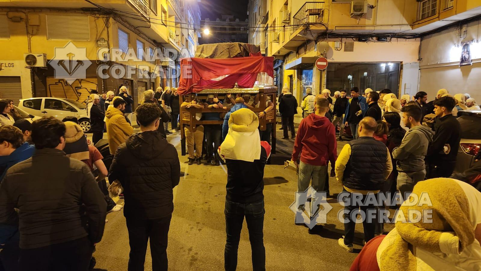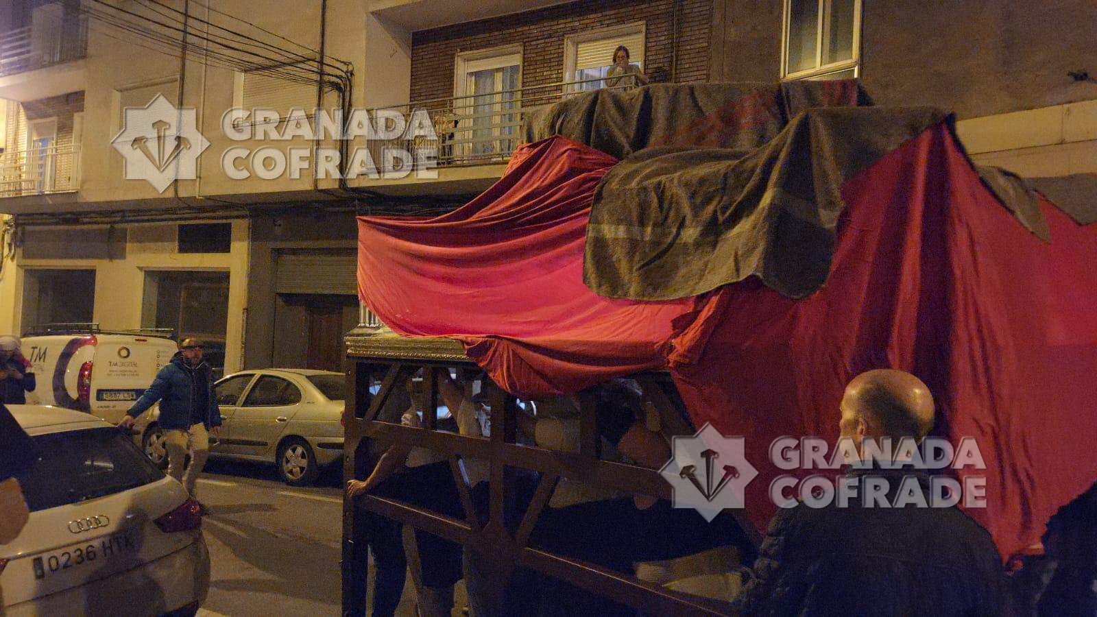 Para esta ocasión se usó el propio paso procesional de la Virgen de la Alhambra, al encontrarse obstaculizando la salida en la que se custodia la parihuela de ensayo, un vehículo estacionado en la misma, y que no pudo ser retirado en el momento del ensayo.