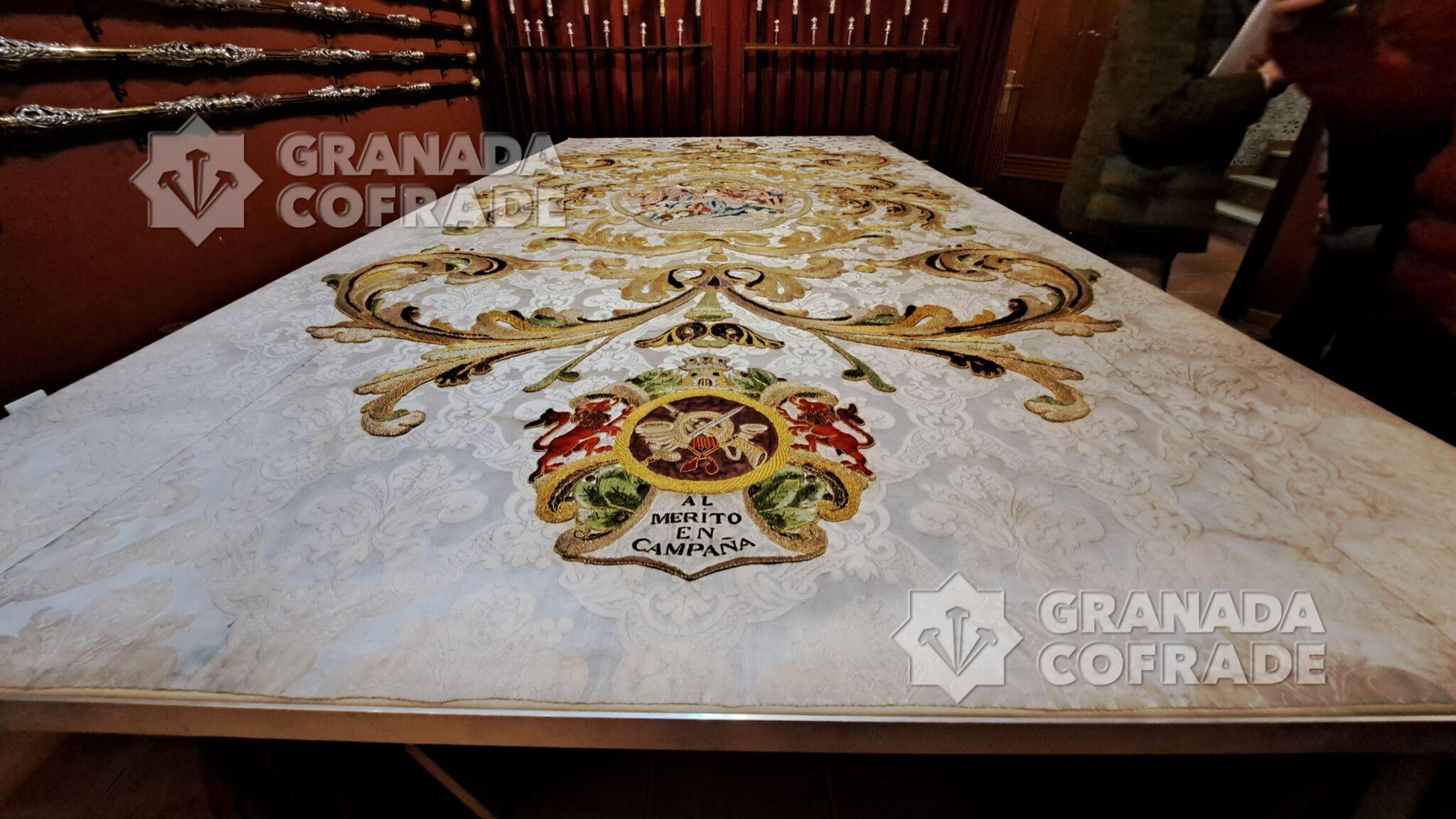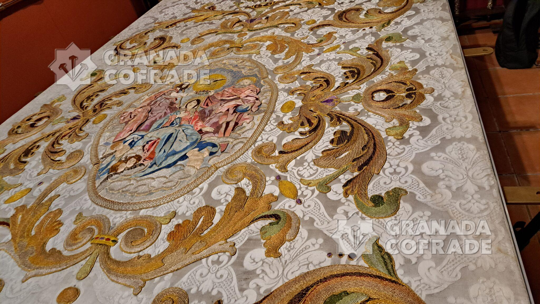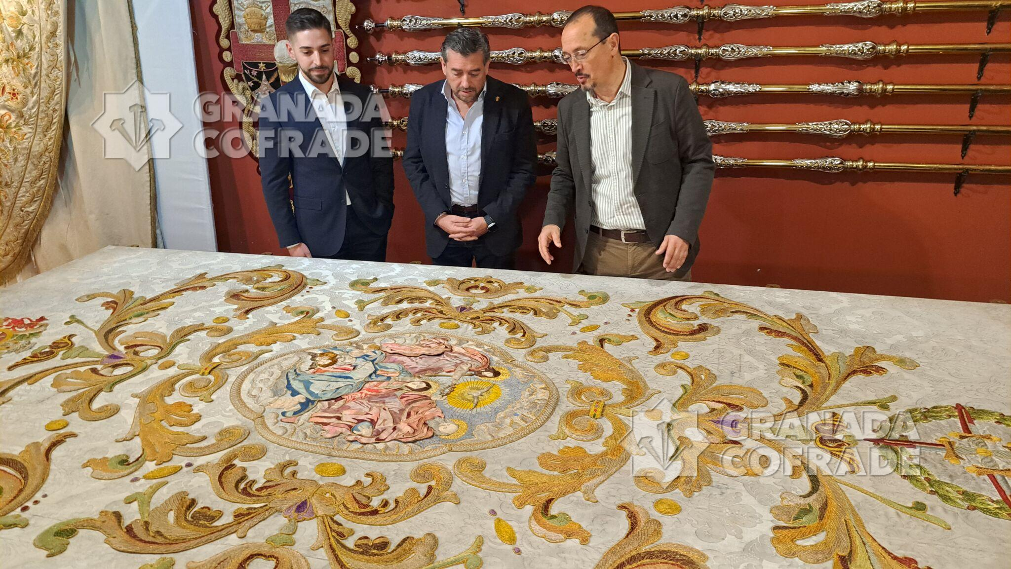 Fernando Egea ha explicado que «se trata de una pieza de calidad excepcional y única también por su valor histórico en el contexto en el que ve la luz, mediados del siglo XIX. Se han recuperado bordados y tejidos, así como 2.000 borlas de las que se han repuesto 200″. El delegado de Turismo, Cultura y Deporte ha aprovechado para resaltar la importancia de la intervención «no sólo como recuperación de un patrimonio histórico y etnológico esencial de nuestra ciudad y en la Semana Santa granadina, sino también como un impulso a las hermandades, que tanto están aportando a la sociedad desde el punto de vista social como patrimonial». Las actuaciones llevadas a cabo han actuado sobre el techo de palio y las cuatro bambalinas. Los trabajos han consistido en la limpieza de la suciedad acumulada sobre el tejido, la eliminación de las manchas de humedad que poseía el palio como consecuencia de las lluvias durante sus estaciones de penitencia, así como la restauración de los bordados.