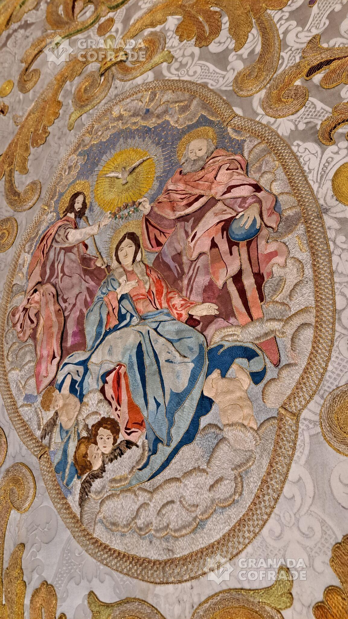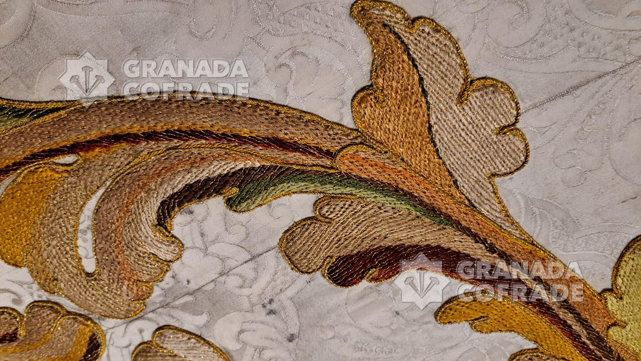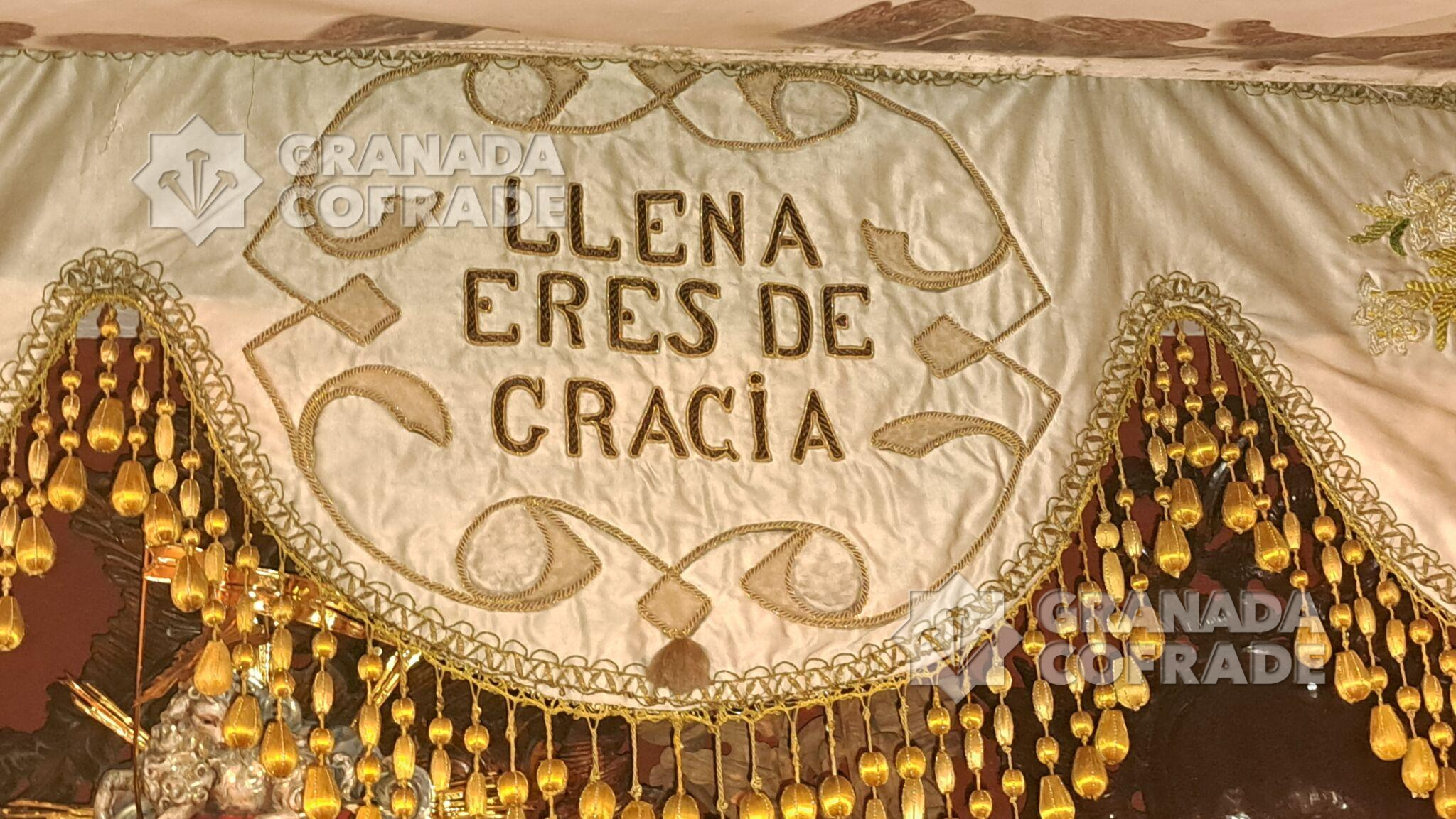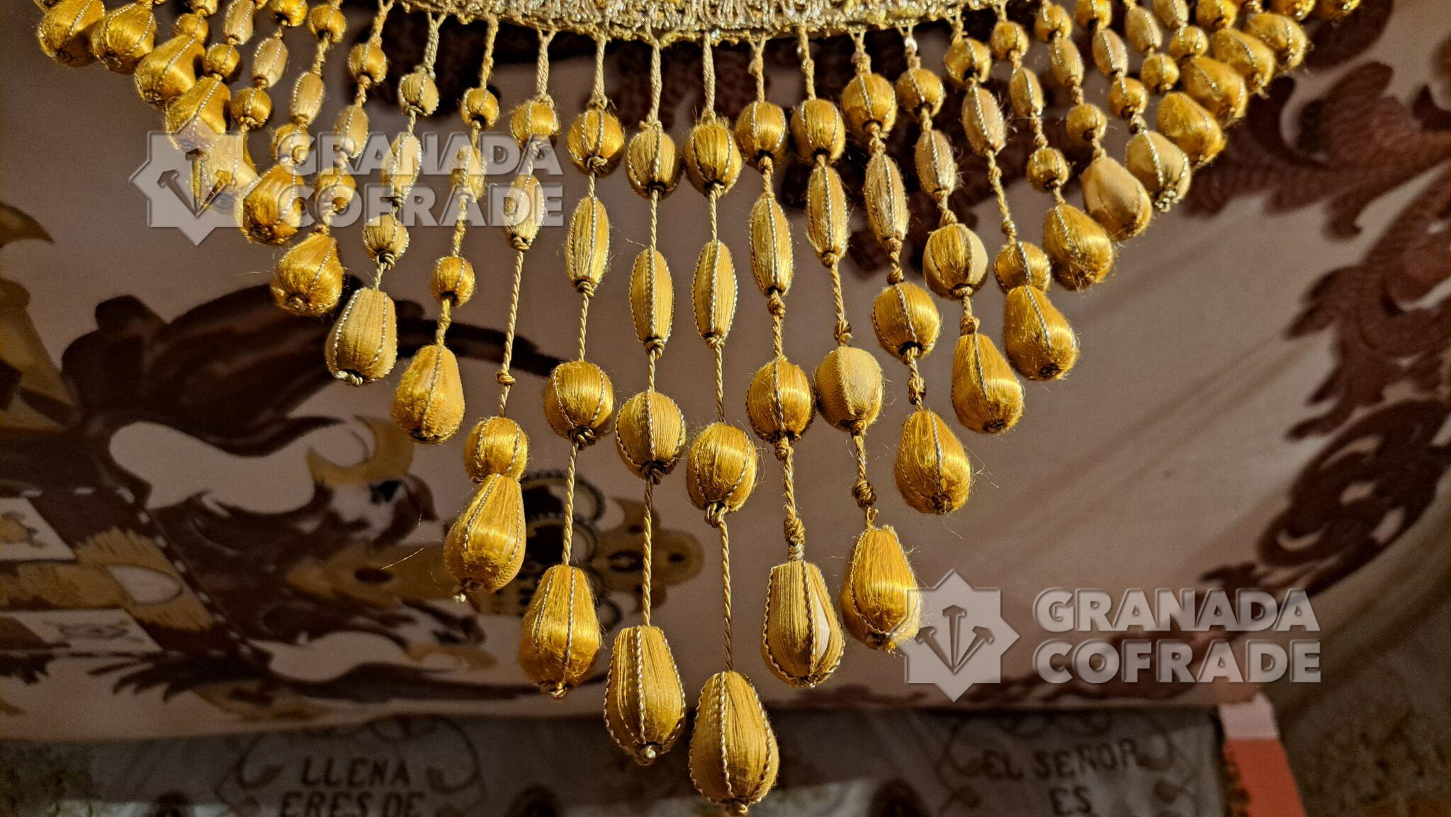 Fernando Egea ha explicado que «se trata de una pieza de calidad excepcional y única también por su valor histórico en el contexto en el que ve la luz, mediados del siglo XIX. Se han recuperado bordados y tejidos, así como 2.000 borlas de las que se han repuesto 200″. El delegado de Turismo, Cultura y Deporte ha aprovechado para resaltar la importancia de la intervención «no sólo como recuperación de un patrimonio histórico y etnológico esencial de nuestra ciudad y en la Semana Santa granadina, sino también como un impulso a las hermandades, que tanto están aportando a la sociedad desde el punto de vista social como patrimonial». Las actuaciones llevadas a cabo han actuado sobre el techo de palio y las cuatro bambalinas. Los trabajos han consistido en la limpieza de la suciedad acumulada sobre el tejido, la eliminación de las manchas de humedad que poseía el palio como consecuencia de las lluvias durante sus estaciones de penitencia, así como la restauración de los bordados.