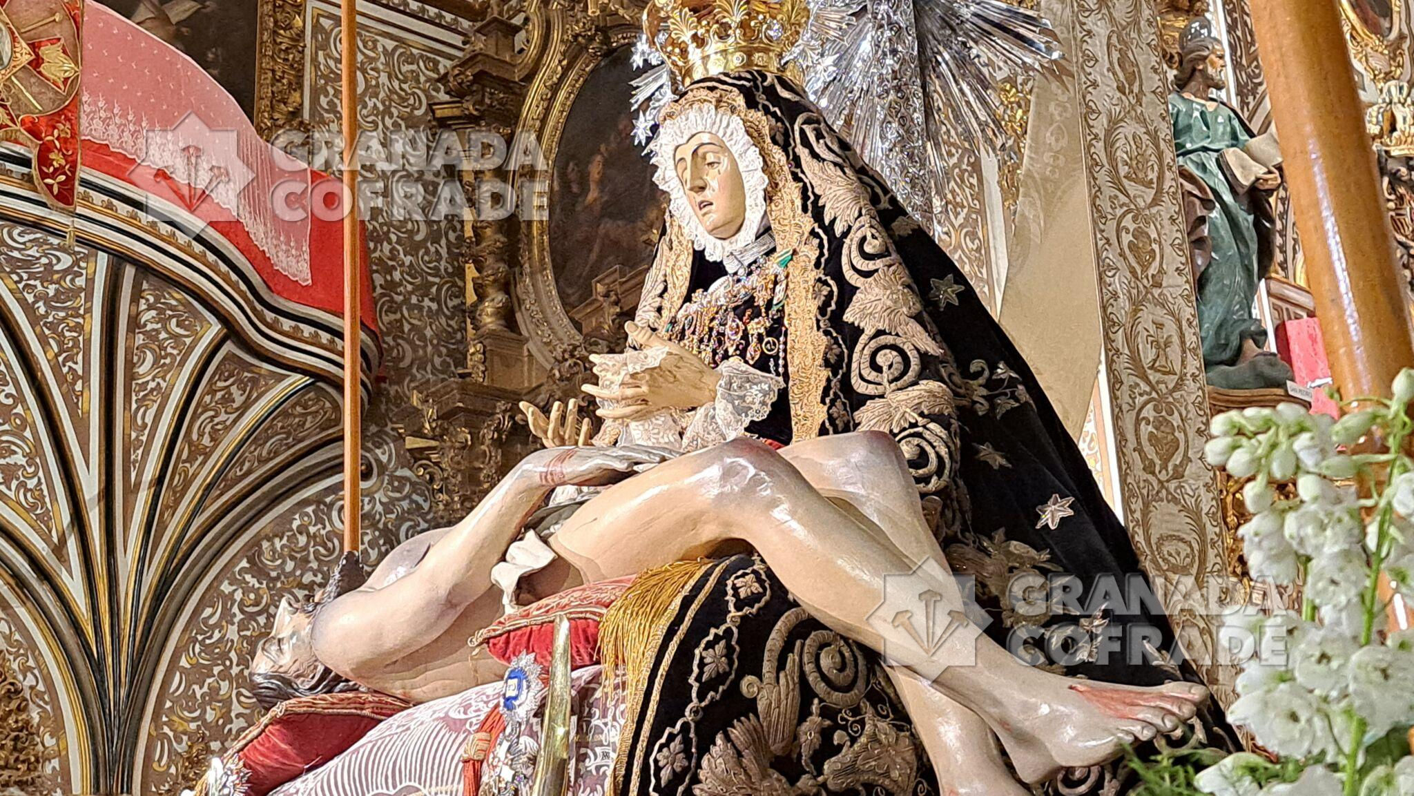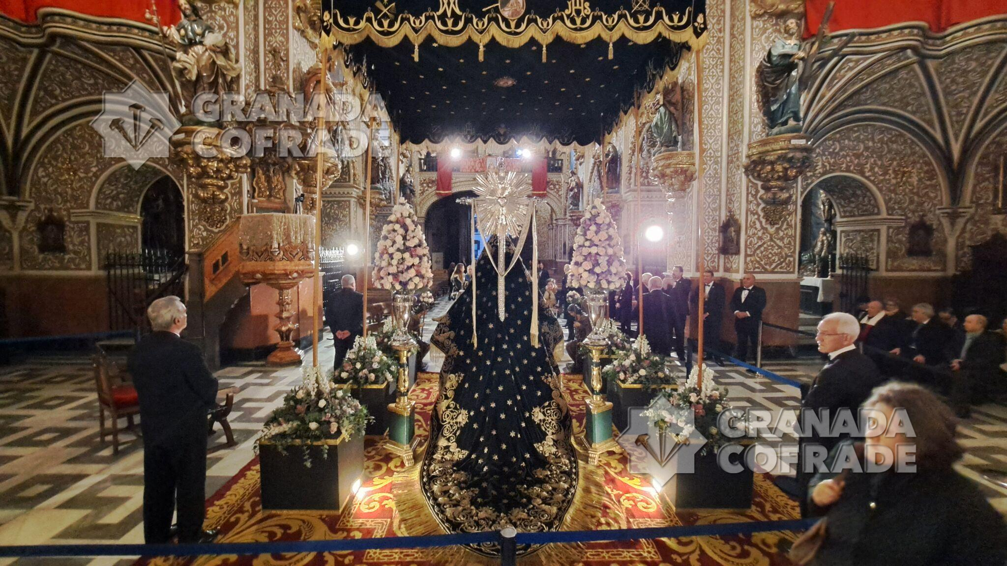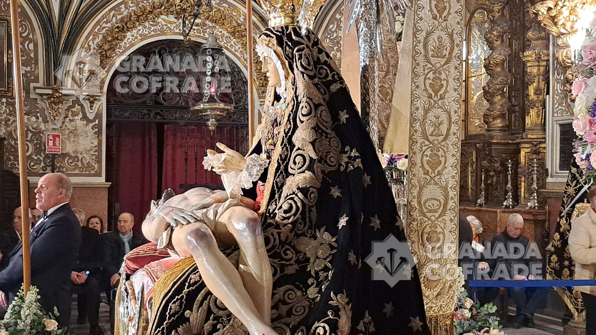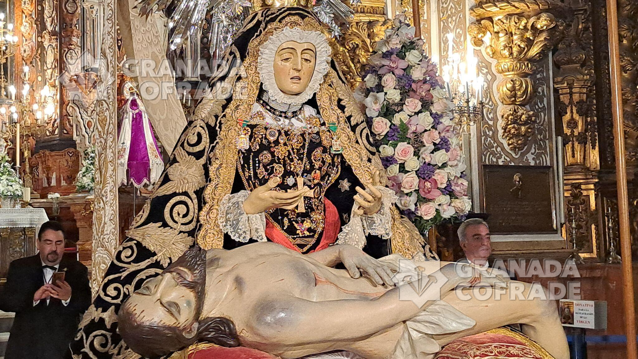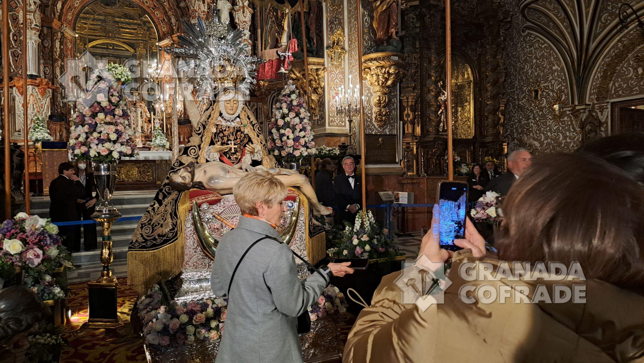 Granada tiene ya de nuevo a la veneración y culto la imagen de la Patrona, Nuestra Señora de las Angustias. Está igual que siempre pero la limpieza realizada por el restaurrador, Dionisio Olgoso, le ha devuelto al policromía original de la imagen, al menos la que se tiene constancia de ser completa. La imagen de Nuestra Señora se presentaba vistiendo toda la vestimenta y regalos de Isabel II. Su manto de estrellas, su corona, el antipendio que cubre la mesa sobre la que se soporta la imagen del Señor Yacente, así como los cojines que sujeta la cabeza y piernas del Señor. A los pies, el bastón de mando donado por el nieto de la reina Isabel, Alfonso XIII y Ella bajo su palio sustentado sobre seis varales. Una presentación extraordinaria para una ocasión excepcional. «Estamos muy contentos y no cabemos en nosotros», indicó a GRANADA COFRADE el hermano mayor, Antonio González, quien refirió también que se mostraba muy orgulloso de la cantidad de gente que estaba acompañando a la Virgen en esta jornada y del resultado de la intervención de Dionisio Olgoso.