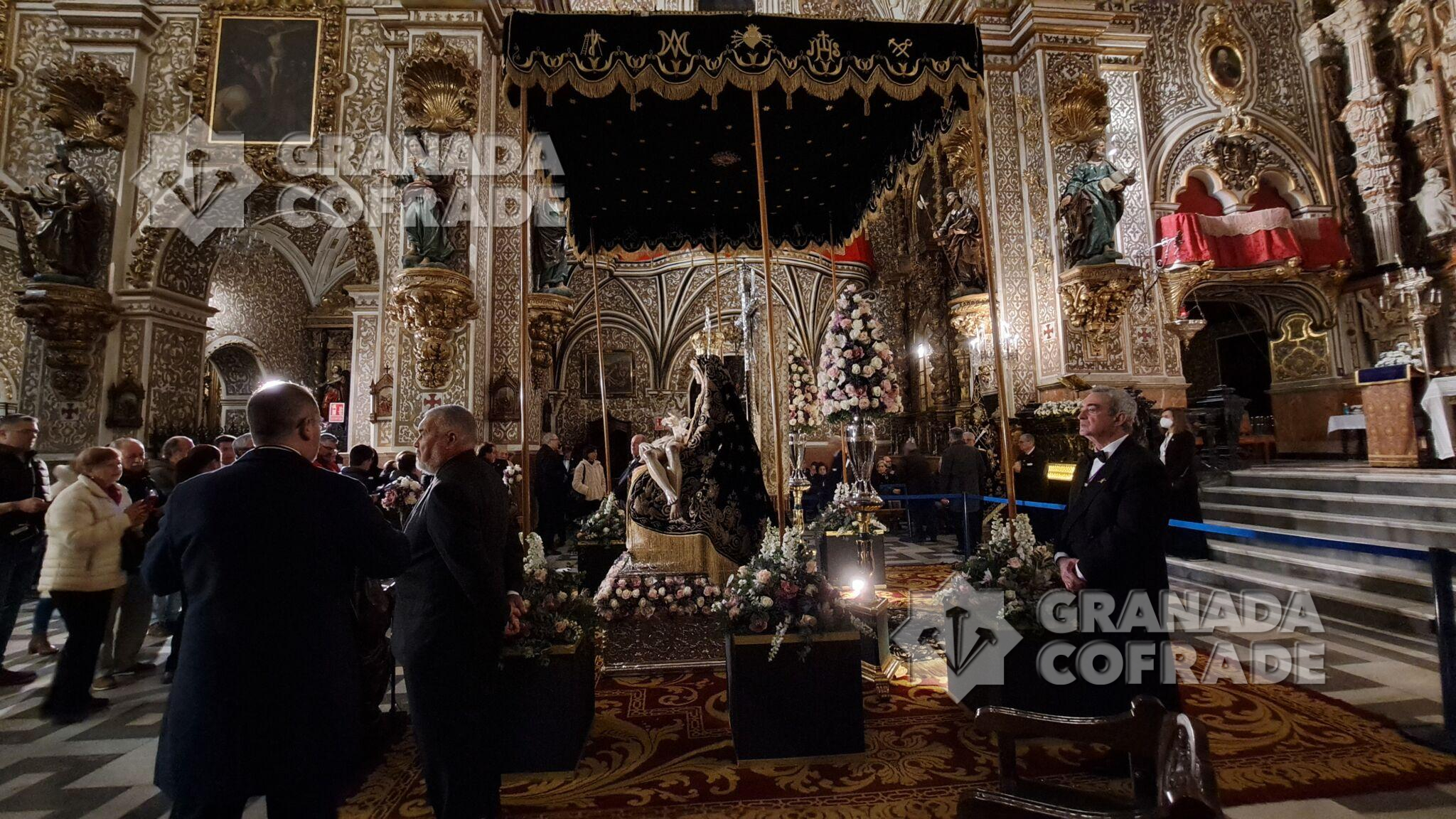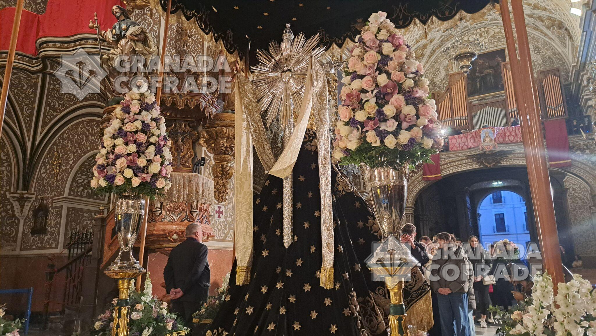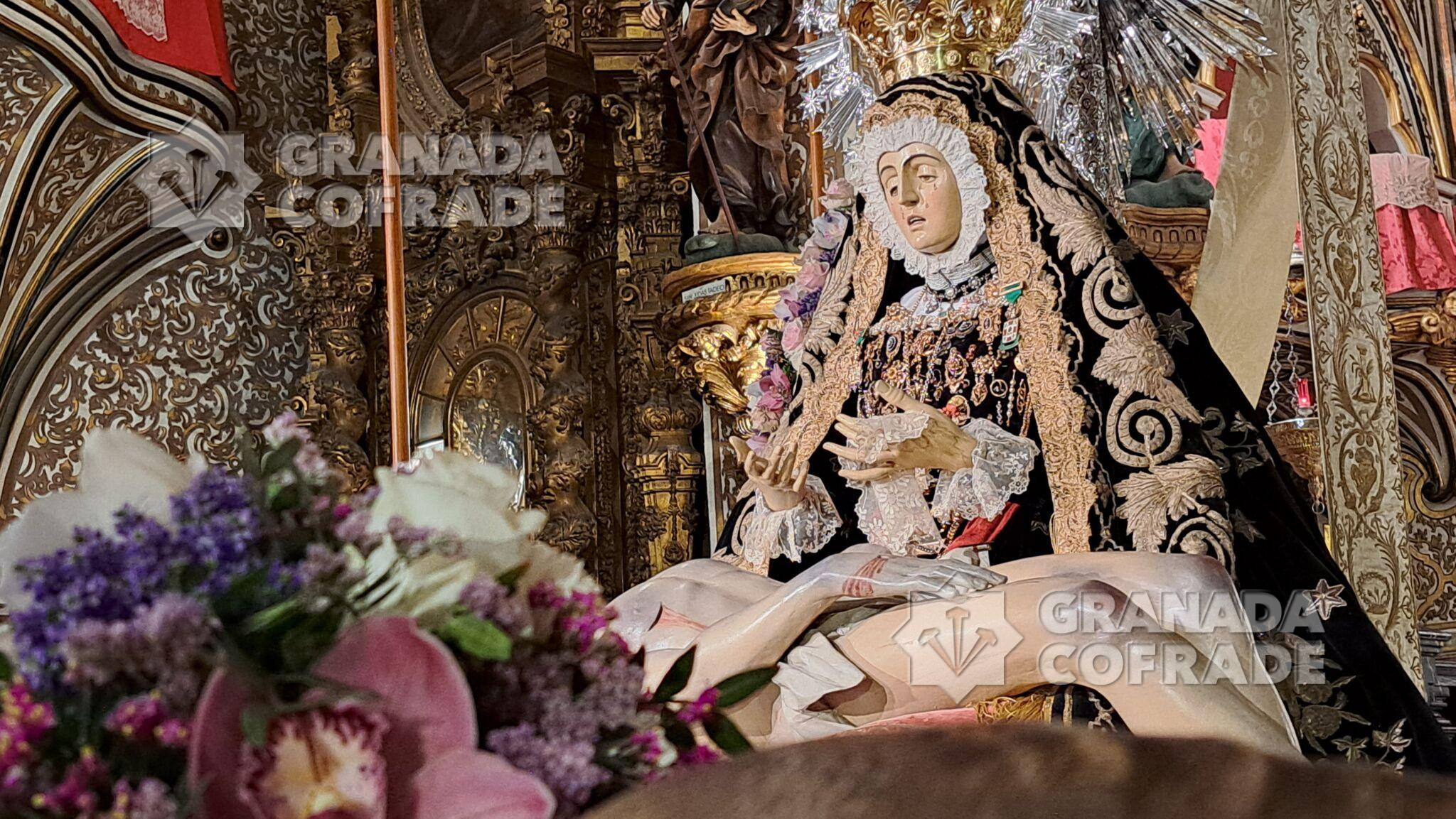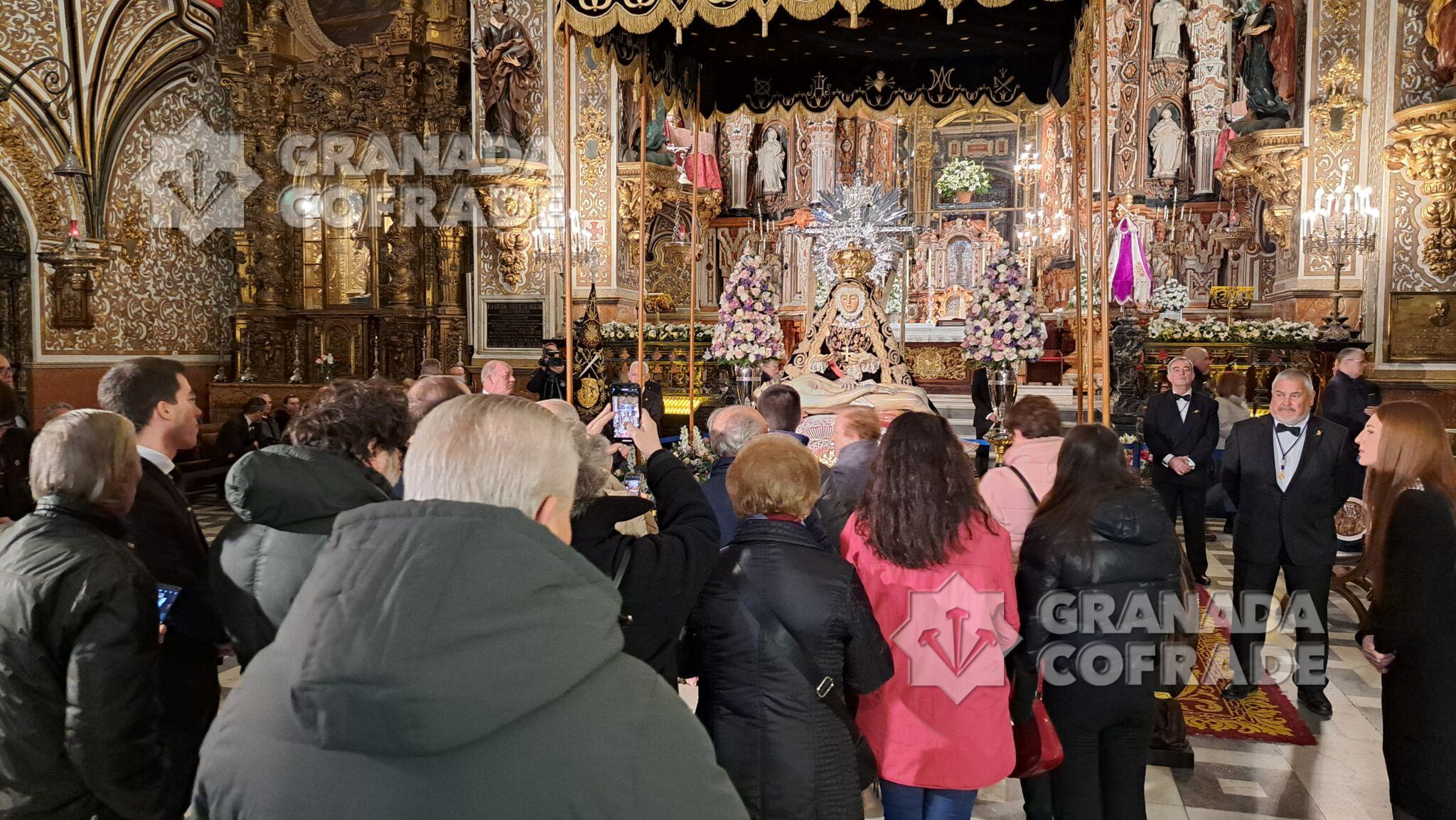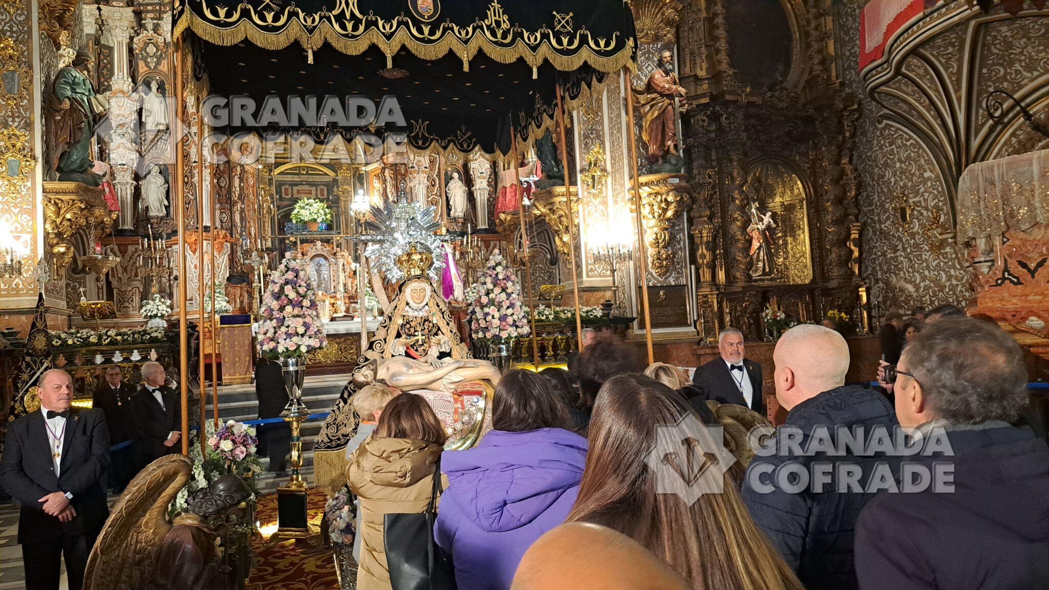 Granada tiene ya de nuevo a la veneración y culto la imagen de la Patrona, Nuestra Señora de las Angustias. Está igual que siempre pero la limpieza realizada por el restaurrador, Dionisio Olgoso, le ha devuelto al policromía original de la imagen, al menos la que se tiene constancia de ser completa. La imagen de Nuestra Señora se presentaba vistiendo toda la vestimenta y regalos de Isabel II. Su manto de estrellas, su corona, el antipendio que cubre la mesa sobre la que se soporta la imagen del Señor Yacente, así como los cojines que sujeta la cabeza y piernas del Señor. A los pies, el bastón de mando donado por el nieto de la reina Isabel, Alfonso XIII y Ella bajo su palio sustentado sobre seis varales. Una presentación extraordinaria para una ocasión excepcional. «Estamos muy contentos y no cabemos en nosotros», indicó a GRANADA COFRADE el hermano mayor, Antonio González, quien refirió también que se mostraba muy orgulloso de la cantidad de gente que estaba acompañando a la Virgen en esta jornada y del resultado de la intervención de Dionisio Olgoso.
