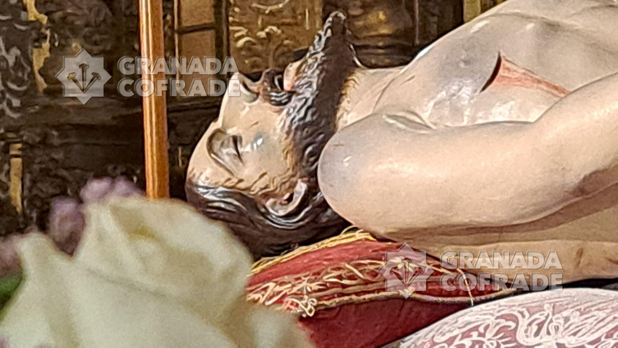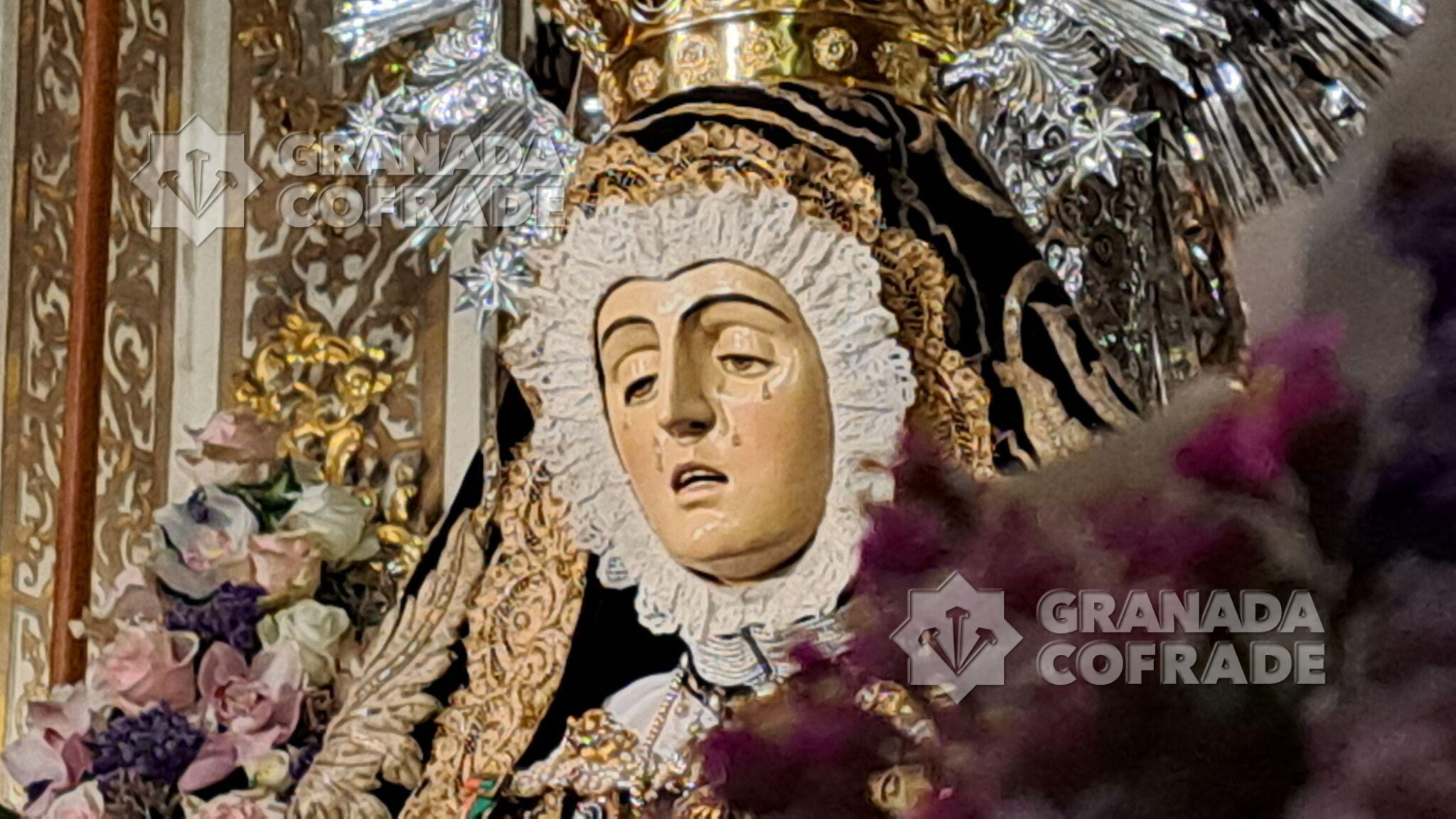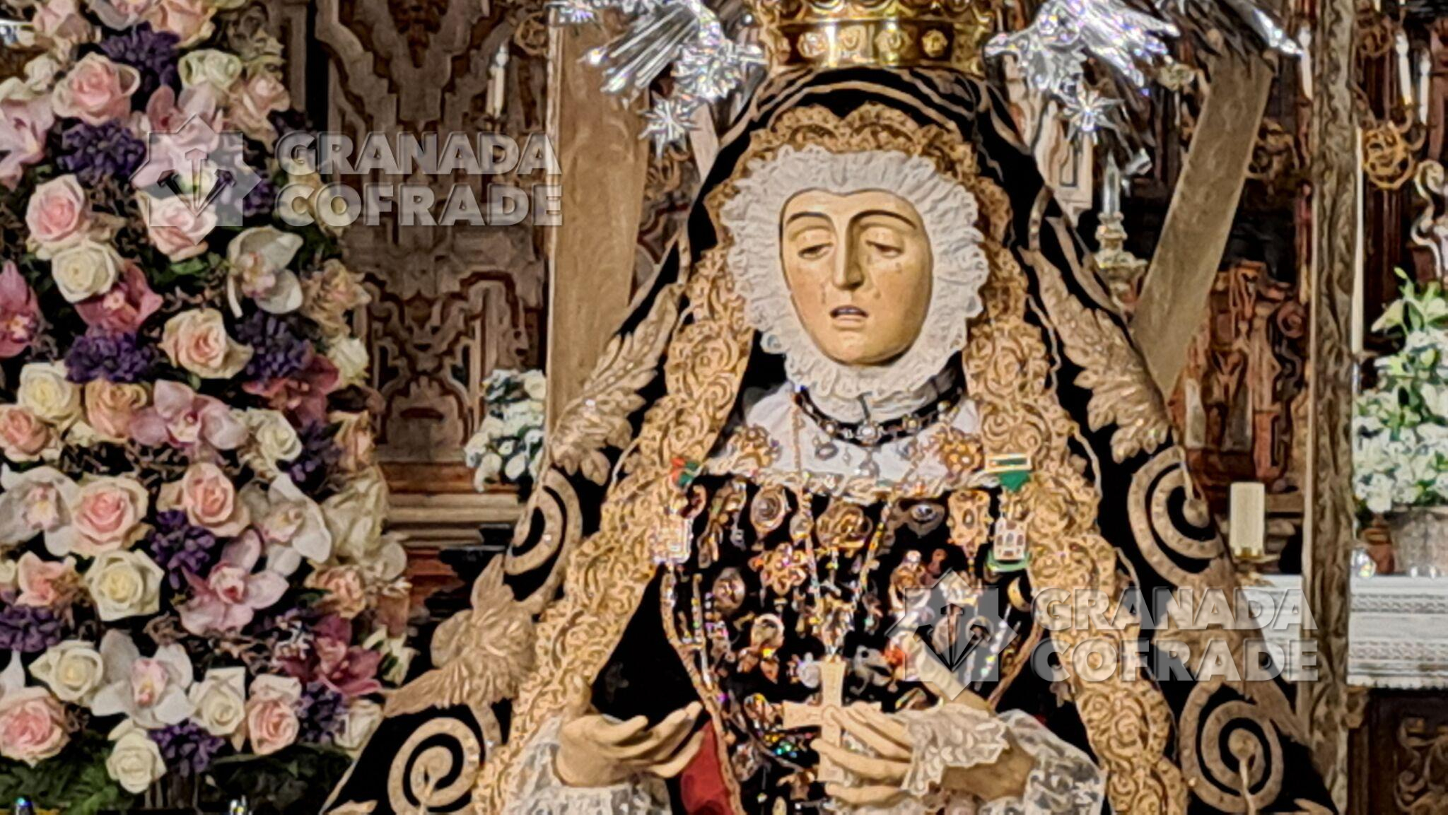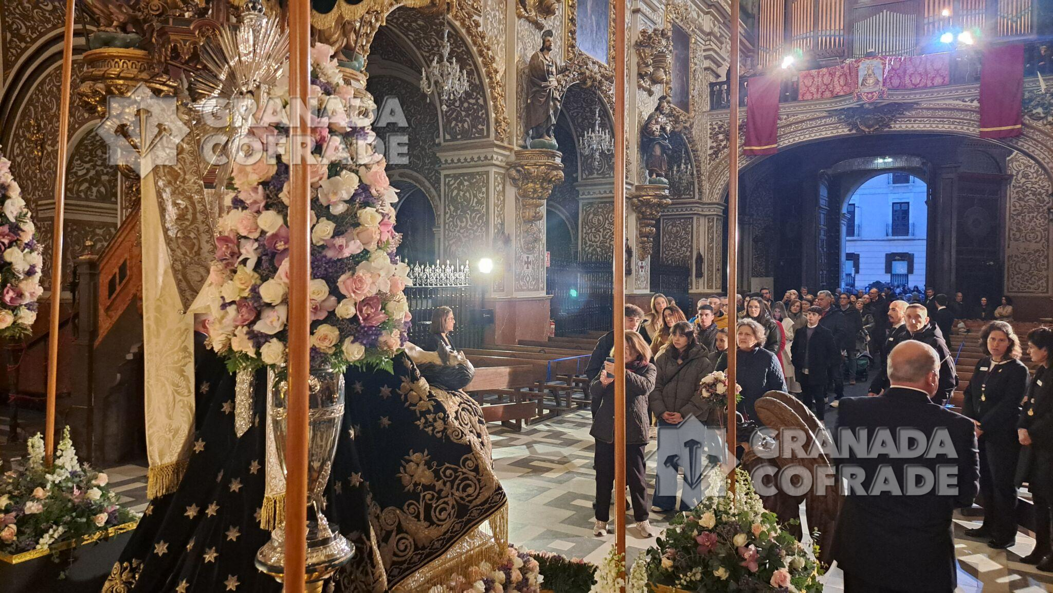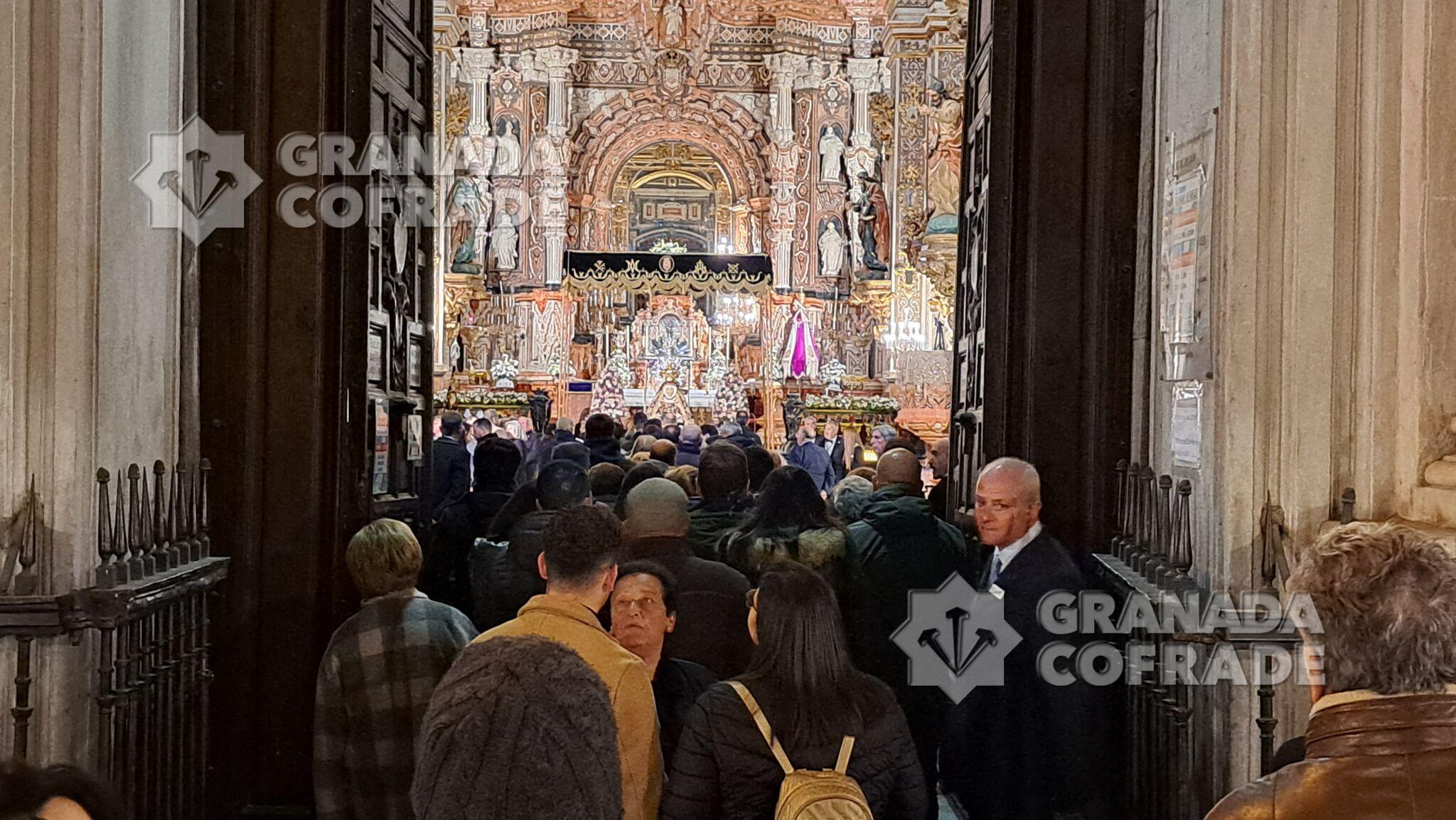 Granada tiene ya de nuevo a la veneración y culto la imagen de la Patrona, Nuestra Señora de las Angustias. Está igual que siempre pero la limpieza realizada por el restaurrador, Dionisio Olgoso, le ha devuelto al policromía original de la imagen, al menos la que se tiene constancia de ser completa. La imagen de Nuestra Señora se presentaba vistiendo toda la vestimenta y regalos de Isabel II. Su manto de estrellas, su corona, el antipendio que cubre la mesa sobre la que se soporta la imagen del Señor Yacente, así como los cojines que sujeta la cabeza y piernas del Señor. A los pies, el bastón de mando donado por el nieto de la reina Isabel, Alfonso XIII y Ella bajo su palio sustentado sobre seis varales. Una presentación extraordinaria para una ocasión excepcional. «Estamos muy contentos y no cabemos en nosotros», indicó a GRANADA COFRADE el hermano mayor, Antonio González, quien refirió también que se mostraba muy orgulloso de la cantidad de gente que estaba acompañando a la Virgen en esta jornada y del resultado de la intervención de Dionisio Olgoso.