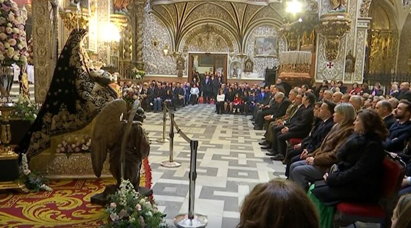 Lleno total en el interior de la basílica de Nuestra Señora de las Angustias para asistir a la Fiesta de la Aparición de Nuestra Señora que se celebra cada mes de febrero. Por motivos de la restauración de la imagen de la Patrona la fecha se ha adecuado a fin de poderla celebra con la Ella ya restaurada. Se presentaba la Patrona de Granada en un altar situado en el crucero de la basílica, en el lado del Evangelio, sobre la peana tal y como el día anterior se pudo venerar pero en este caso sin el palhio y con un fondo que recrea el cuadro de la sacristía de la Aparición de Nuestra Señora, obra de hace casi un siglo de José Suárez Peregrín.