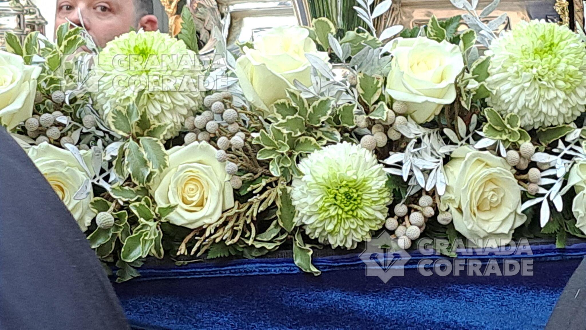 Las andas de traslado, dirigidas bajo el martillo de David Barranco y su equipo, se presentaron con un exorno floral de una manera sobria y elegante, con rosas en color blanco roto y rellenos de verdes variados.