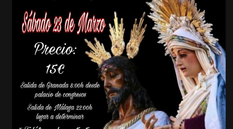 La Asociación Cultural y Cofrade «Anima Christi» organiza un viaje a la vecina capital malagueña para acompañar al Señor de Málaga, Jesús Cautivo, en su tradicional traslado y visita al hospital. Será el Sábado de Pasión, 23 de marzo, con salida desde Granada a las ocho de la mañana y desde el Palacio de Congresos. El regreso está previsto a las diez de la noche con lo que durante la tarde se podrán visitar casas de hermandad y otros traslados y procesiones de vísperas.