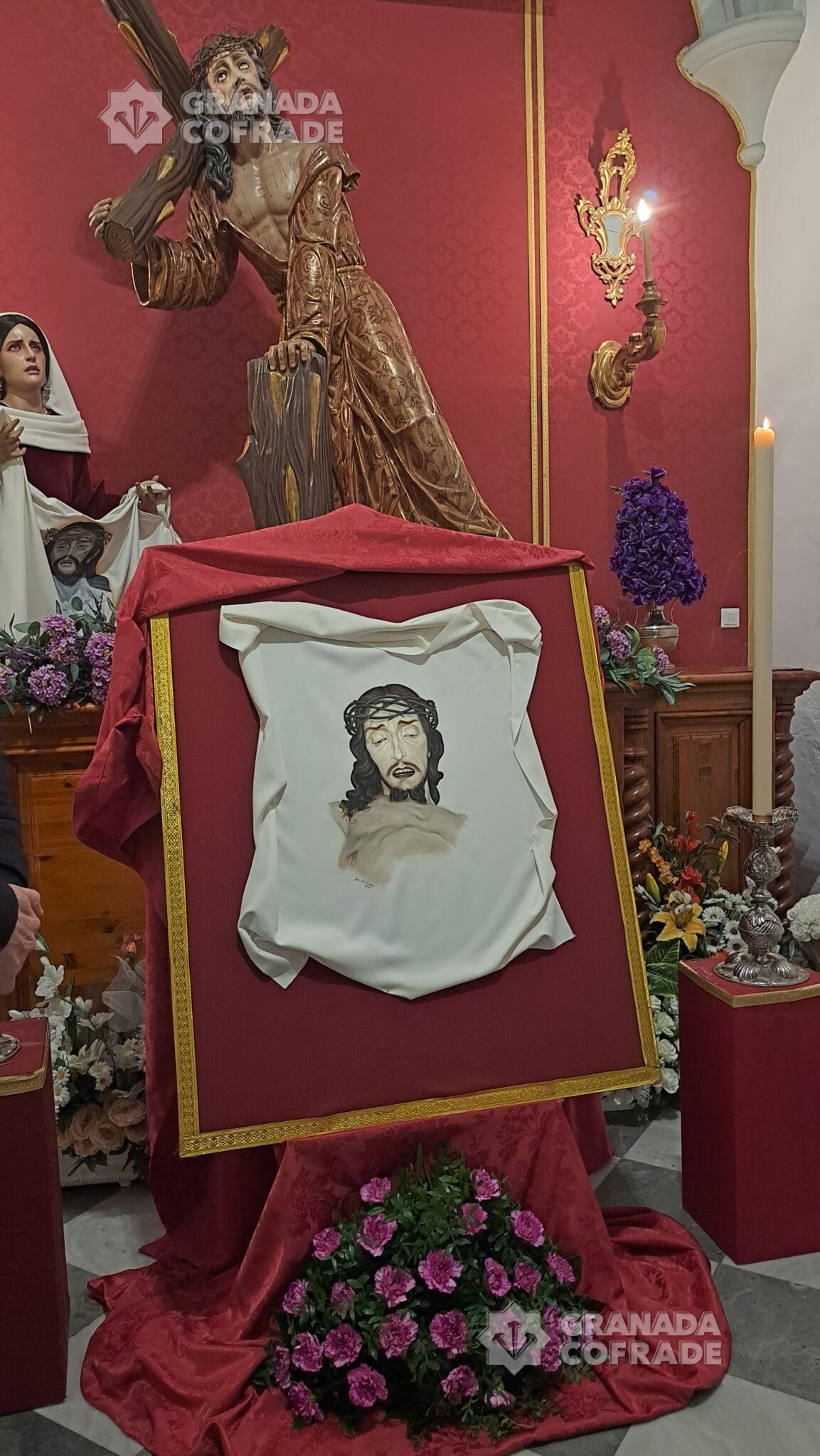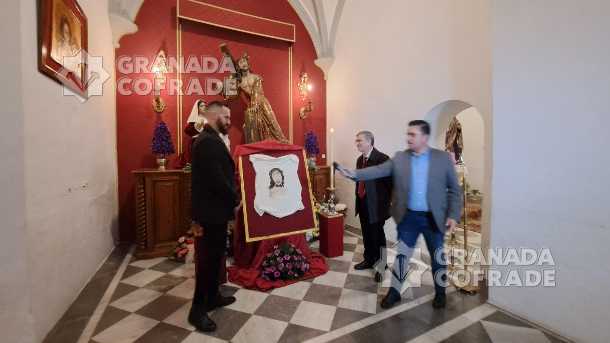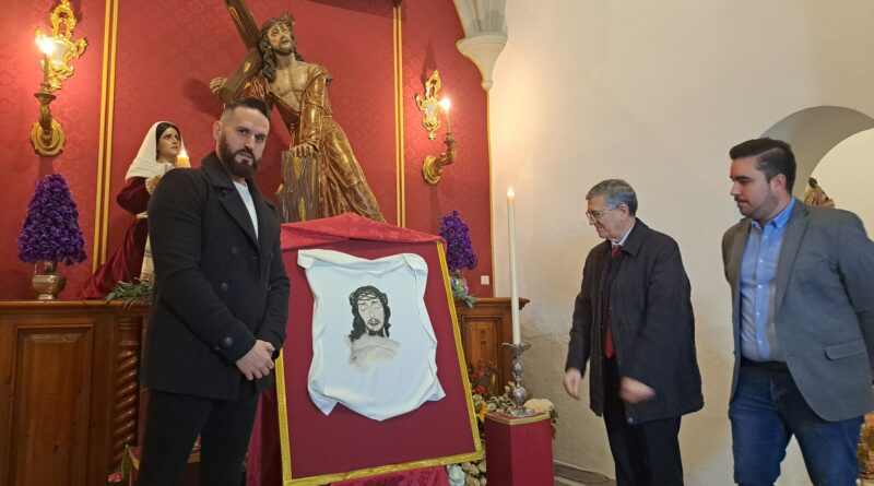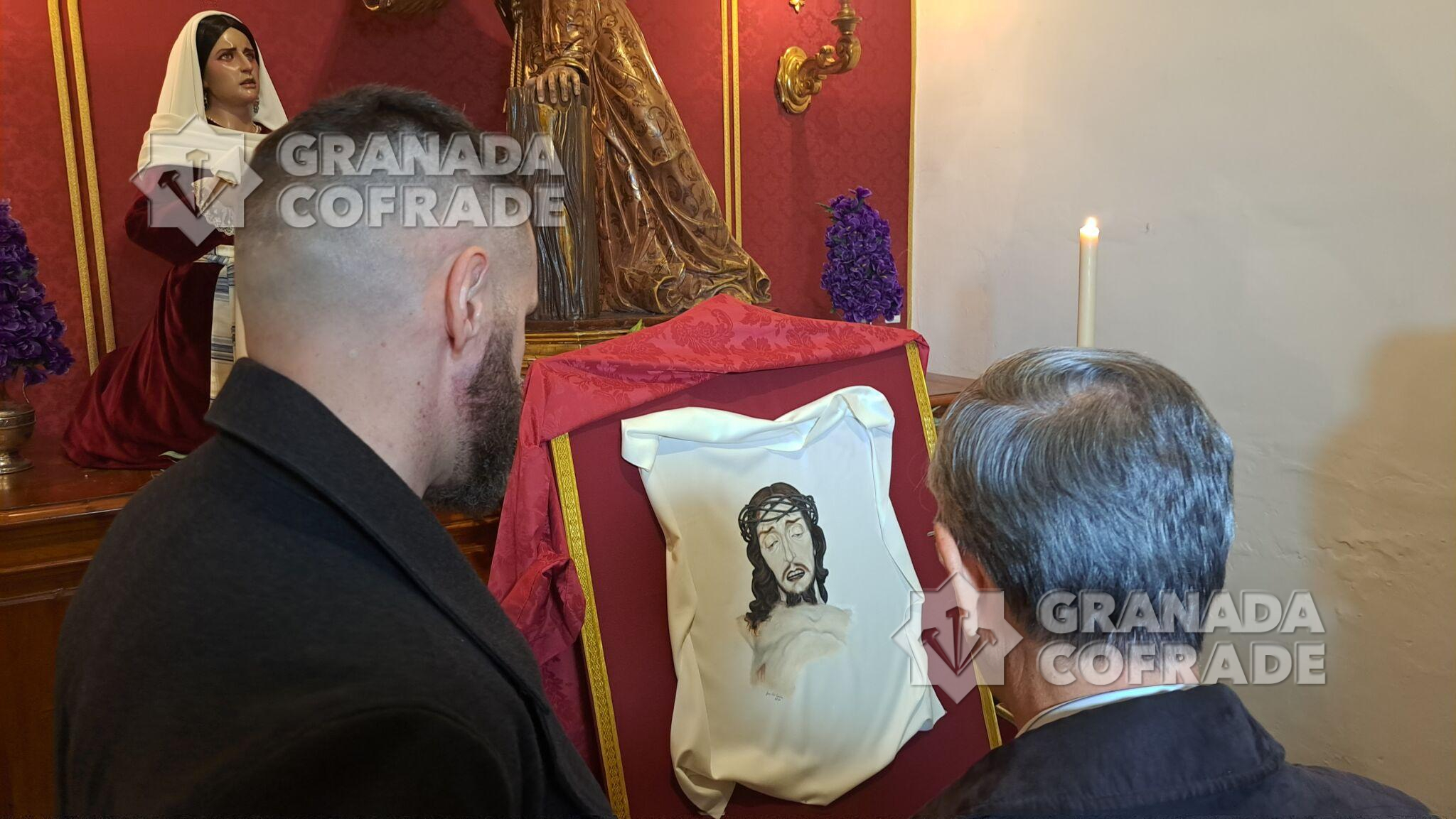 La hermandad del Cristo del Trabajo, representada por un alto número de hermanos, acudió a la cita de la presentación del paño de la Mujer Verónica que, por décio año consecutivo sale de las manos del pintor y hermano de la corporación Juan Antonio Galdón. «Además de hacer un homenaje al centenario del Cristo de la Misericordia también he querido recordar así el tercer centenario del fallecimiento de José de Mora», reflejó a nuestra redacción el pintor que ha conseguido nuevamente una pintura sobre sarga en color blanco roto, de alta calidad y realismo. «He usado acrílico principalmente aunque este año también he utilizado un poco el lápiz para profundizar en las sombras, en la sangre y detalles. Luego le he dado una imprimación de barnices para proteger la pintura».