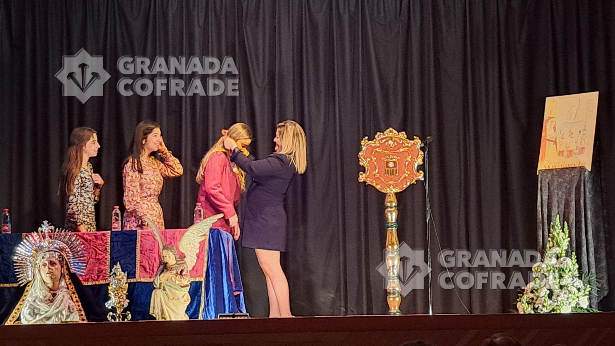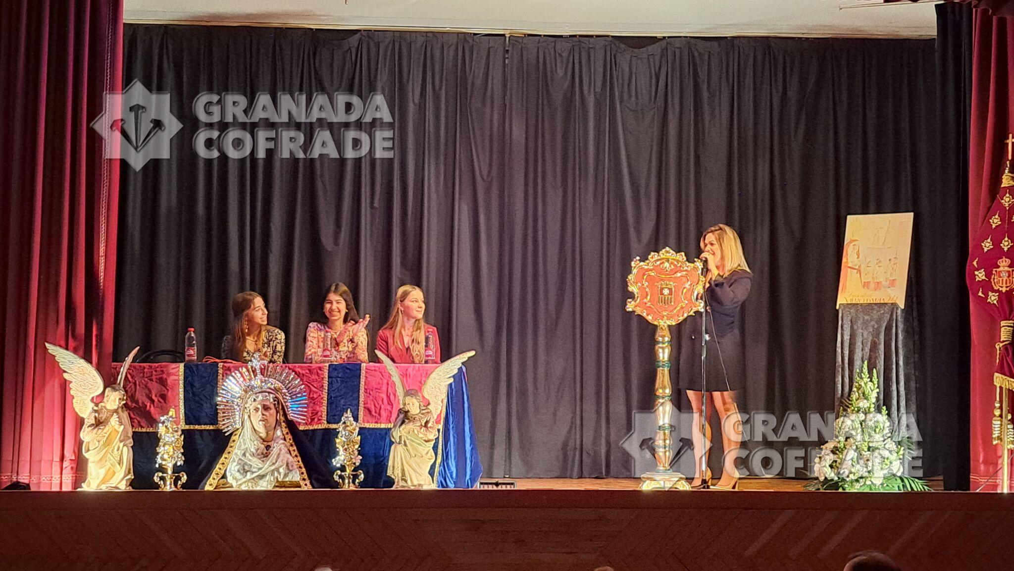 Ante un escenario del colegio ella se brindó a anunciar la salida, precedida por la pregonera del pasado año, Lucía Serrano Alonso, que fue la encargada de darle la palabra y adelantar el cartel que anuncia la salida, obra de Luis Serrano, con la imagen presidiéndolo de Jesús de la Caridad.
