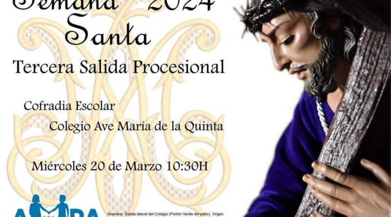Mañana miércoles, día 20 de marzo, saldrá procesionalmente la cofradía infantil y juvenil en su tercera edición, desde el Colegio Ave María «La Quinta». Un recorrido que se iniciará por la salida de la puerta lateral del colegio por el Portón Verde del Patio, calle Virgen de Montserrat, Mesón del Toledano, Virgen del Rocío, Sancho Panza, Avenida de Cervantes -por la Vía de Servicio- y calle Virgen de Monserrat para regresar al colegio. Salida 10.30 horas.