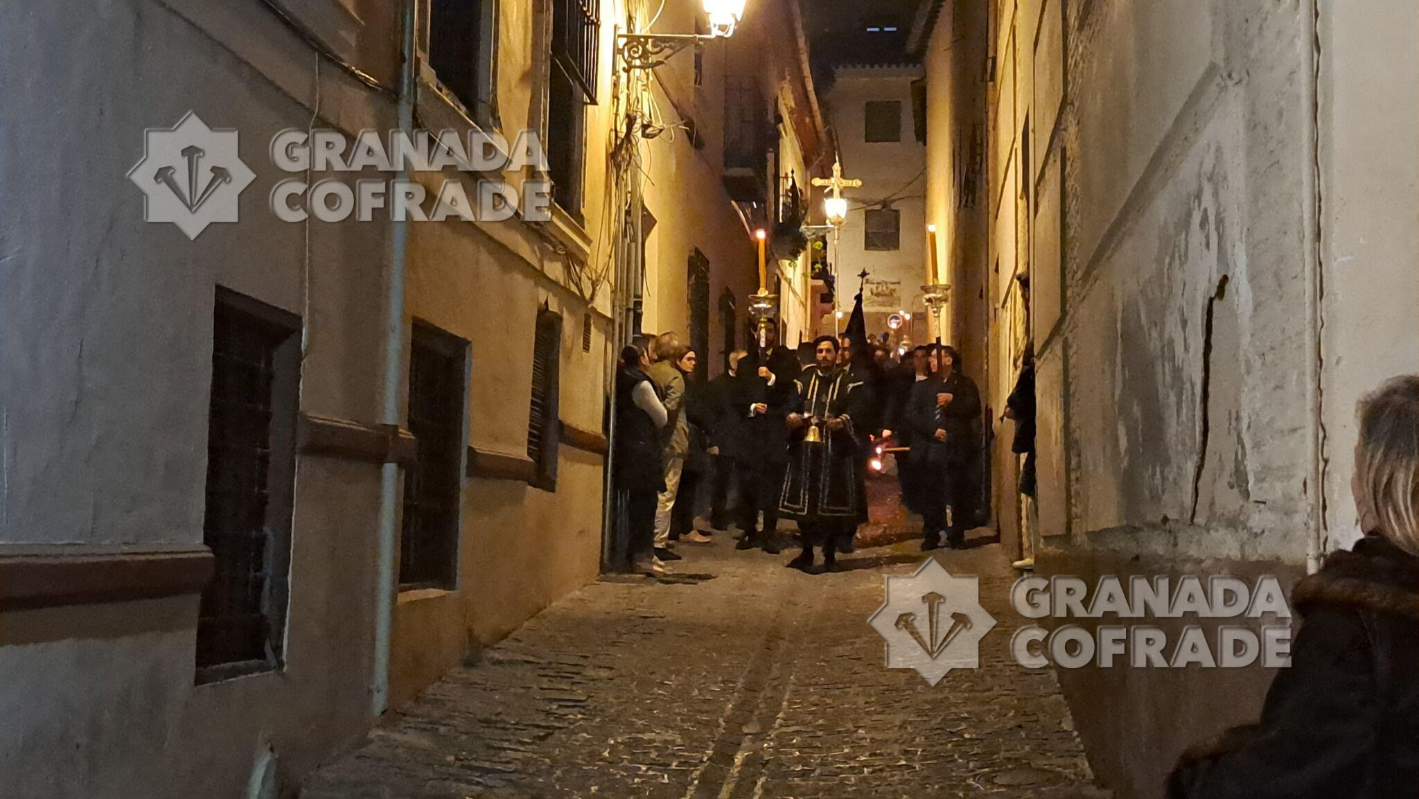 Por el entramado de calles del Bajo Albaicin, desde San Pedro y San Pablo para subir a San Juan de los Reyes por Cárcel Alta y llegar después a Carrera del Darro, trascurrió el Vía Crucis penitencial de la hermandad del Santo Sepulcro. Estaba presidido por la imagen del Cristo Yacente sobre catafalco de maderera y custodiado por cuatro guardabrisas del paso de la Urna de Cristo. En el cortejo participaban cinco parejas de hermanos precedidos por el muñidor y la campana confiriendo una presencia silente e impactante para los muchos visitantes y granadinos que paseaban por el entorno de la Carrera del Darro entre San Pedro y San Pablo y la parroquial de San Gil y Santa Ana.