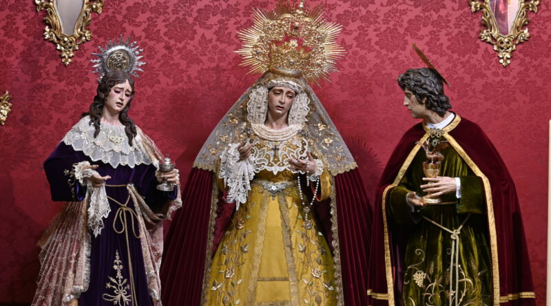 La Virgen de Consolación se presenta estrenando esta nueva saya con motivos sacramentales y manto rojo, para este Tiempo de la Pascua de Resurrección, por su vestidor, Francisco Garví Fernández.