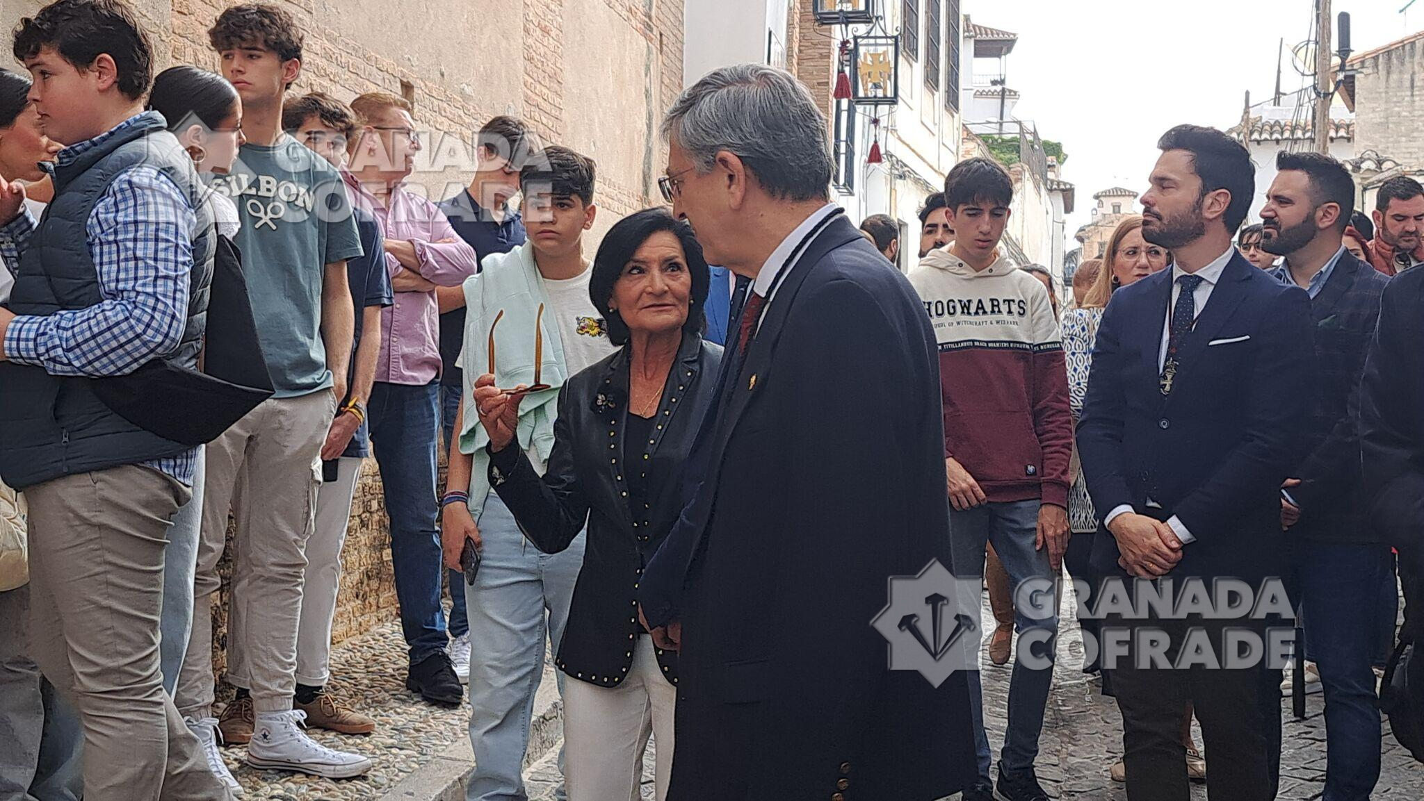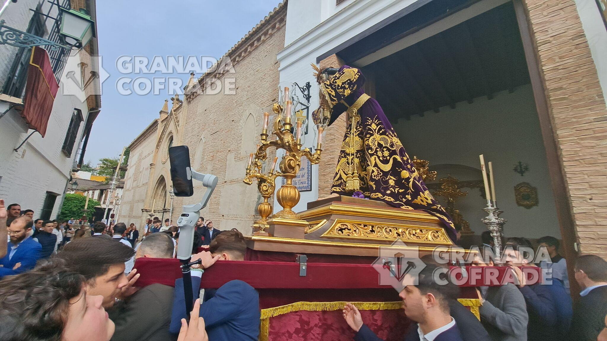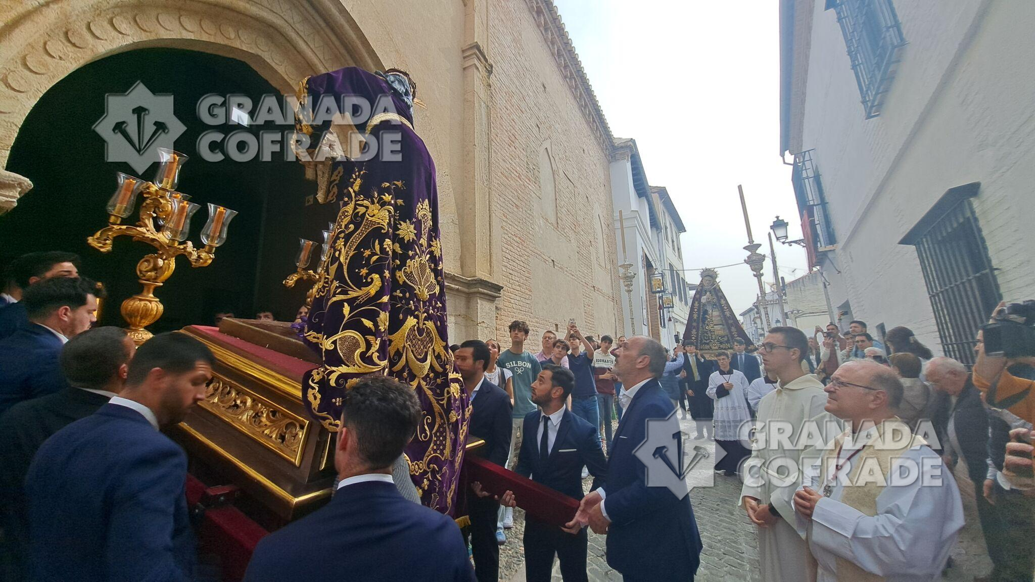 Treinta metros de trayecto, pero suficientes para mostrar el recogimiento de un traslado sencillo y directo a los sentimientos. Así se desarrolló durante poco más de un cuarto de hora el traslado de los Titulares de la cofradía decana del Vía Crucis en la mañana de ayer, precediendo a la celebración de la Eucaristía que presidió el rector del templo de San Juan de los Reyes, Manuel García Gálvez. Un nutrido grupo de hermanos y cofrades granadinos acudieron a la cita para devolver a los Titulares de la corporación nazarena del Martes Santo desde su capilla de salida, unida al templo rectoral de la calle San Juan de los Reyes. Una mañana de sol que recibía al Nazareno de José de Mora vistiendo la túnica color berenjena y bordada en oro por Sebastián Marchante, la misma que lució el Martes Santo a pesar de la lluvia caída y que pudieron contemplar los cientos de granadinos que acudieron a venerar a los Titulares en su capilla. Cuerpo litúrgico en ambos andas de traslado portadas a las órdenes de Dionisio Martínez y de Eduardo Salamanca Rodríguez, respectivamente.