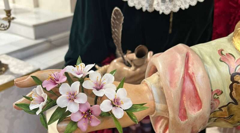 Nuestra Señora de la Alegría, Titular de la Hermandad del Resucitado, estrenó el pasado sábado la donación de un ramillete de flor de almendro, artesanía de los trabajos florales sevillanos Santa Balbina, y que portaba en su mano derecha. Fue obsequio de un hermano con motivo de la celebración de su besamanos y Eucaristía de acción de gracias por el pasado Domingo de Resurrección,