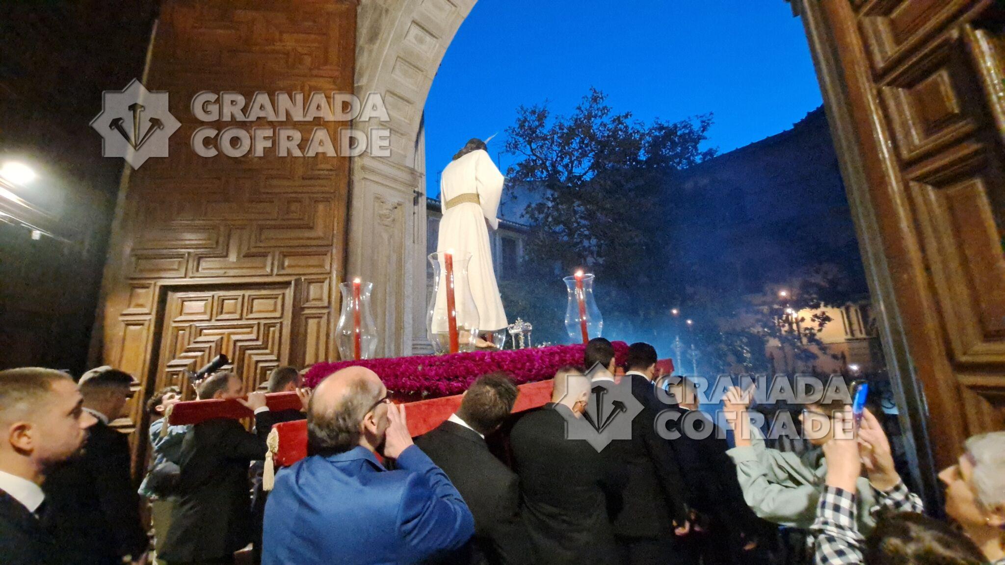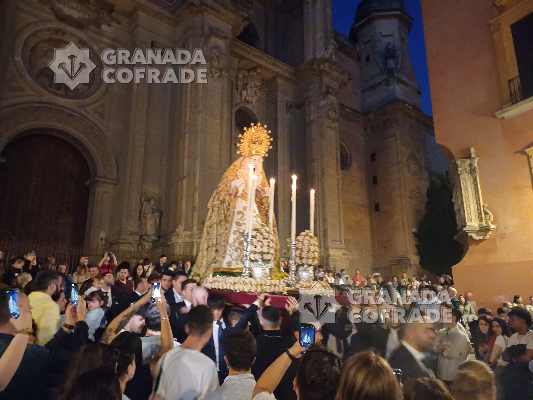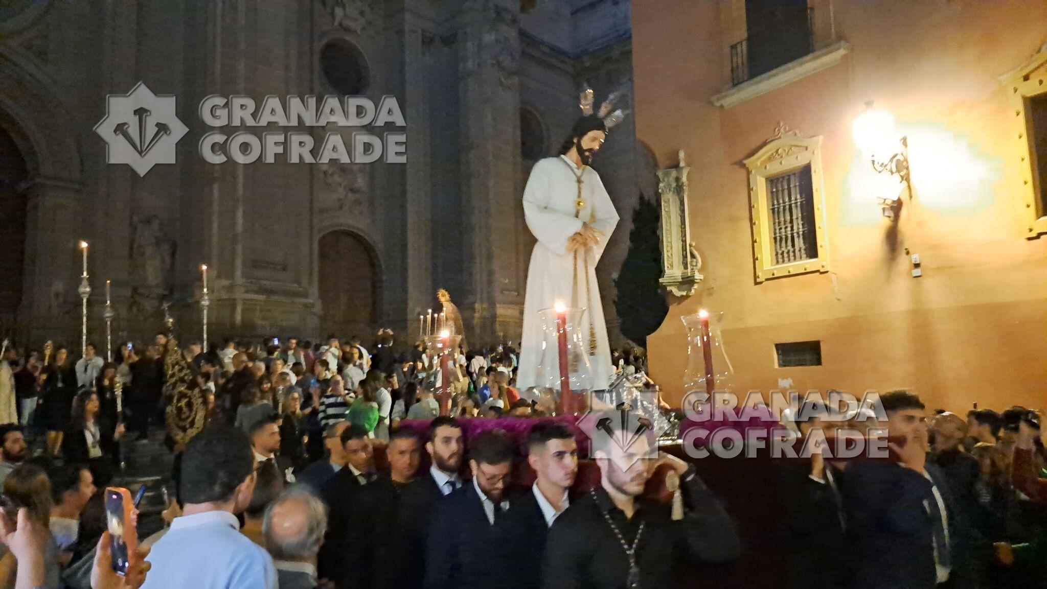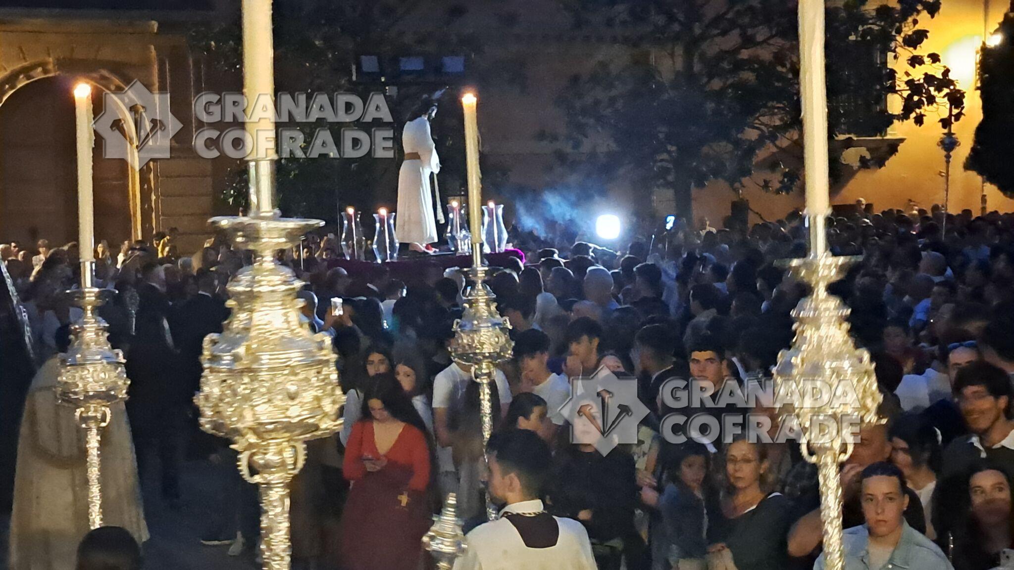 Las andas de María Santísima de la Encarnación cerraban el cortejo que bajó por Marques de Gerona para seguir por Mesones a plaza de la Trinidad, Duquesa, Málaga, Escuelas y plaza de la Universidad. Siguieron por calle San Jerónimo para girar hacia Arandas y Niños Luchando llegando a las once de la noche a su sede canónica, contemplados los Titulares por las monjas Siervas de María, apostadas en los balcones del contiguo templo. Las andas de Jesús Cautivo se adornaban con clavel morado y el de la Virgen de la Encarnación, con clavel en friso y dos jarras frontales, en tonalidad blanca y rosa muy suave.