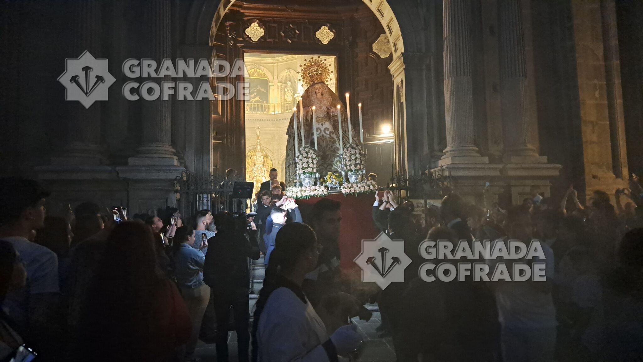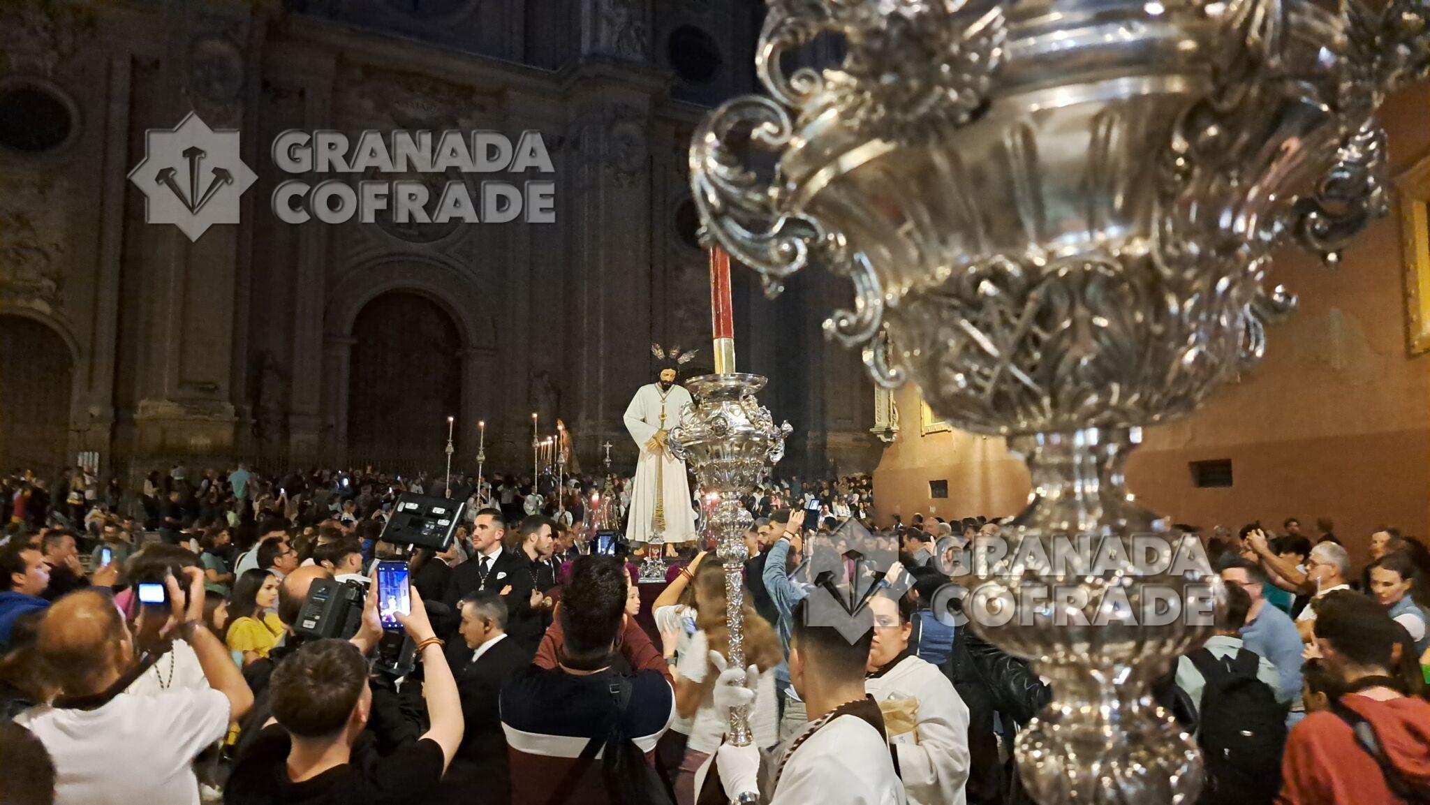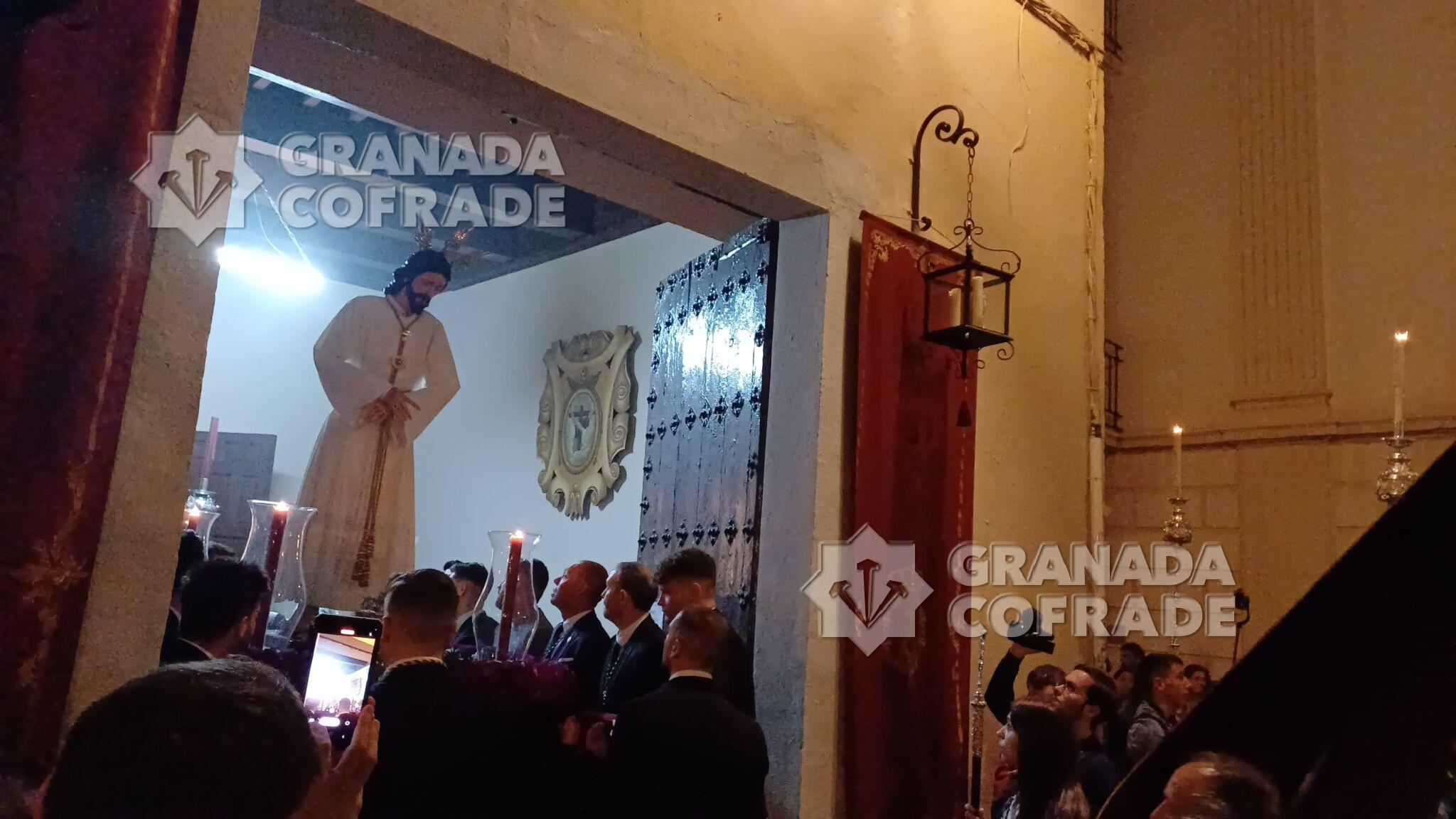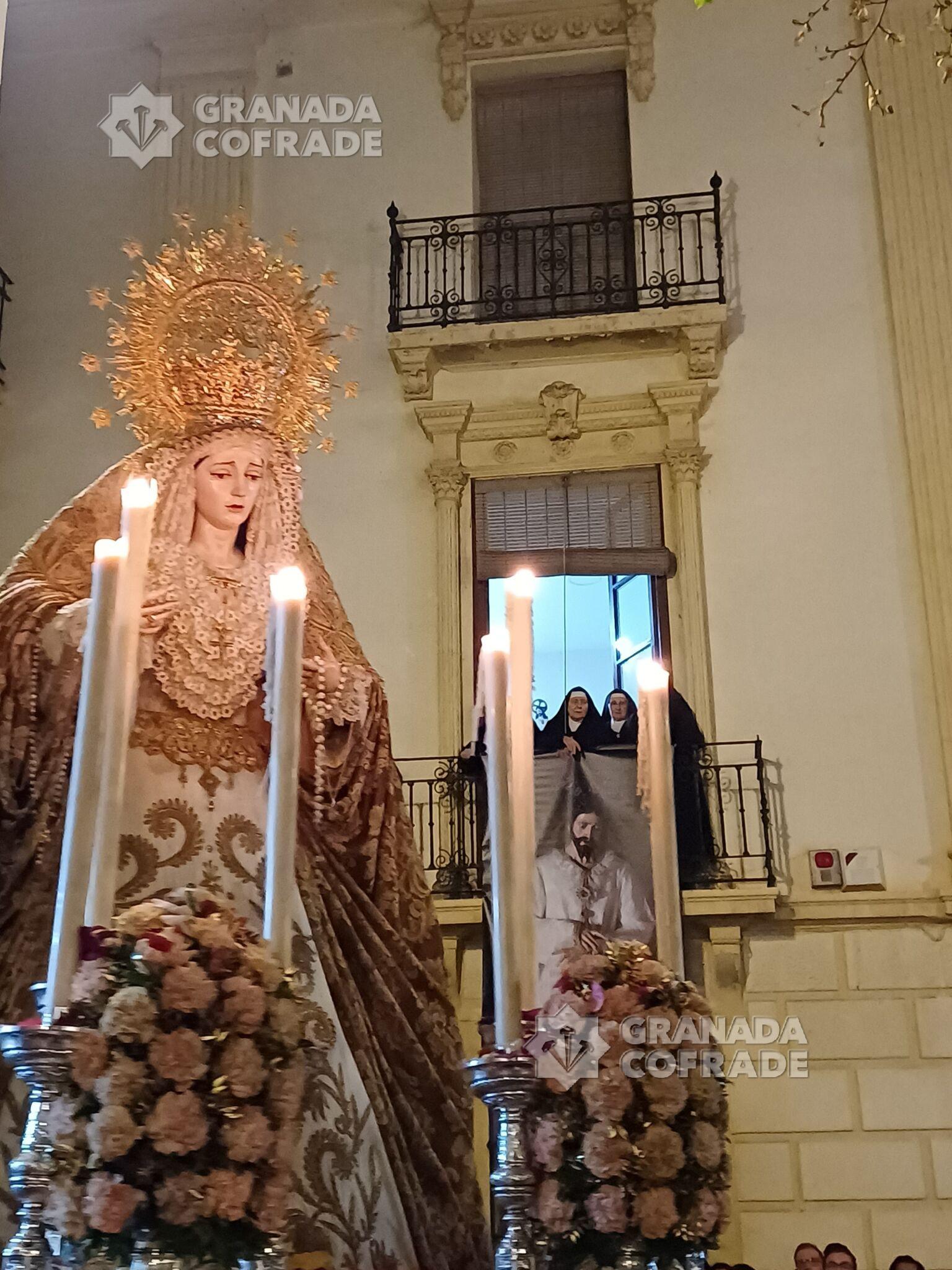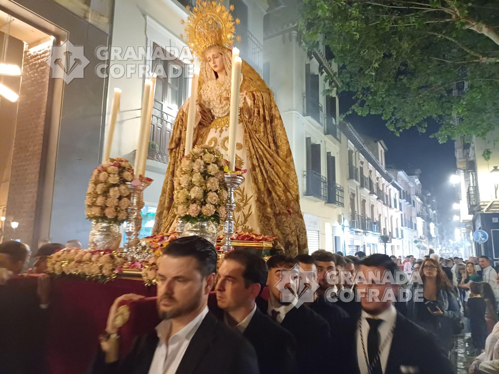 Las andas de María Santísima de la Encarnación cerraban el cortejo que bajó por Marques de Gerona para seguir por Mesones a plaza de la Trinidad, Duquesa, Málaga, Escuelas y plaza de la Universidad. Siguieron por calle San Jerónimo para girar hacia Arandas y Niños Luchando llegando a las once de la noche a su sede canónica, contemplados los Titulares por las monjas Siervas de María, apostadas en los balcones del contiguo templo. Las andas de Jesús Cautivo se adornaban con clavel morado y el de la Virgen de la Encarnación, con clavel en friso y dos jarras frontales, en tonalidad blanca y rosa muy suave.