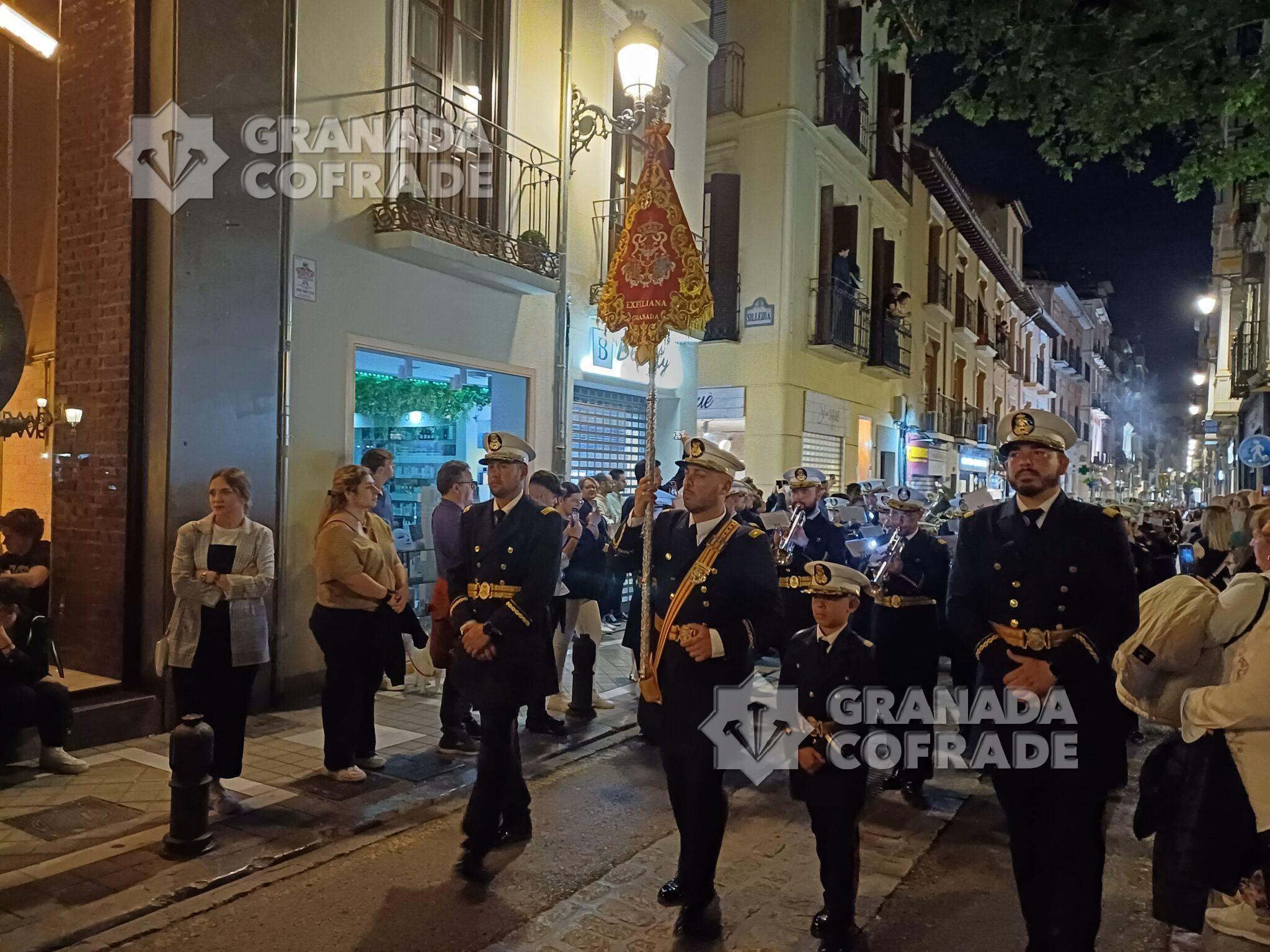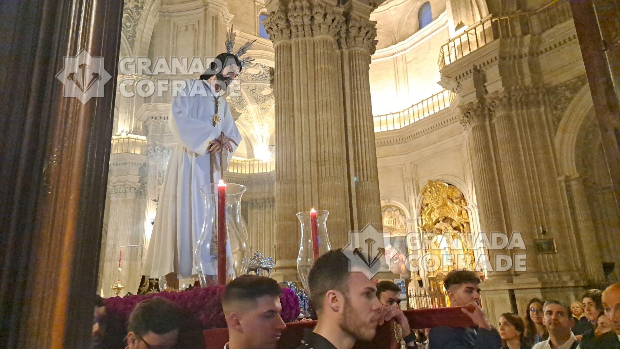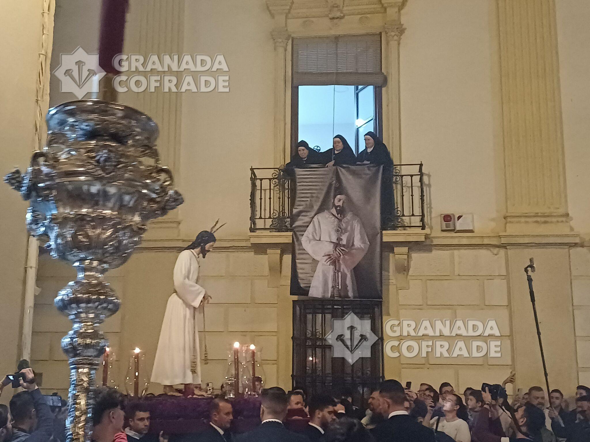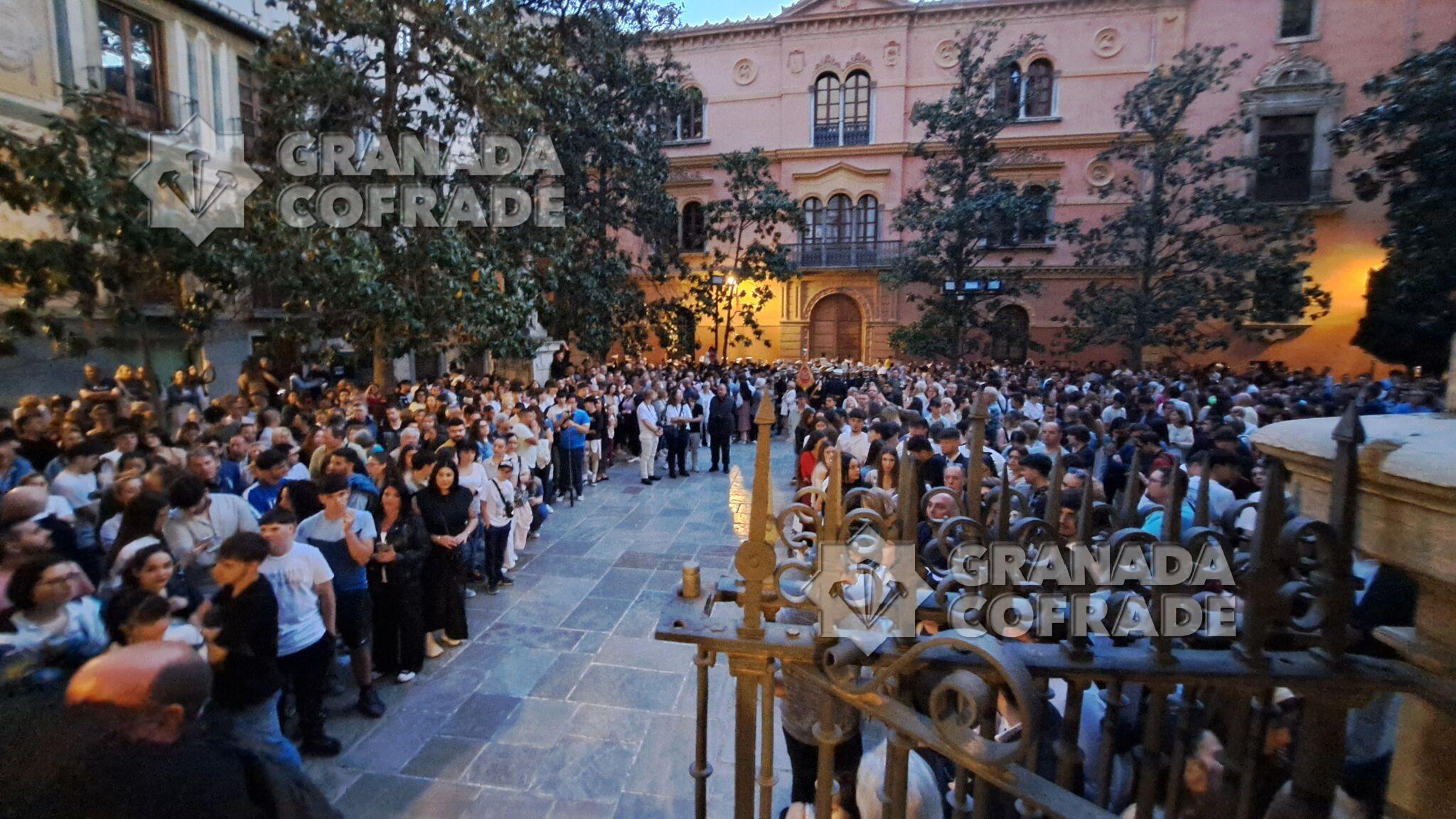 Las andas de María Santísima de la Encarnación cerraban el cortejo que bajó por Marques de Gerona para seguir por Mesones a plaza de la Trinidad, Duquesa, Málaga, Escuelas y plaza de la Universidad. Siguieron por calle San Jerónimo para girar hacia Arandas y Niños Luchando llegando a las once de la noche a su sede canónica, contemplados los Titulares por las monjas Siervas de María, apostadas en los balcones del contiguo templo. Las andas de Jesús Cautivo se adornaban con clavel morado y el de la Virgen de la Encarnación, con clavel en friso y dos jarras frontales, en tonalidad blanca y rosa muy suave.