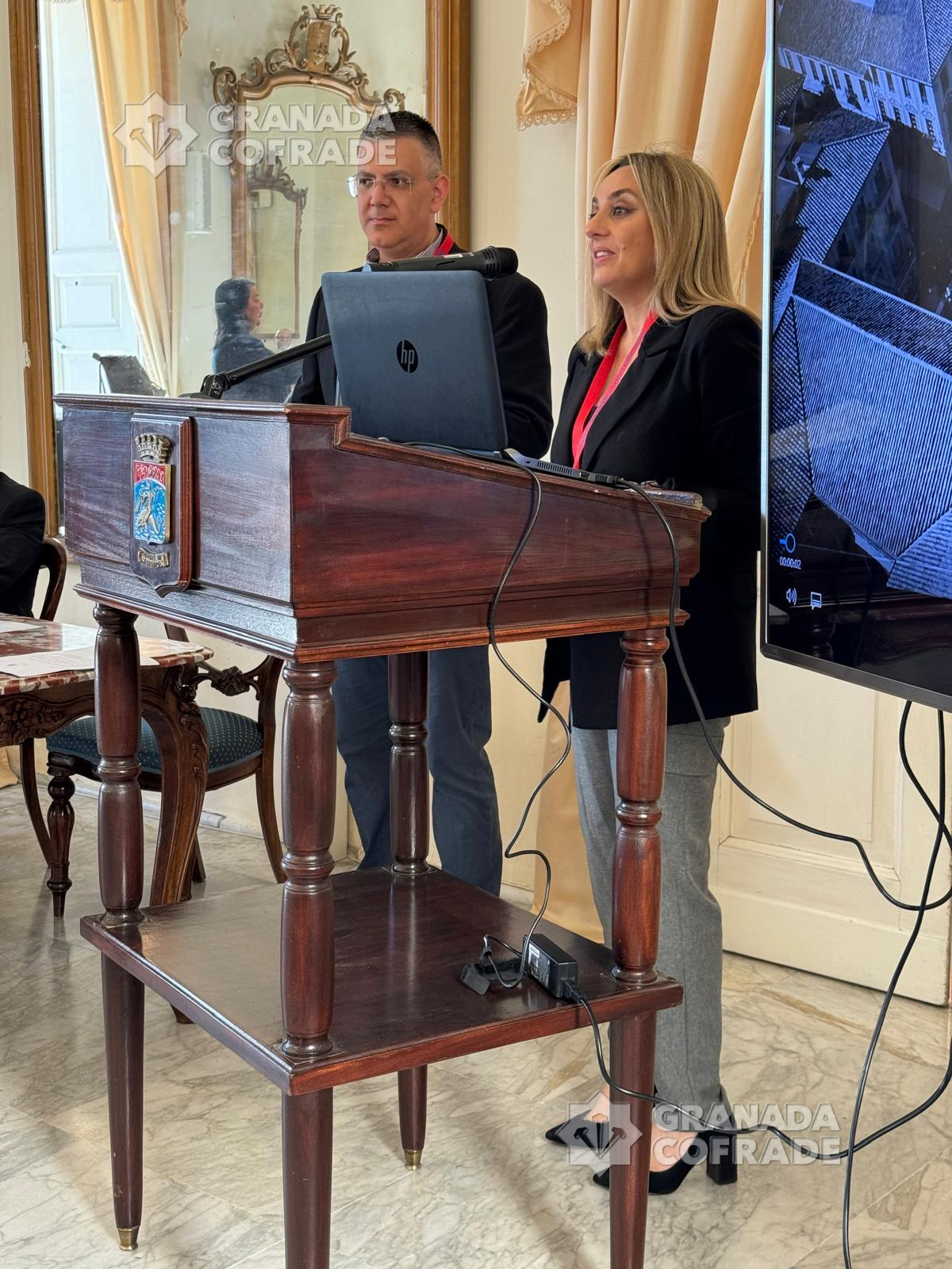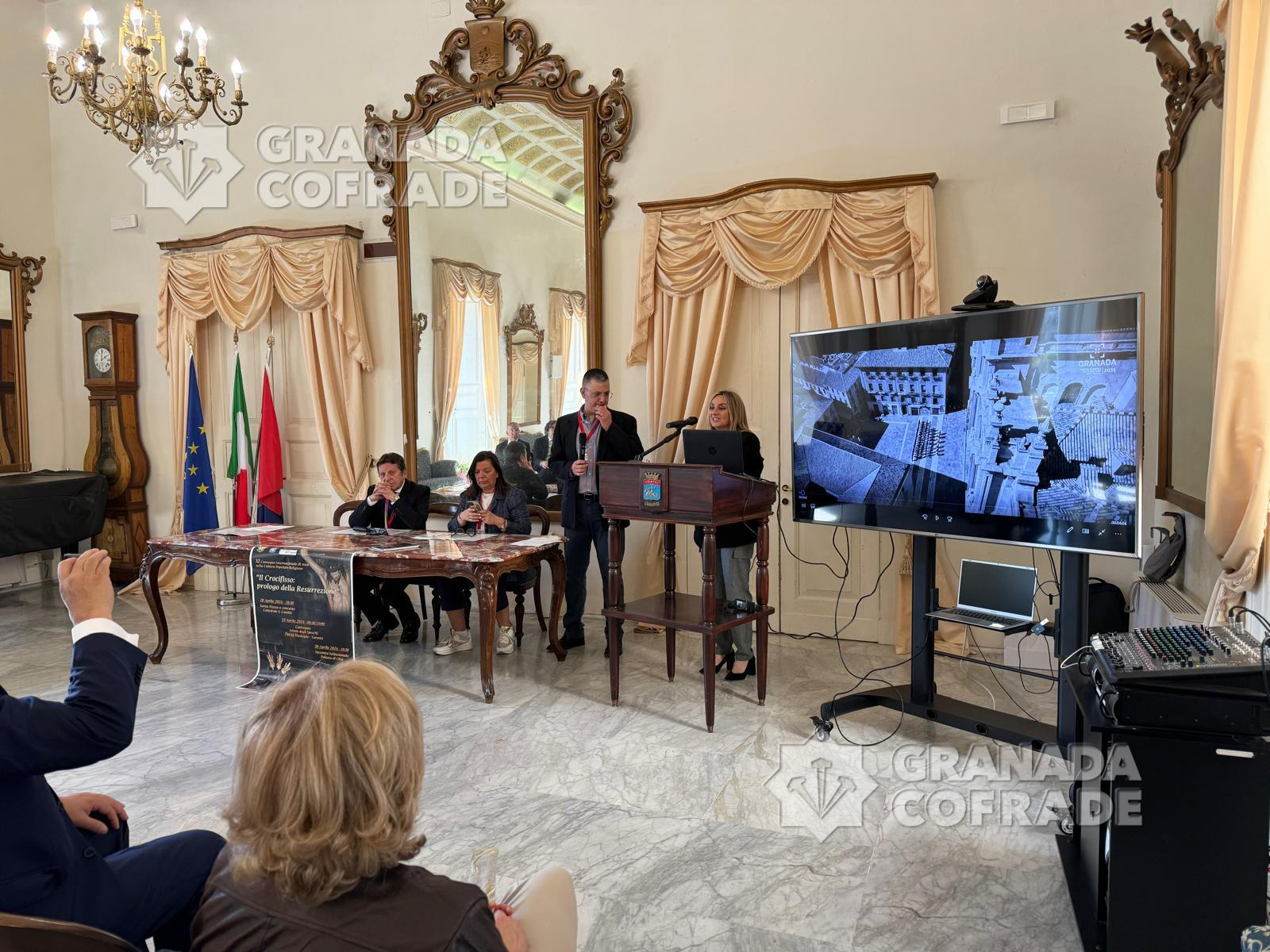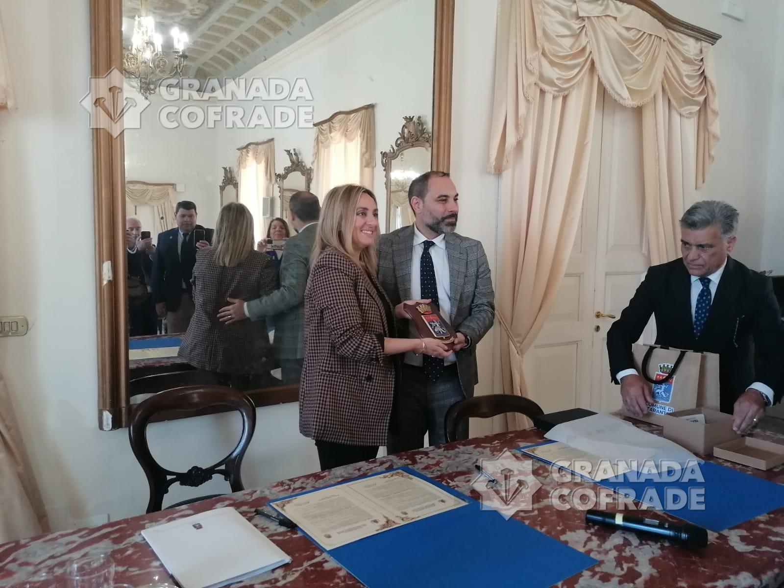 El alcalde de la capital jónica, Rinaldo Melucci, y la primera ciudadana de Granada, Marifran Carazo Villalonga (presente en Taranto como invitada del Congreso Internacional sobre la Cultura Religiosa Popular, organizado por La Veste Rossa di Gigi Montenegro que firmaron el «Pacto de hermanamiento » durante la evocadora ceremonia celebrada en el Salón de los Espejos, en el Palazzo di Città.