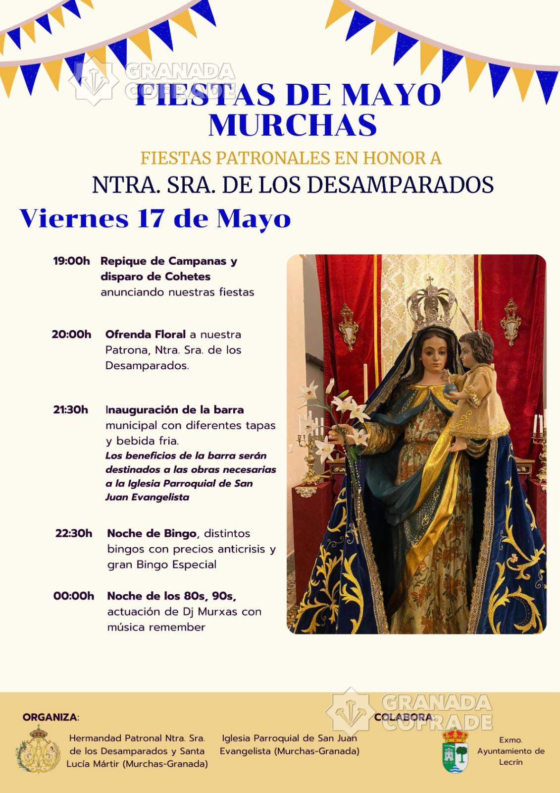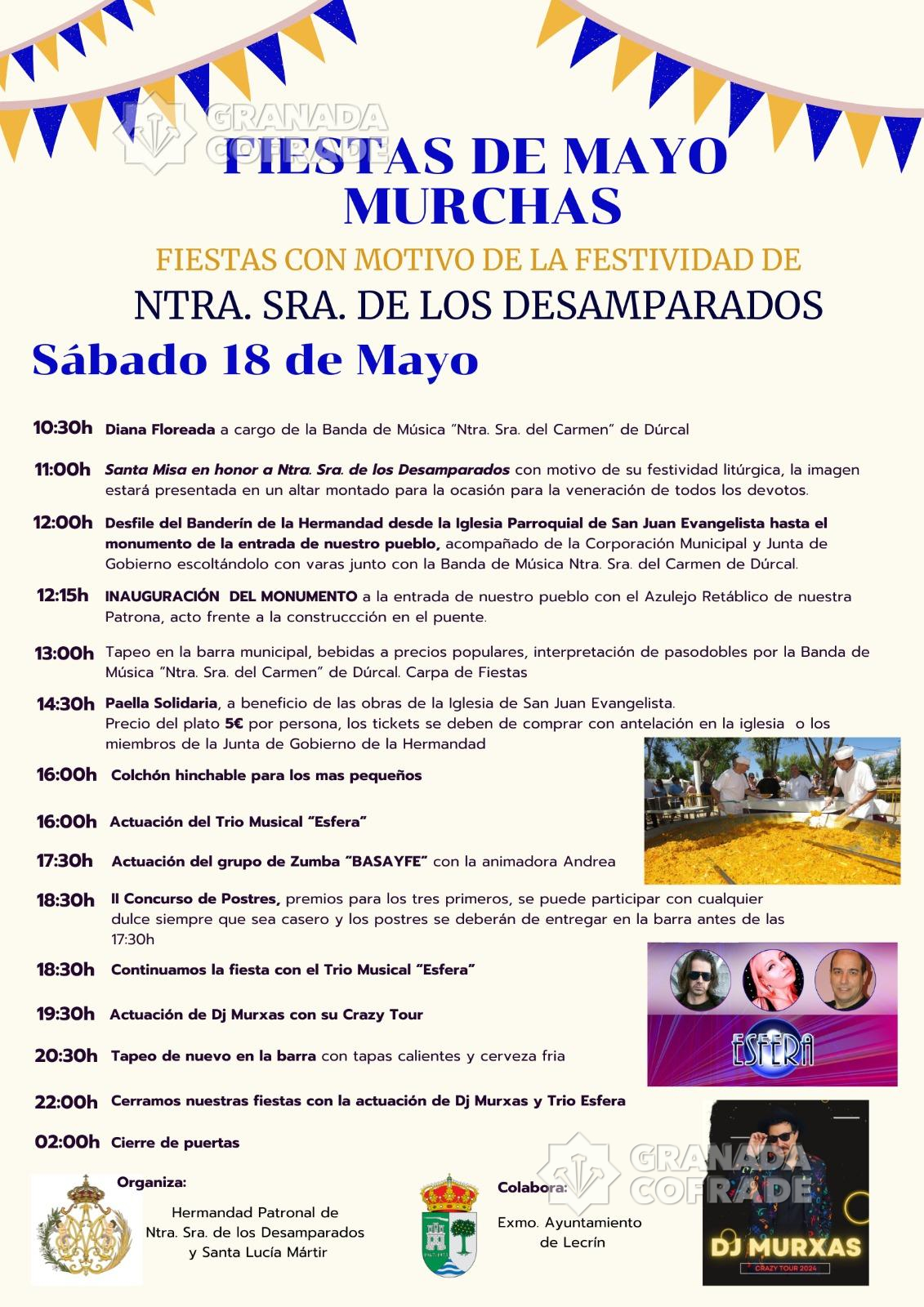 Este acto está marcado dentro de las fiestas de Ntra. Sra. de los Desamparados que celebra el pueblo de Murchas cada mes de mayo. También habrá verbena musical, colchones hinchables, degustación de tapas, paella junto con fuegos artificiales y música.