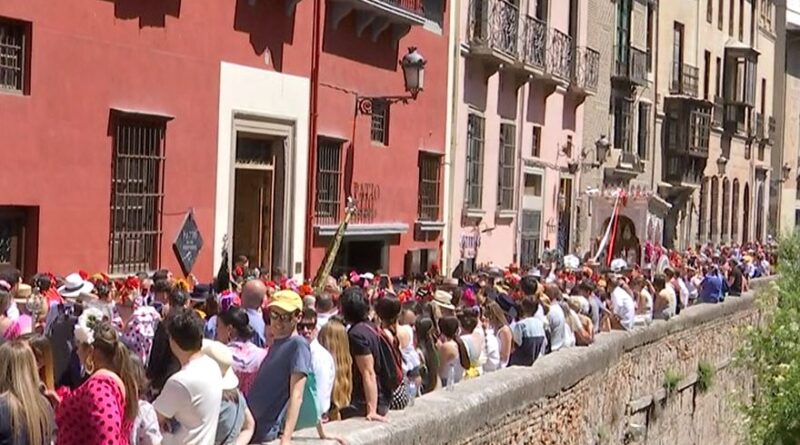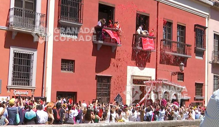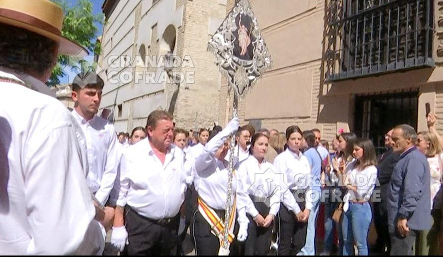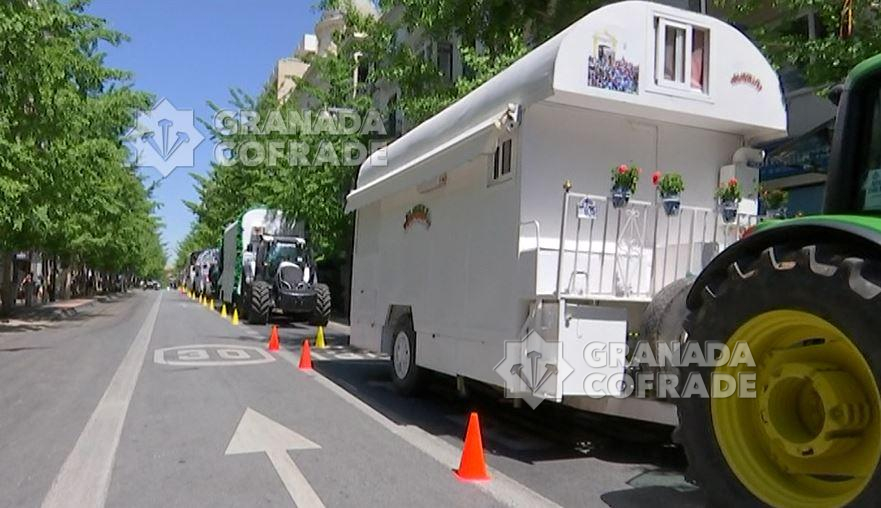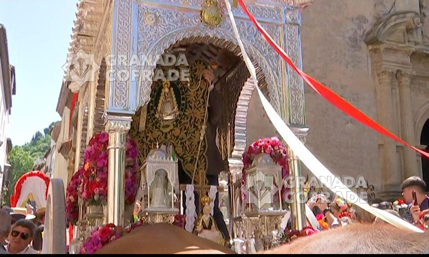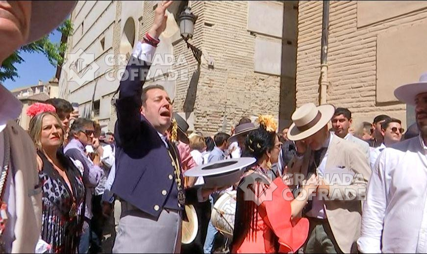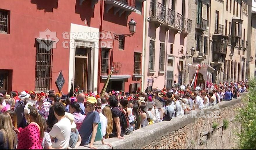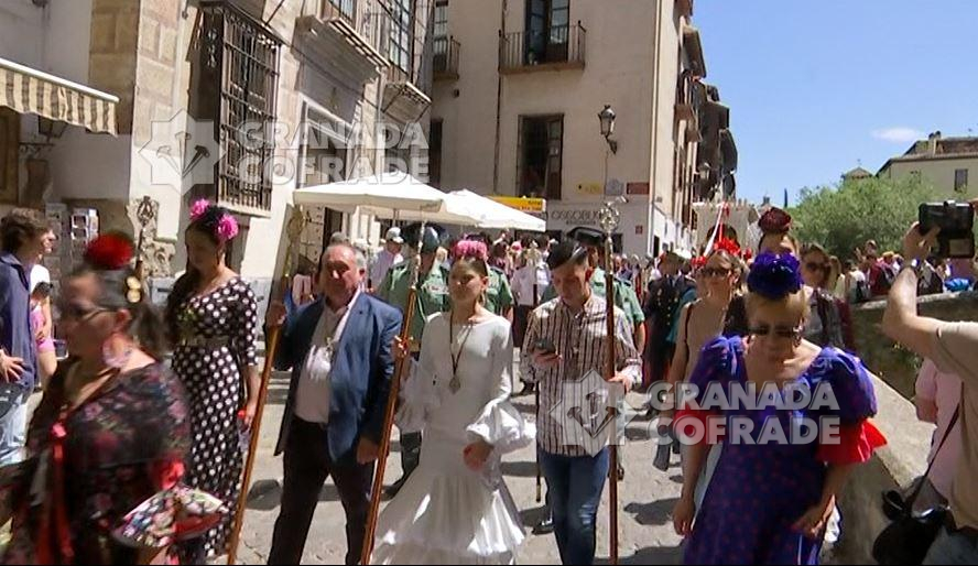 Varios coros rocieros acompañaron musicalmente al Simpecado granadino en una jornada de devoción rociera y alta participación ciudadana donde el colorido y la vistosidad de caballistas, carreta del Simpecado, carreta de acompañamiento de los peregrinos y las carretas que esperaban en Gran Vía, señalaban el ambiente popular de este día de fiesta para la ciudad. El Simpecado recibió también «petalás» de homenaje en la Carrera del Darro y en otros puntos del recorrido. Plaza de Santa Ana, Plaza Nueva y Reyes Católicos se llenaron de público para participar de los primeros metros de la romería y se detuvo en el Ayuntamiento para recibir un ramo de flores y homenaje al Simpecado. Después, continuó el cortejo hasta la basílica de Nuestra Señora de las Angustias donde fueron recibidos por la hermandad patronal y donde se cantó la salve rociera ante las dos devociones.