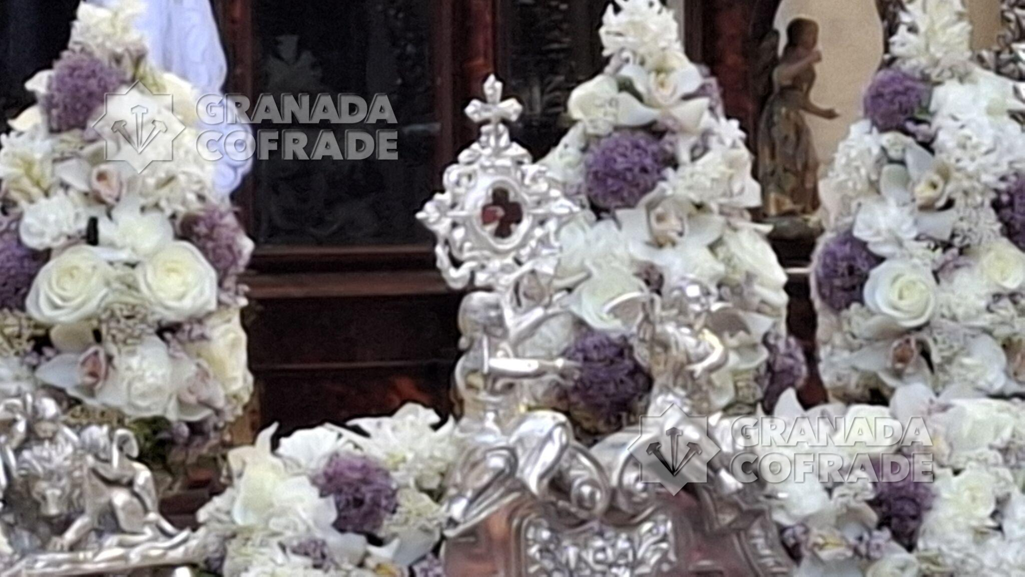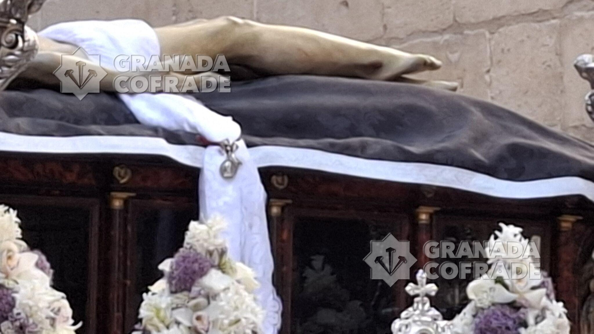 La imagen de la Virgen de la Soledad en el Calvario, obra de José de Mora, se había dispuesto sobre la peana de la Virgen de la Merced, en sentido inverso, y delante la urna del Señor Yacente en posición transversal para sustentar la imagen del Señor del Santo Sepulcro. Una imagen inédita de ambos Titulares unidos en un mismo paso, que se remataba con la primitiva cruz de la Virgen de la Soledad y escaleras traseras. El adorno se había dispuesto en colores blanco y morado principalmente, con rosas y orquídeas entre una variedad amplia de especies florales. La imagen del Señor, lucía pendiendo del sudario de tejido, la medalla de la hermandad, donación de las camareras de la cofradía. A los pies del grupo se había dispuesto un relicario con reliquia del Santo Sepulcro de Jerusalén.